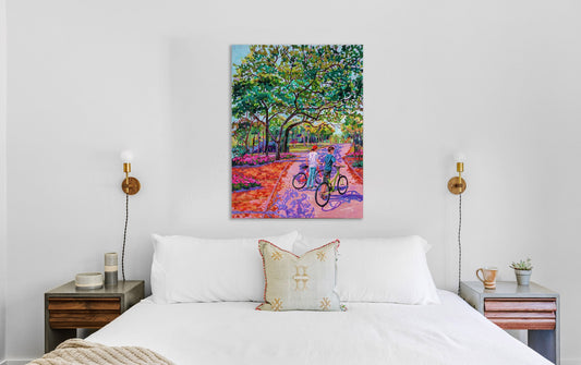 Paintings are inspired by real places. Colors are saturated, vibrant, amplifying the moment's perfection.