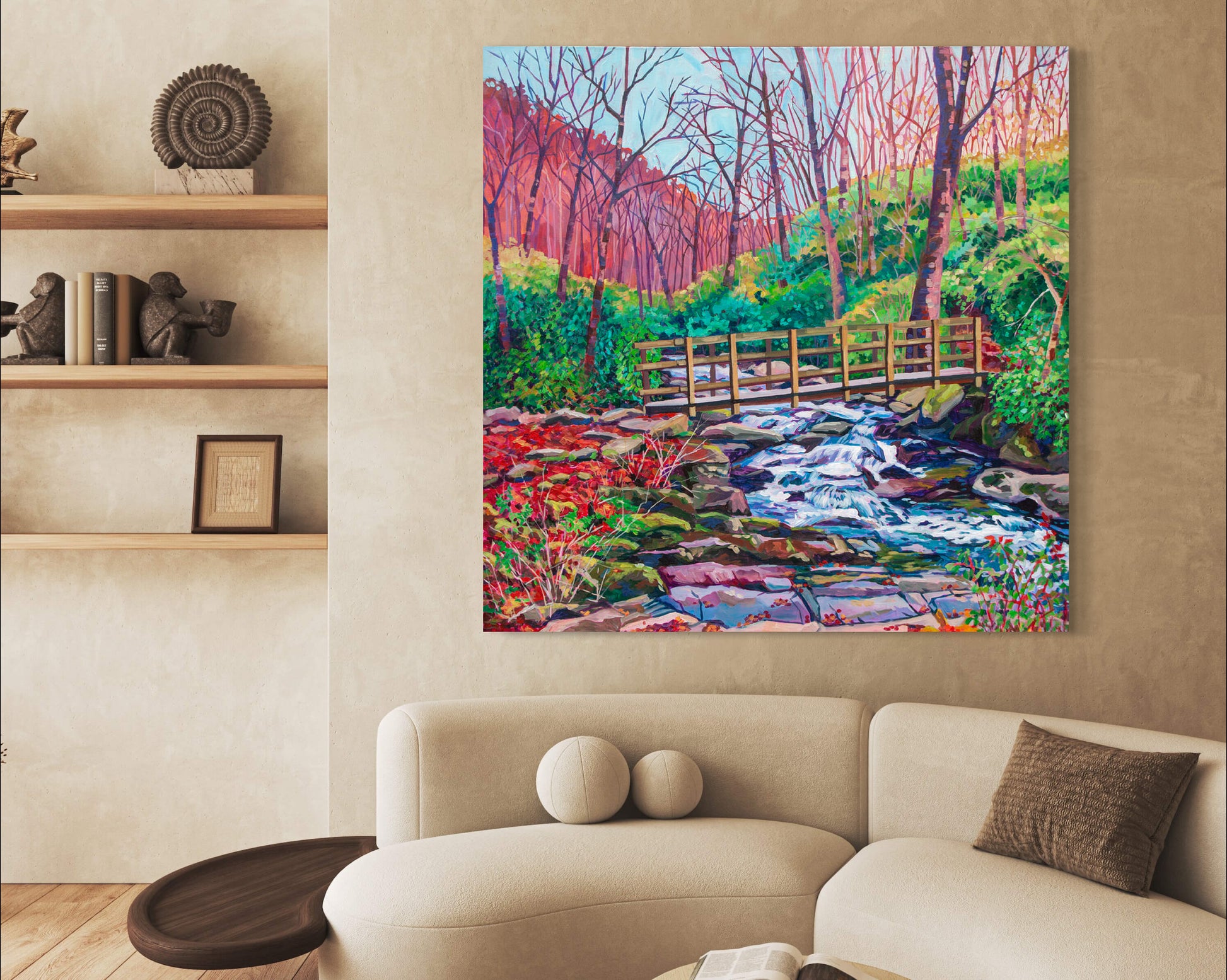 This vibrant painting, measuring 48x48 inches, captures the breathtaking beauty of the Smoky Mountains in the Fall. The canvas showcases a landscape where bright leaves carpet the ground and the crisp air beckons adventure. Inspired by the trail leading up to Chimney Tops in Smoky Mountain National Park, this sizable artwork brings the rich colors and serene atmosphere of the season to life. Due to its size, special shipping arrangements are required to ensure safe delivery.