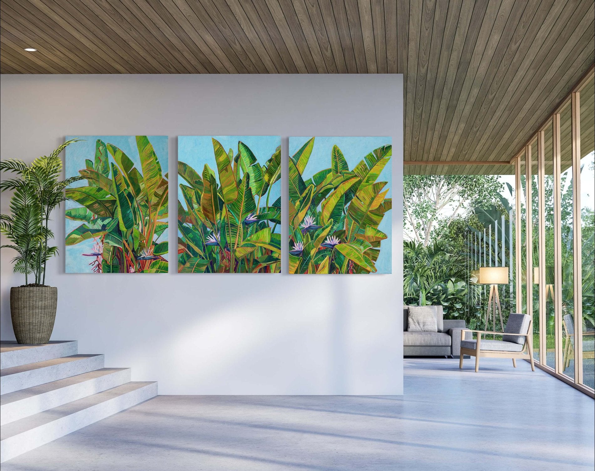 This is three 30x40 vibrant paintings together measuring 90” across featuring the majestic Giant White Bird of Paradise plant. The sun illuminates the leaves, making them glow, while the shadows add depth and intrigue. The painting’s brilliant shades of green and yellow infuse any room with a lush tropical vibe.