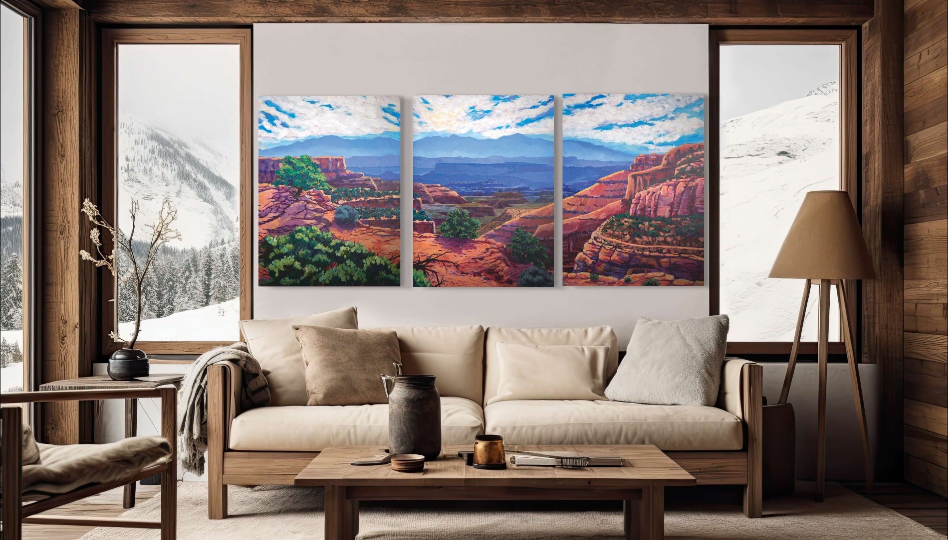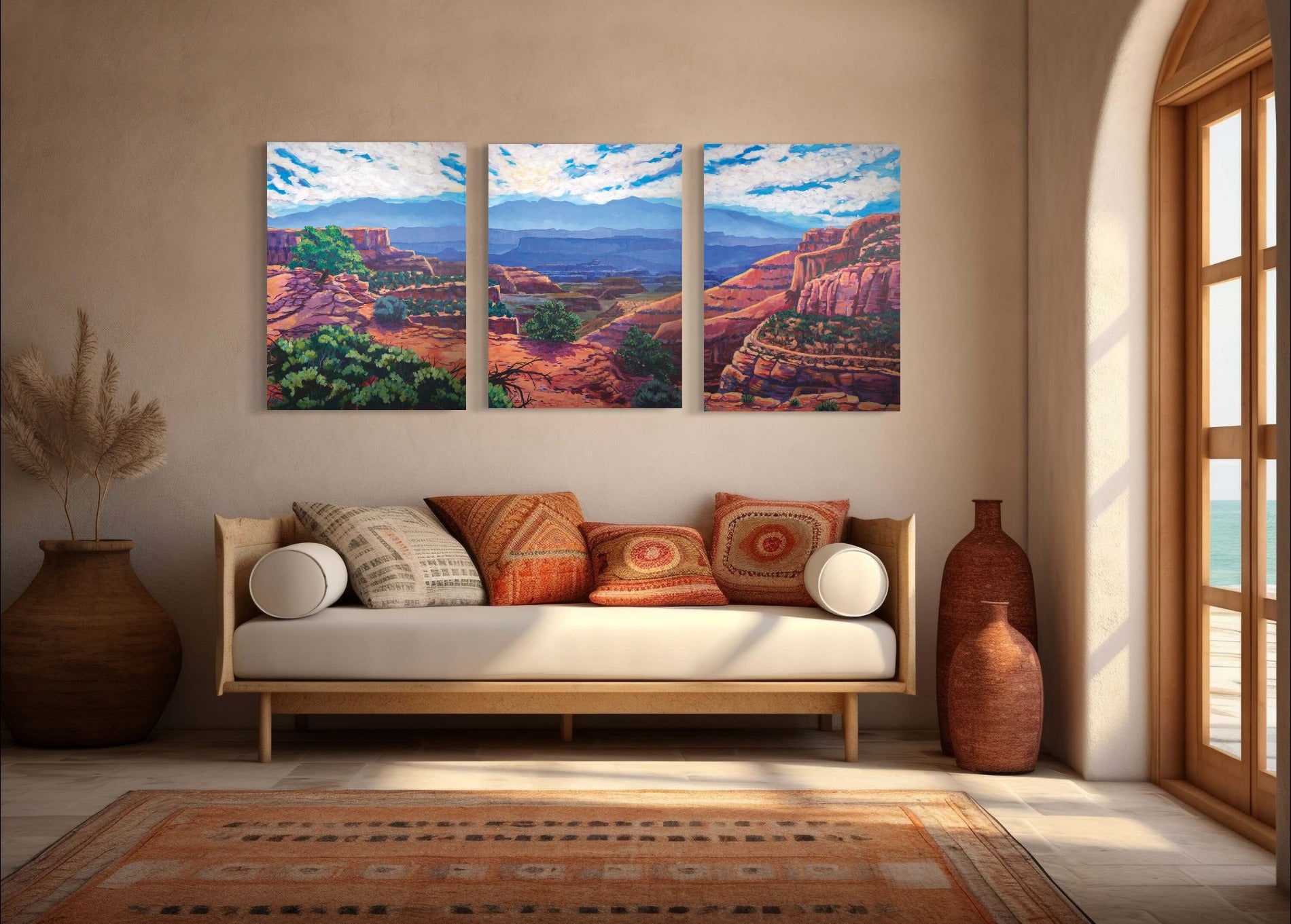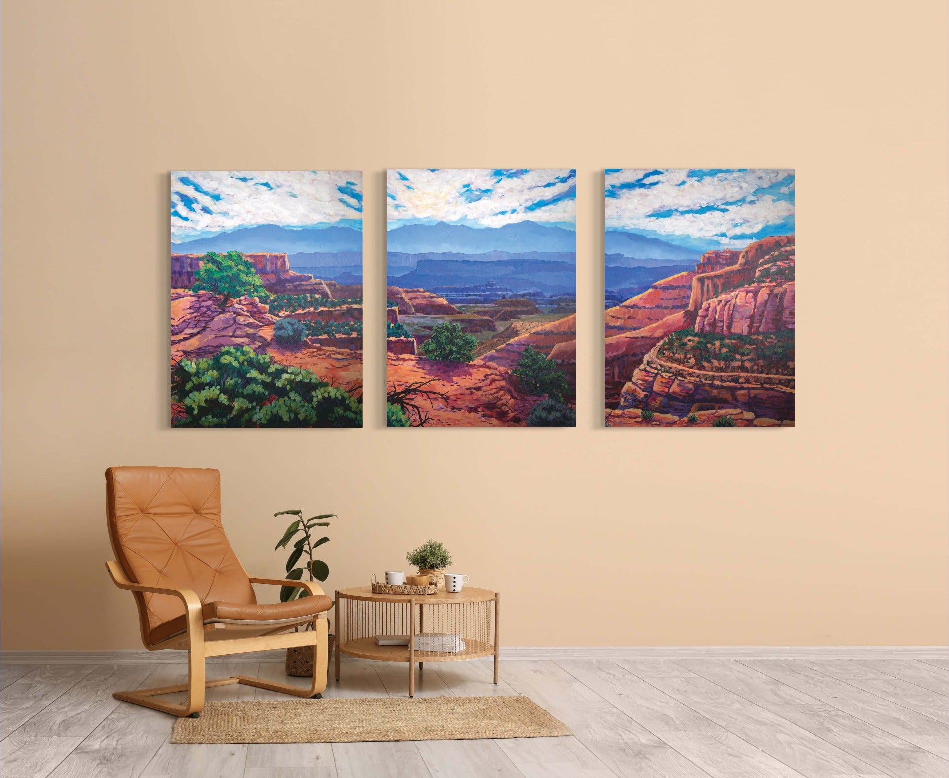 This acrylic painting, spanning three 30x40-inch wrapped canvases for a total width of 90 inches, showcases a stunning view from Island in the Sky in Canyonlands National Park near Moab, Utah. The artwork features bright colors and loose impressionistic brush strokes to capture the dramatic landscape. The blue La Sal Mountains form a serene backdrop against the vibrant red rock of the canyon, creating a striking contrast that highlights the park's rugged beauty and expansive vistas.