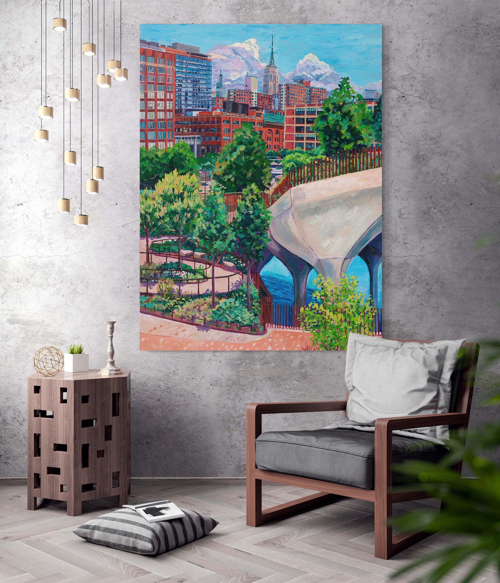 Acrylic paint, glossy varnish, gallery-wrapped canvas, and wire so ready for hanging.