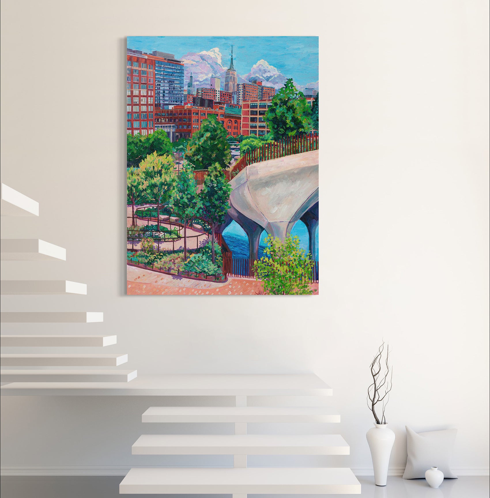 This original acrylic painting is presented on a 1.5” gallery-wrapped canvas, where the artwork extends seamlessly onto the edges. The canvas has been varnished to ensure protection and longevity. May use a dry or clean damp rag to dust. It comes equipped with a wire on the back, making it convenient and effortless to hang right away. Please note, frame not included.