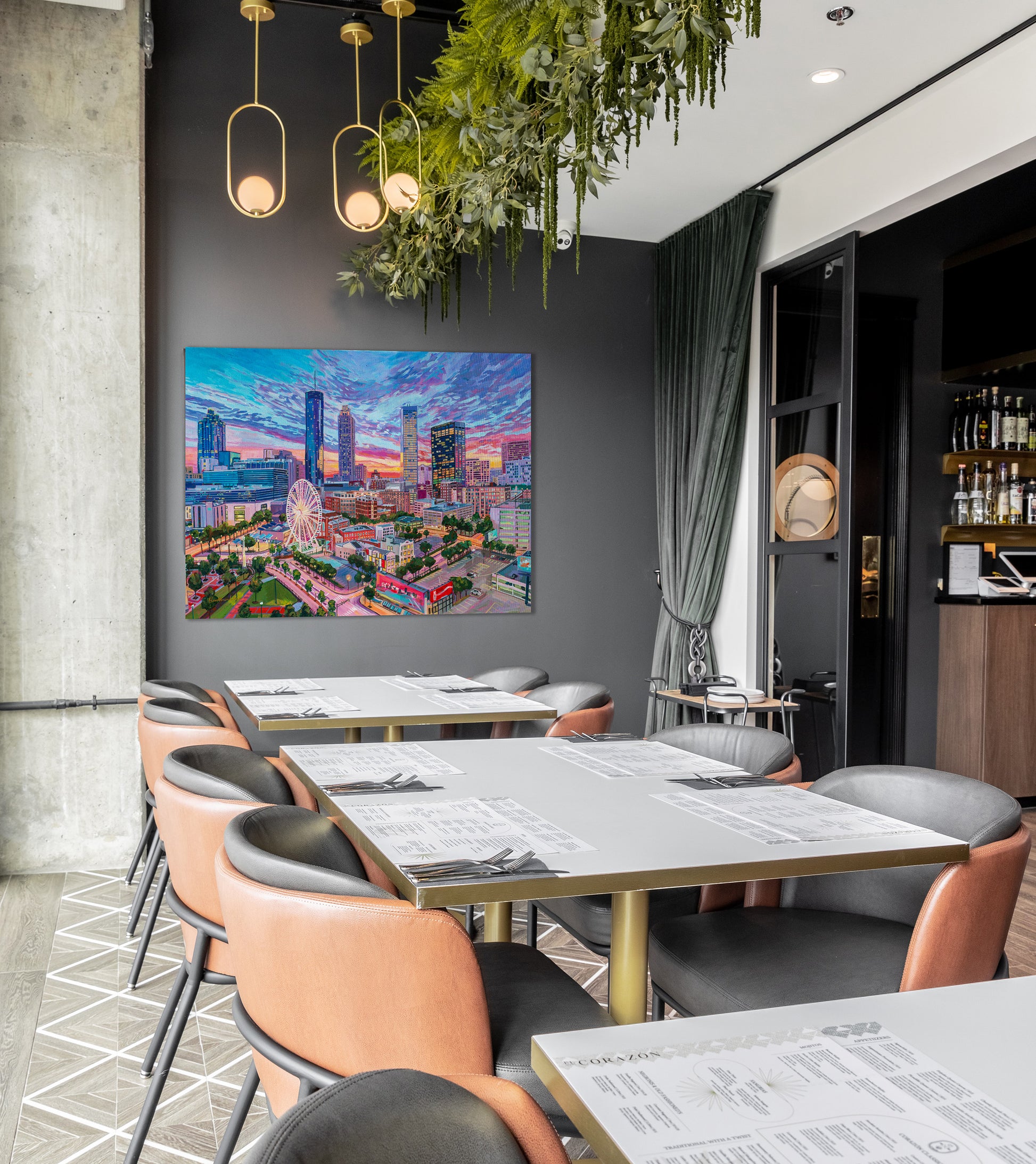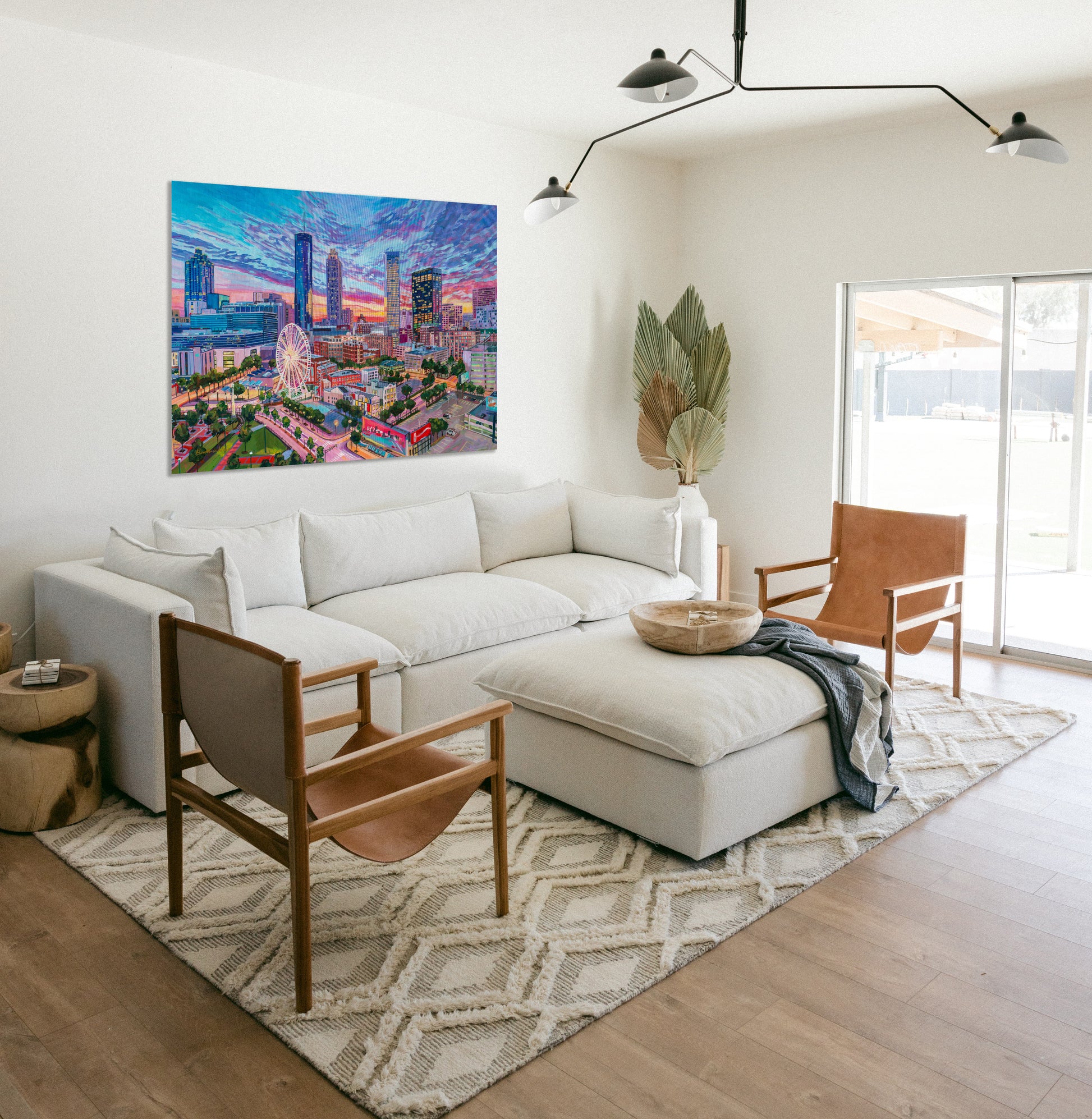 At sunset, the vibrant Atlanta skyline comes alive, illuminated by the warm glow of the setting sun. Dominating the scene is the Skyview Atlanta Ferris Wheel, its colorful lights adding to the spectacle. The sky itself is a canvas of pink, purple, and blue hues, casting a serene backdrop that complements the cityscape. These colors reflect off the glass facades of the surrounding high-rise buildings, infusing the urban atmosphere with a lively and dynamic energy. The combination of modern architecture and natural light creates a captivating contrast, making Atlanta's skyline at sunset a breathtaking sight to behold. (Special thanks to Adobe stock image 193697077 Extended license for inspiration.)
