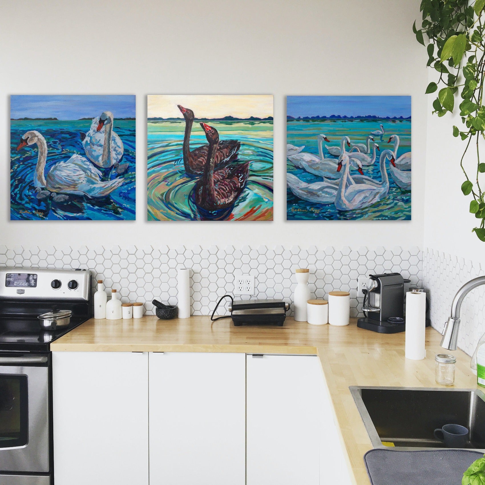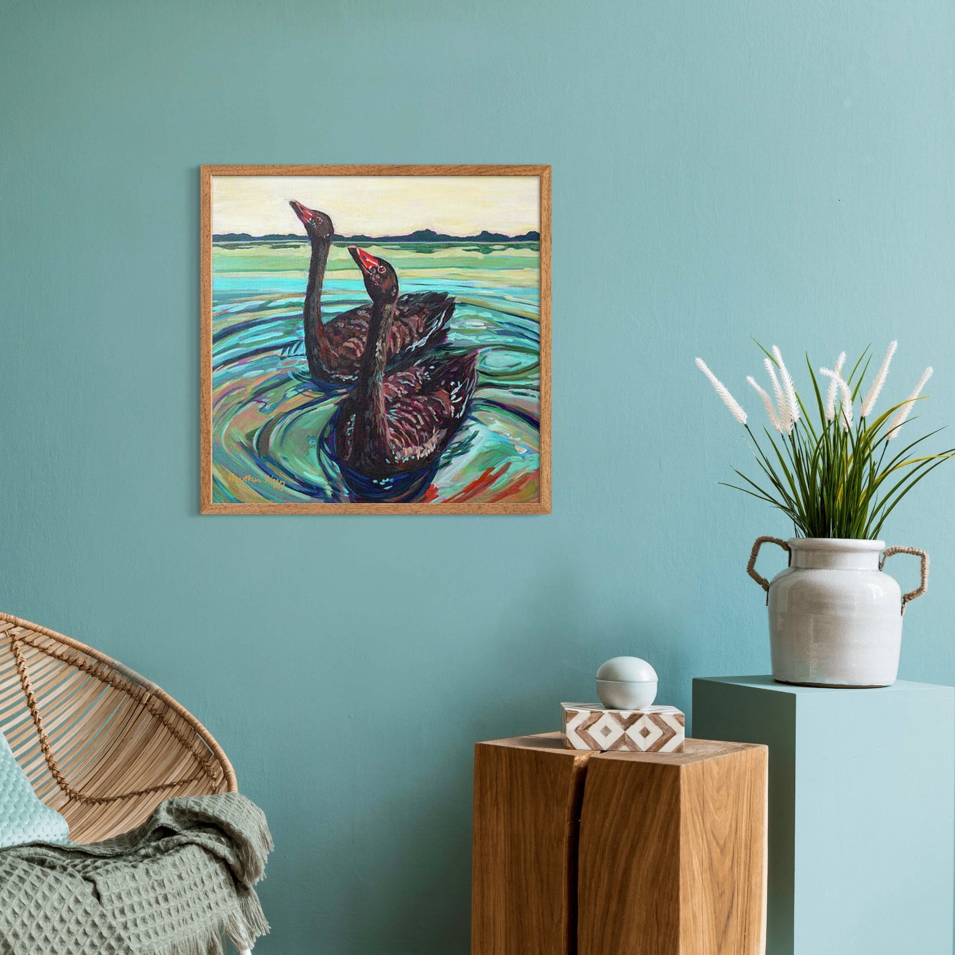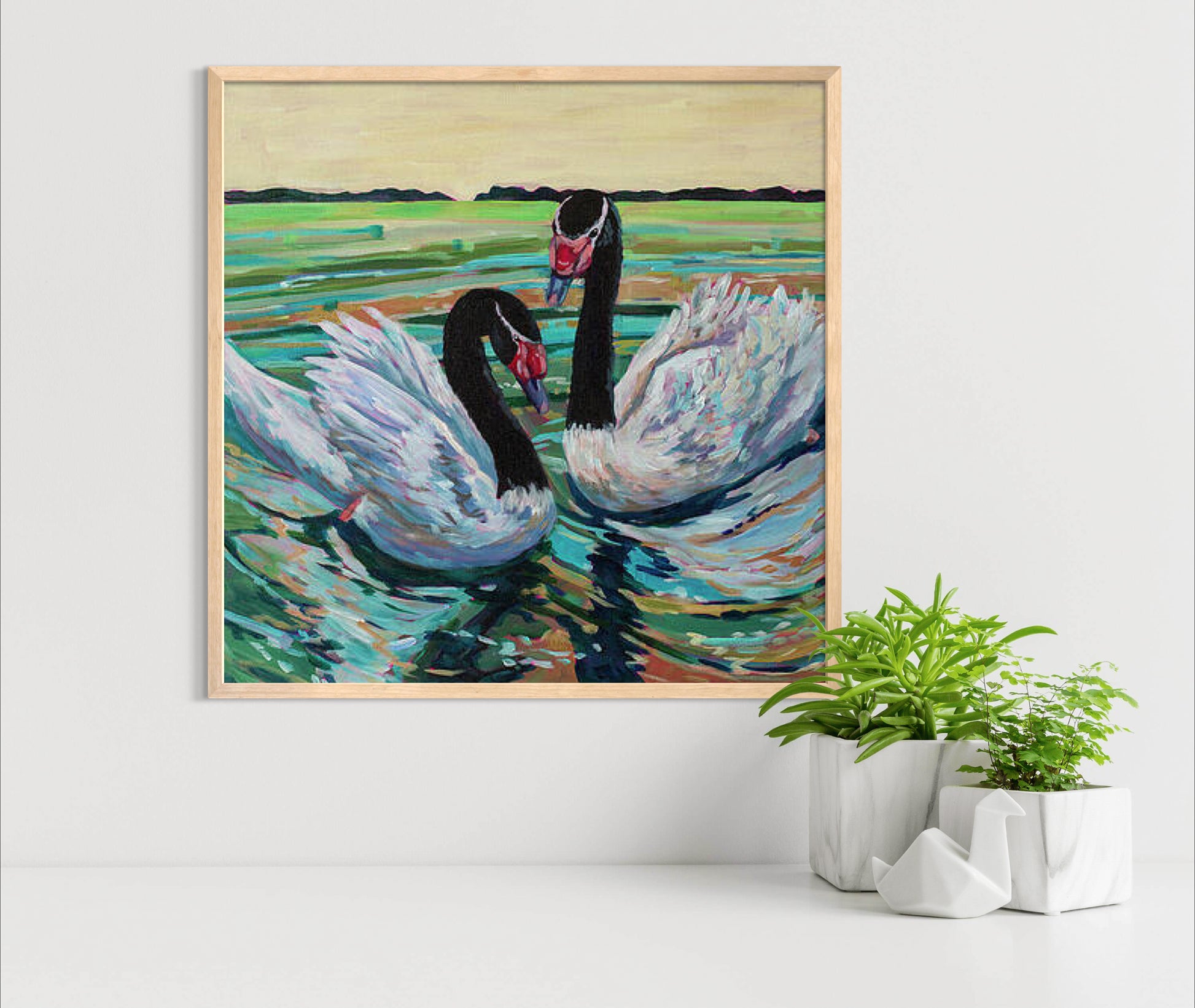 This original acrylic painting, set on a 20x20-inch gallery-wrapped canvas, features two black swans gracefully floating on the water’s surface. They appear to be engaged in a courtship display or synchronized swimming, set against a backdrop of vibrant, swirling water and a tranquil landscape in the distance. The dynamic yet serene scene captures the elegance and harmony of these magnificent birds.