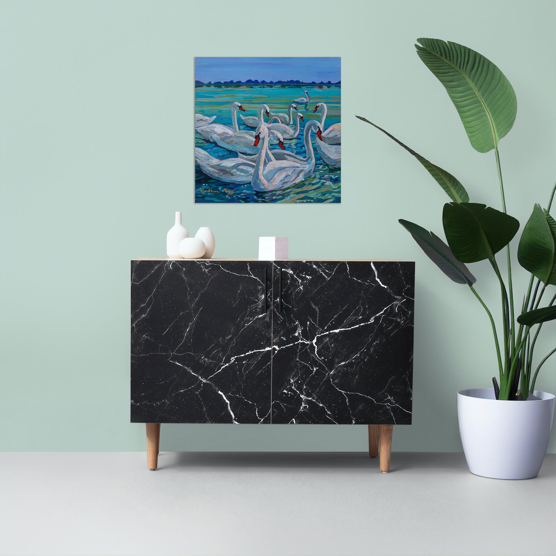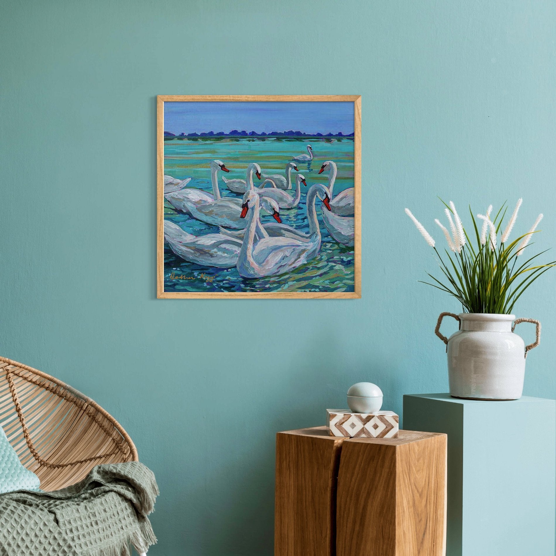 This original acrylic painting is rendered on a 20x20-inch gallery-wrapped canvas. It features a flock of swans gliding gracefully across the water’s surface beneath a pale blue sky, with a hint of distant greenery in the background. The swans' white feathers and the tranquil water evoke a sense of serenity, while their reflections subtly shimmer, enhancing the peaceful ambiance of the scene.