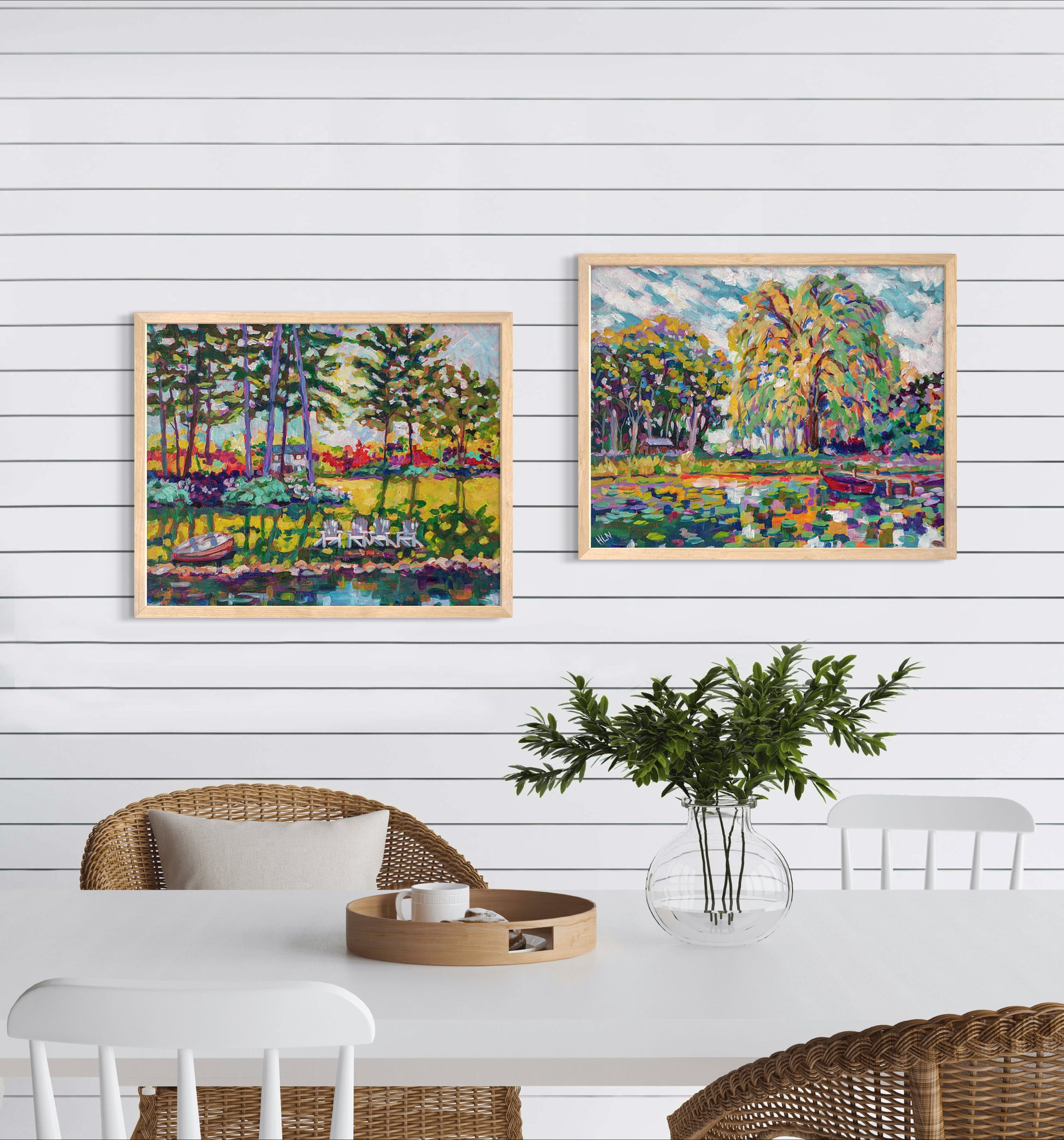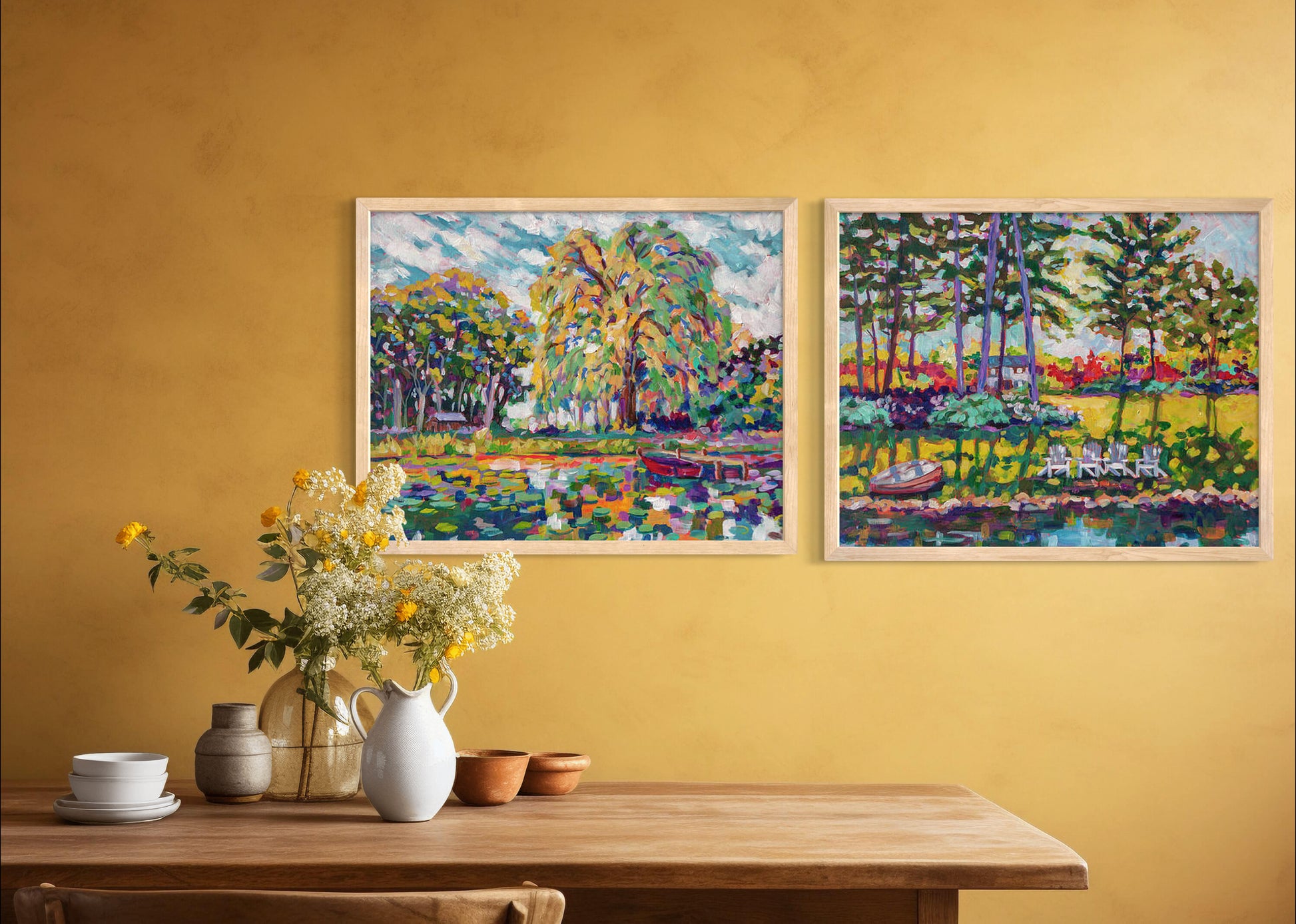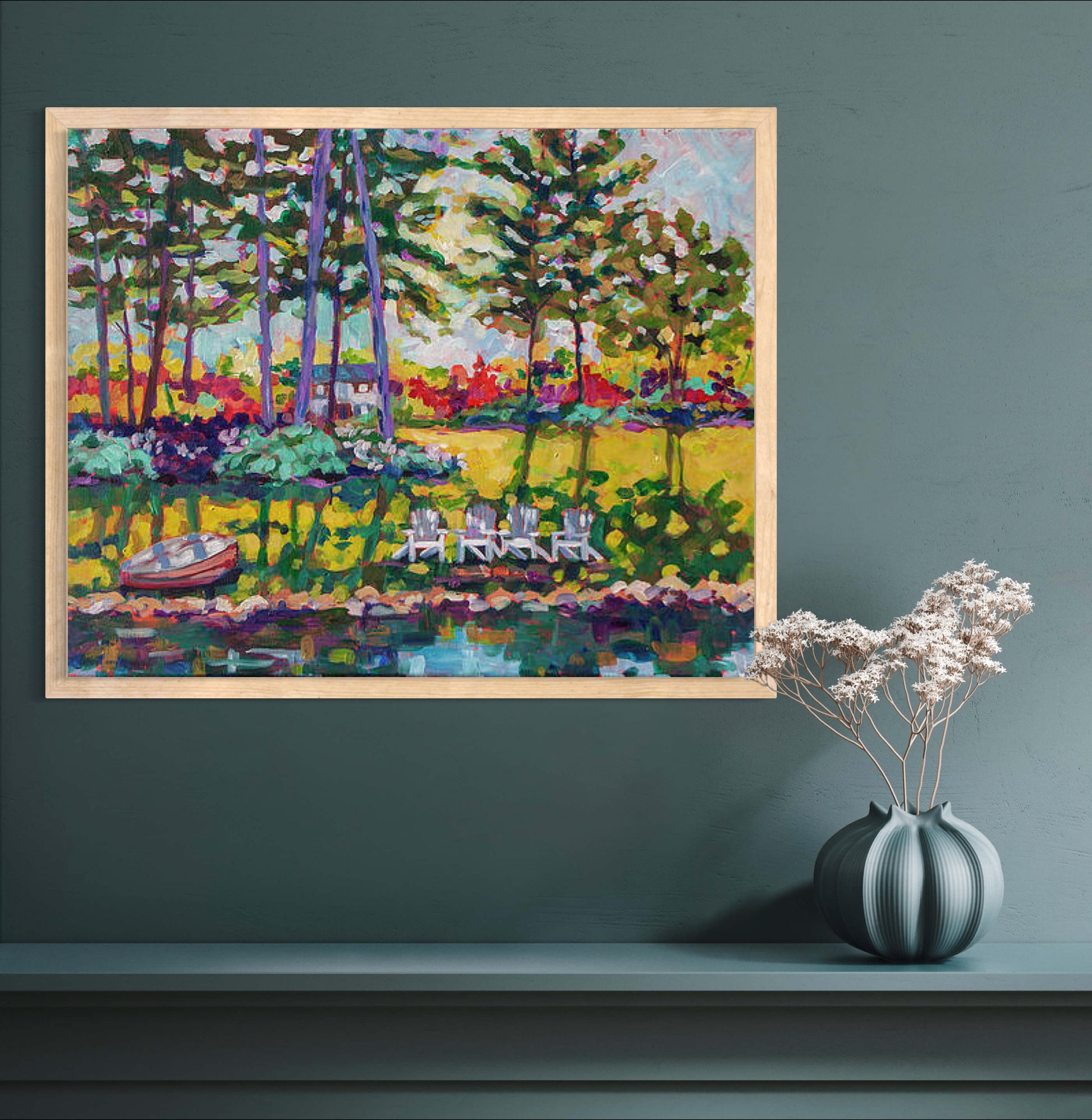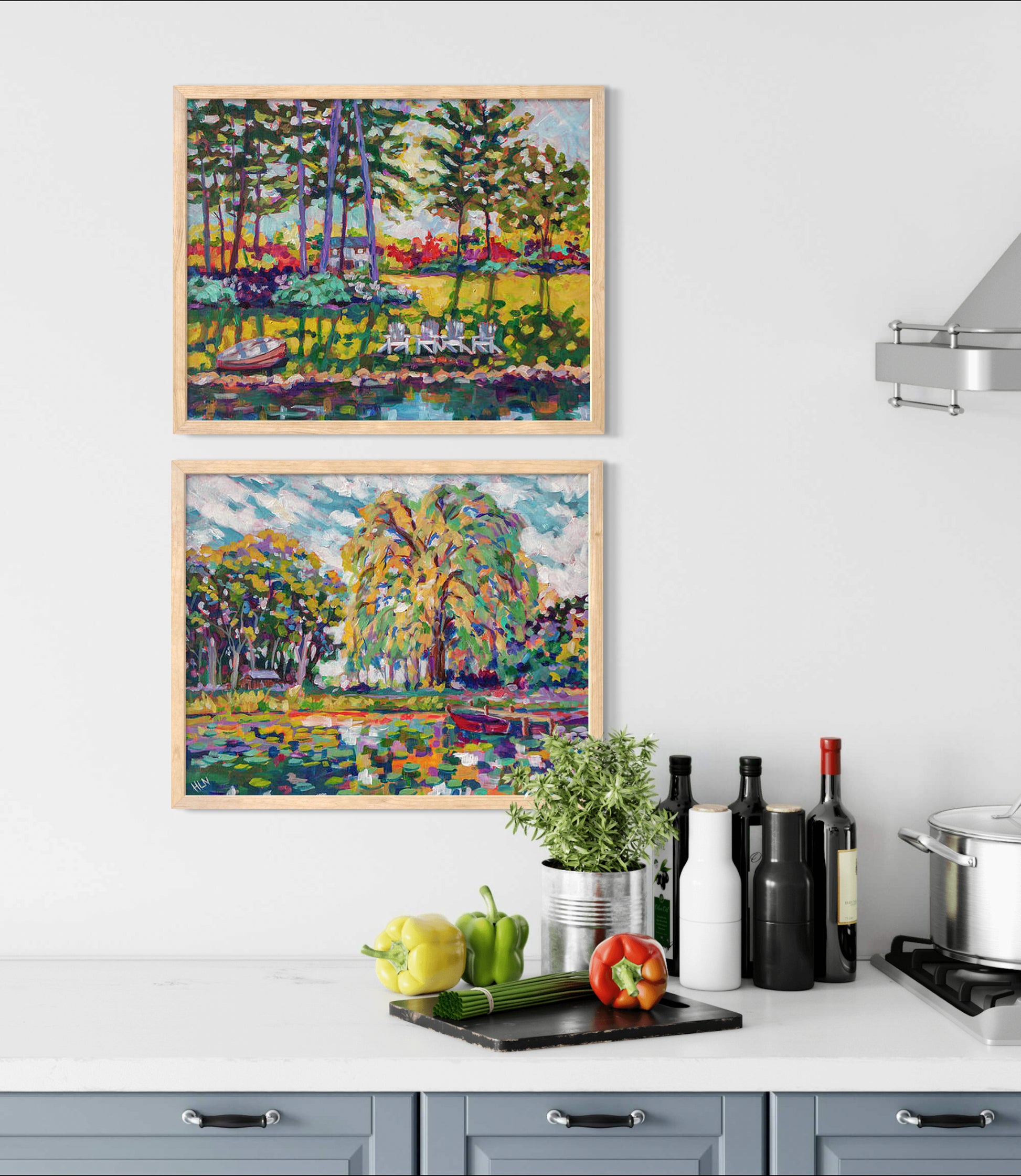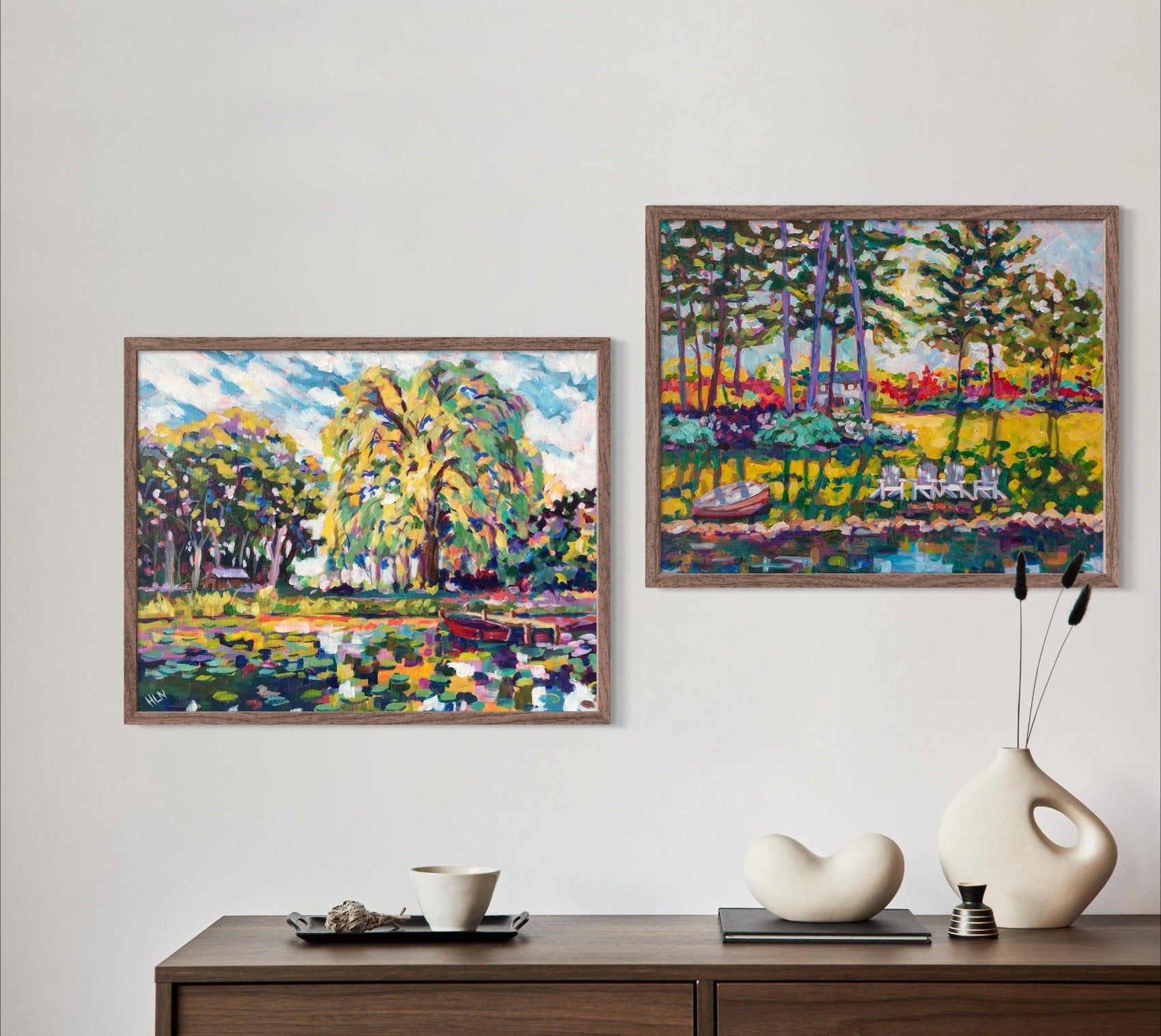 This original painting, measuring 16x20 inches, bursts with vibrant colors and expressive impressionistic brush strokes that bring the scene to life. It depicts a weeping willow catching the early morning light beside a rural lakeside, inspired by a summer spent in Michigan. The painting serves as a reminder to slow down and appreciate the familiar scenes and intricate details in our surroundings.