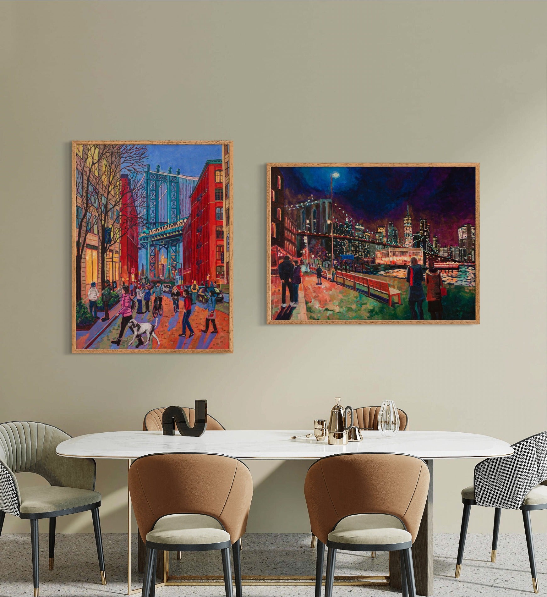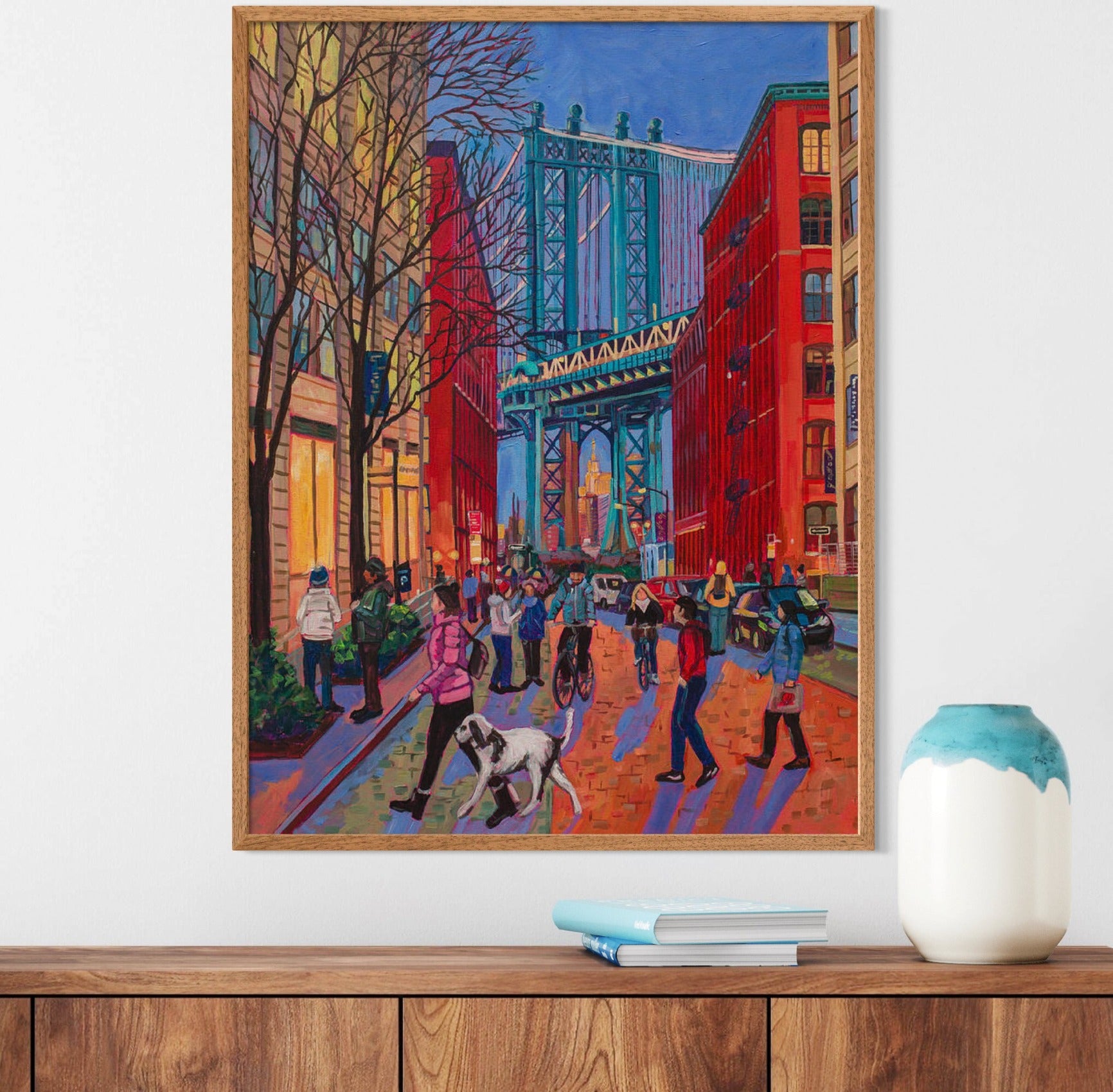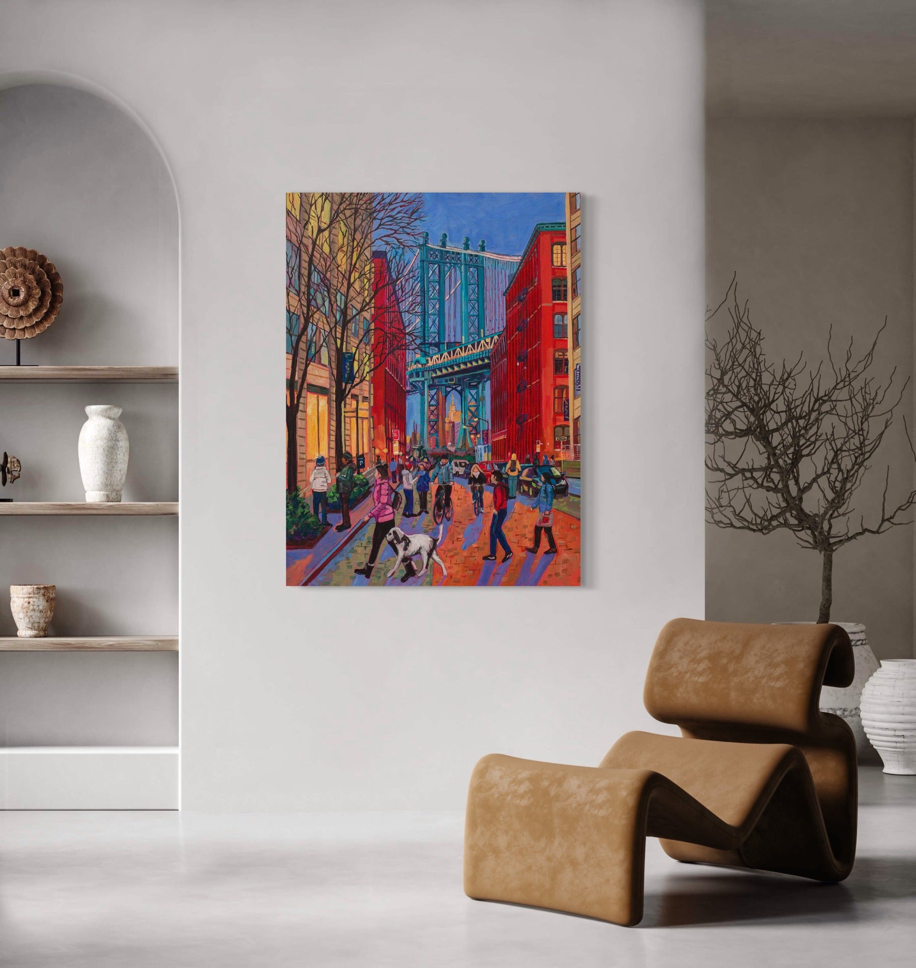 This original painting, measuring 30x40 inches, depicts the iconic scene in the DUMBO area of Brooklyn, where the Manhattan Bridge towers between the buildings and frames the Empire State Building in the distance. The bustling street scene captures the vibrant energy of the area, with people pausing to snap the perfect Instagram post while others go about their busy day. This artwork beautifully encapsulates the dynamic urban landscape and architectural grandeur of this famed New York neighborhood.