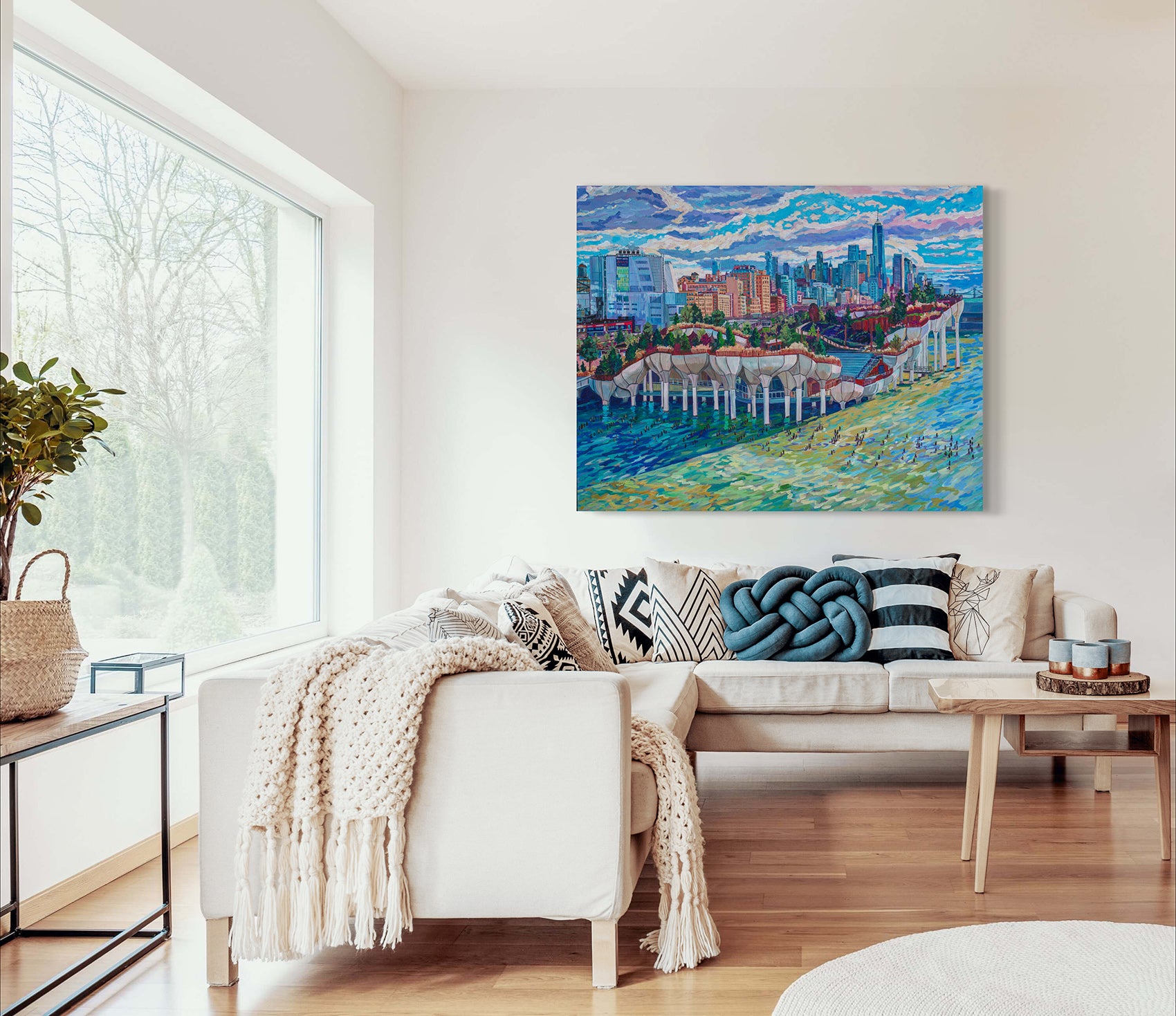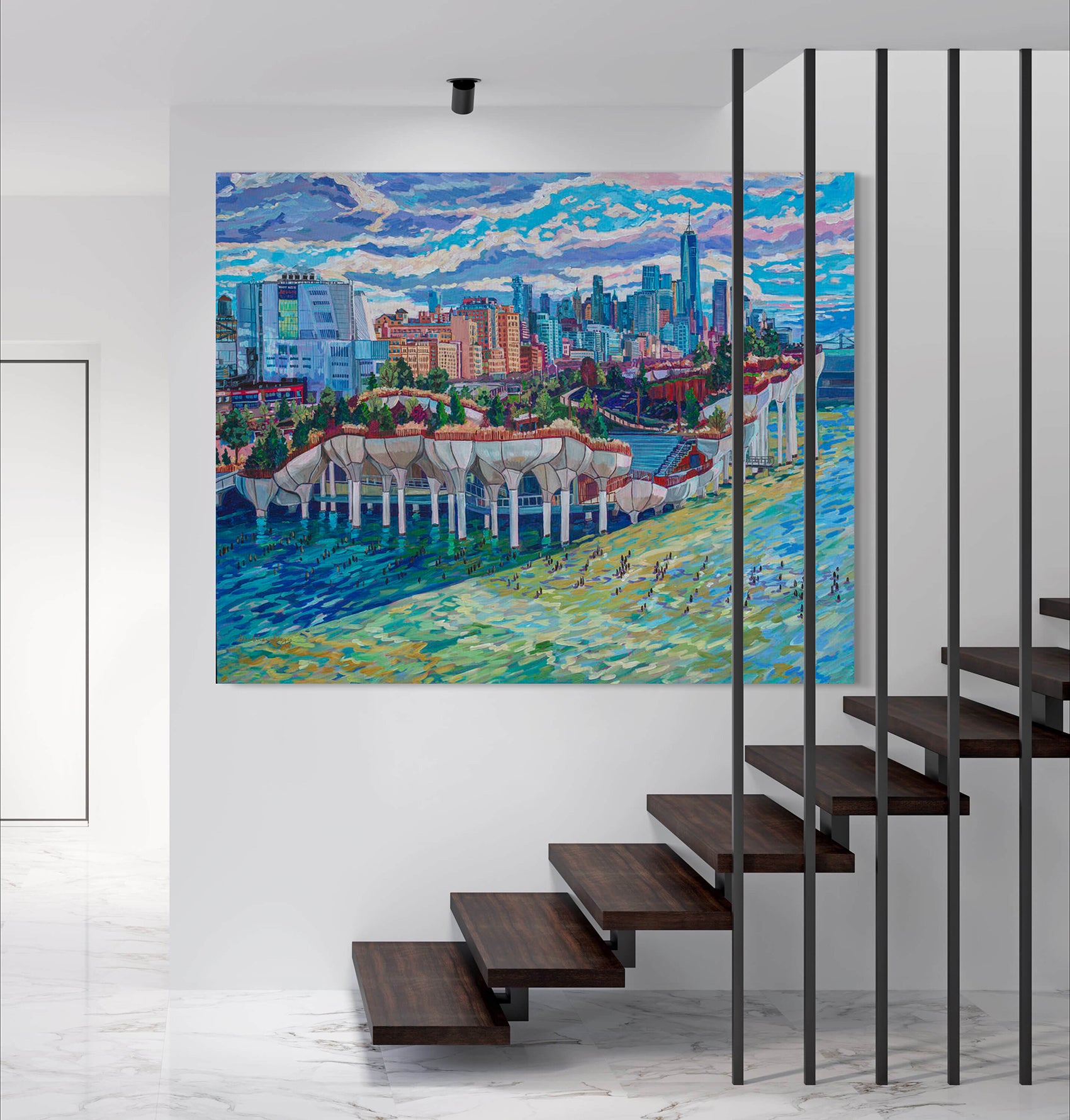 The futuristic foundation structures that comprise Little Island Pier in the Hudson River near Chelsea stand in striking contrast to the towering high-rise buildings of downtown Manhattan, resembling tulips blooming amidst a concrete jungle or stiletto shoes poised elegantly against the skyline. This unique architectural design makes Little Island a must-see spot in New York City. This scene is captured in an oversized painting, measuring 60x48 inches, which requires special handling for shipping and cannot be transported with standard carriers. Pick-up is available in Orlando, and delivery can be arranged for locations within an hour of zip code 32832. If interested, please contact me before purchasing to discuss delivery or pick-up options.