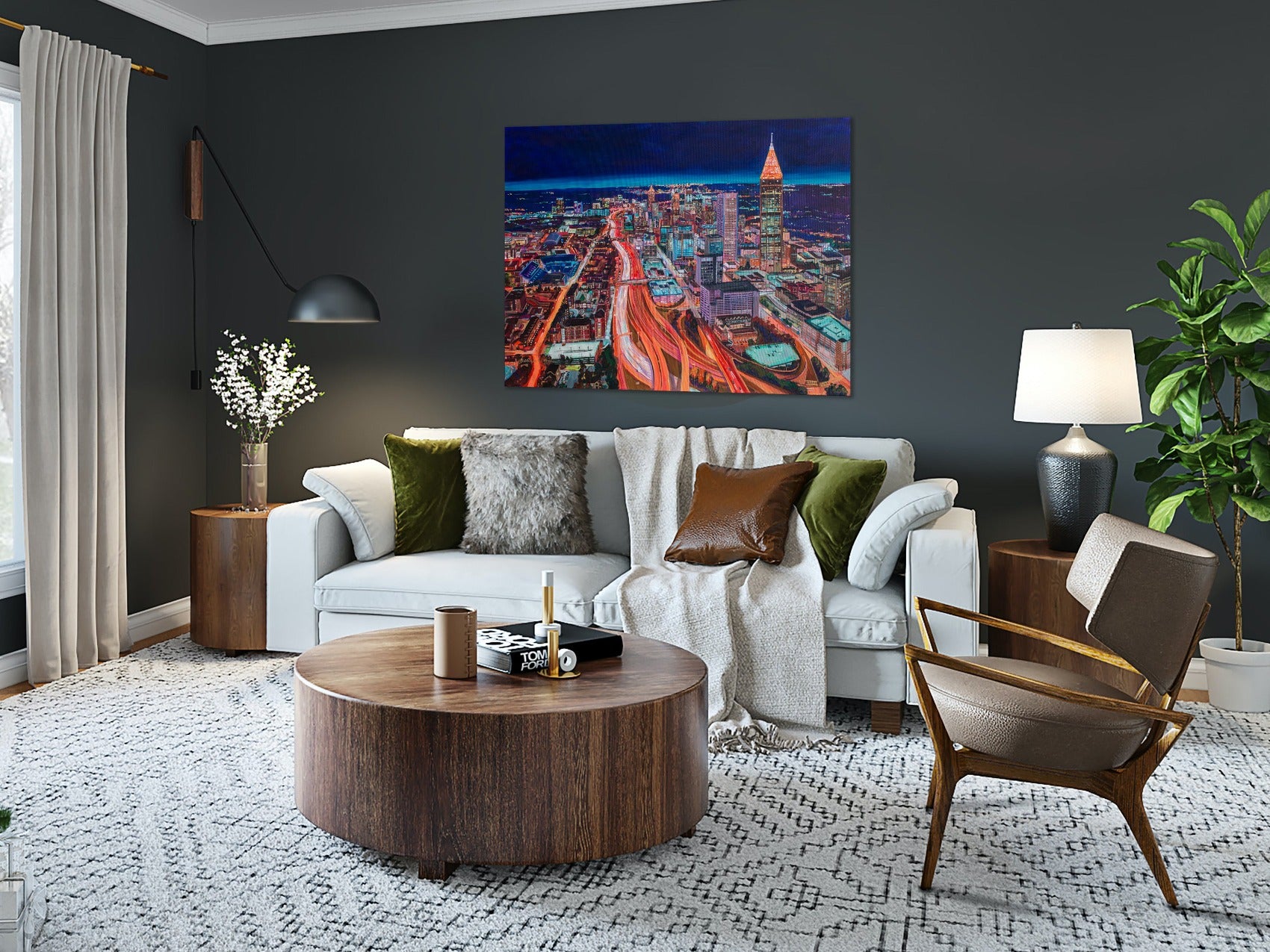 As dusk settles over Atlanta, the cityscape comes alive with vibrant energy. Bright streaks of light trace the bustling traffic on the highways, adding to the dynamic atmosphere. The skyscrapers rise majestically against the darkening sky, their illuminated windows creating a striking contrast. Among them, the iconic Bank of America building, affectionately known as the "Pencil Building" by locals for its sleek, pointed design, punctuates the city skyline. To the left of the highway, the Georgia Tech Stadium and campus add to the scene, their presence contributing to Atlanta's blend of urban charm and collegiate spirit. This view captures Atlanta in its twilight hour, where the interplay of light and distinctive architecture defines the city's modern landscape.