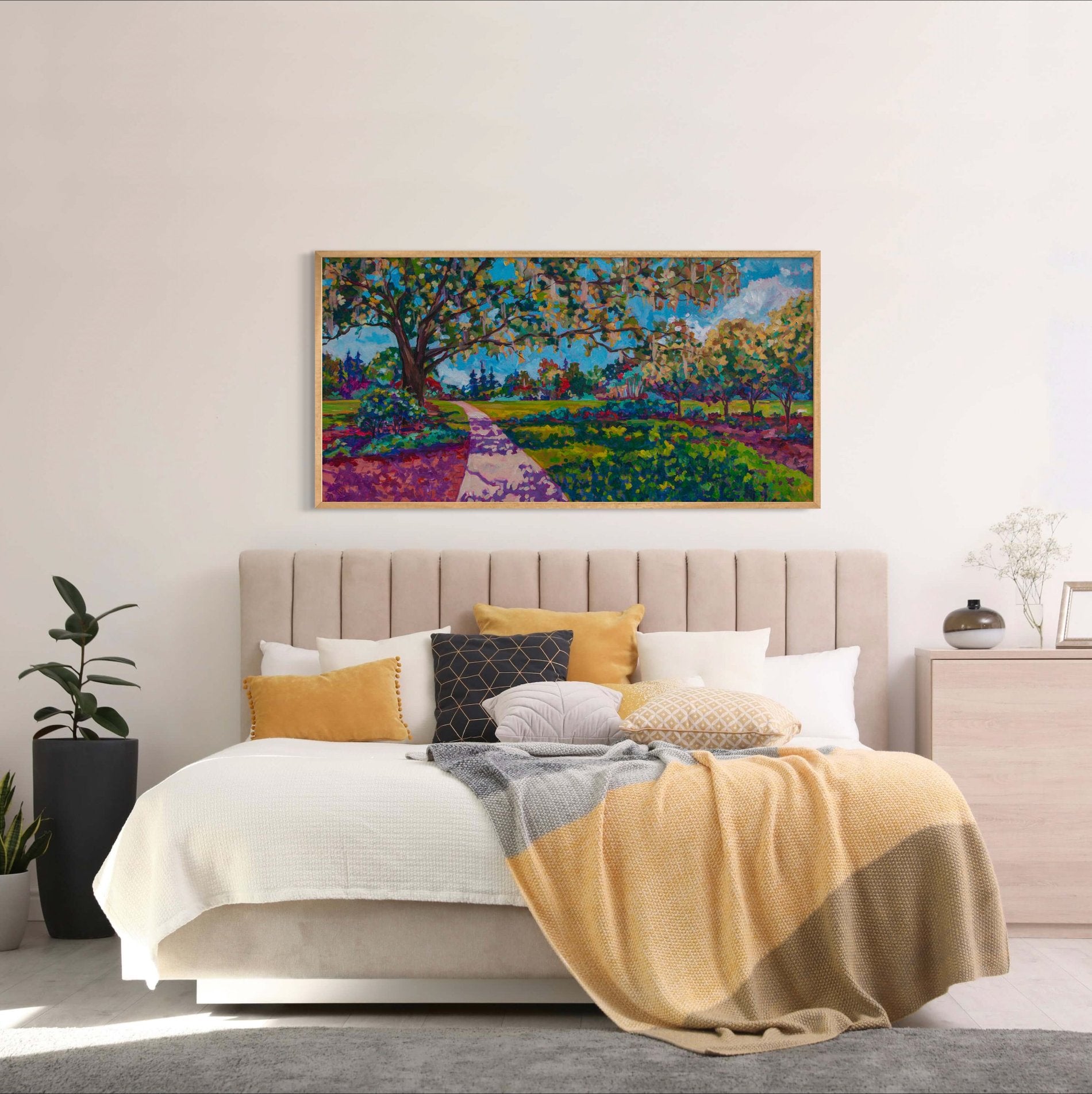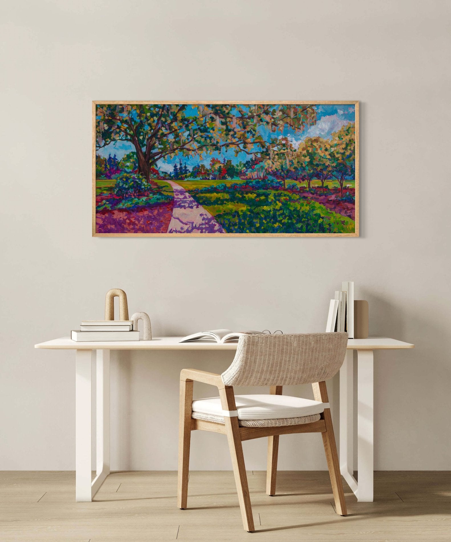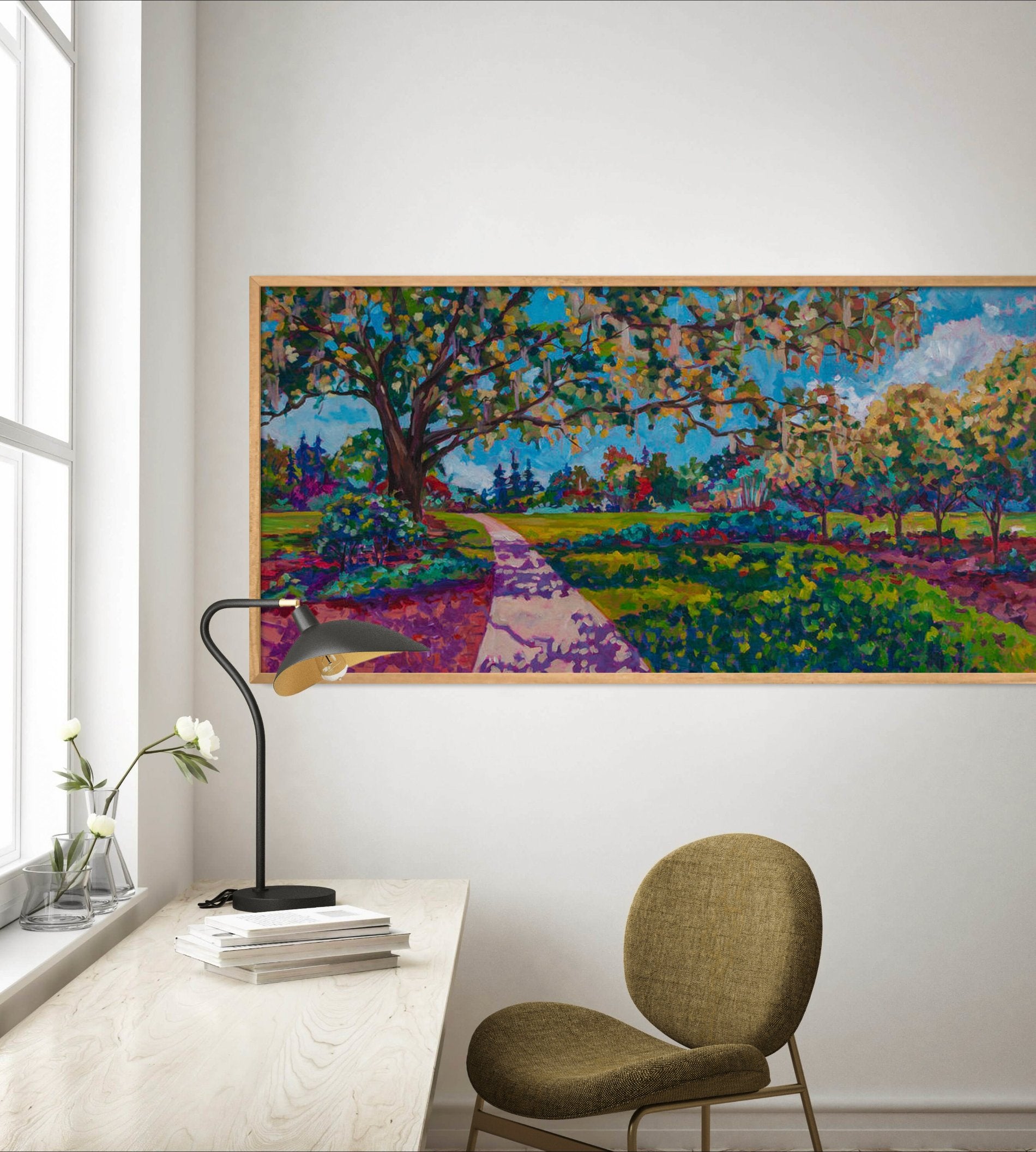 Inspired by a stroll through Leu Gardens in Winter Park, FL, this painting captures the garden's rich variety of plants and trees. From ancient oaks with sprawling limbs to vibrant flowering bushes and meandering pathways, every detail is designed to be enjoyed and savored. Where do you go to recharge and find your own moment of peace?