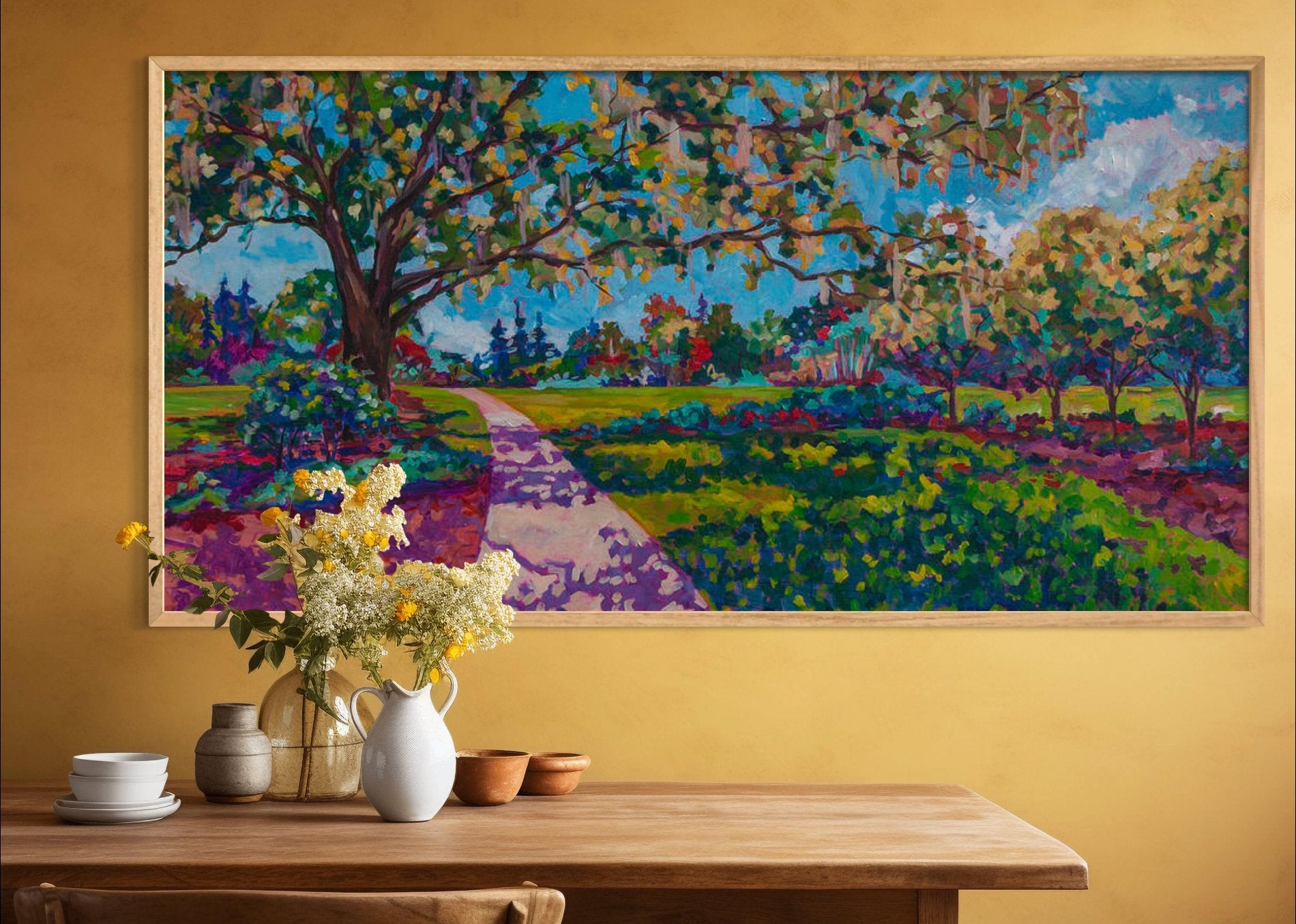 This original painting, measuring 24x48 inches, evokes a serene and calming atmosphere. With ample space to either run or sit quietly in the shade, the scene invites you to leave behind your worries and immerse yourself in peaceful surroundings. The gentle chirping of birds and the occasional buzz of a bee searching for nectar enhance the tranquil setting. Spaces like this, reminiscent of Eden, offer a restorative escape from daily burdens.