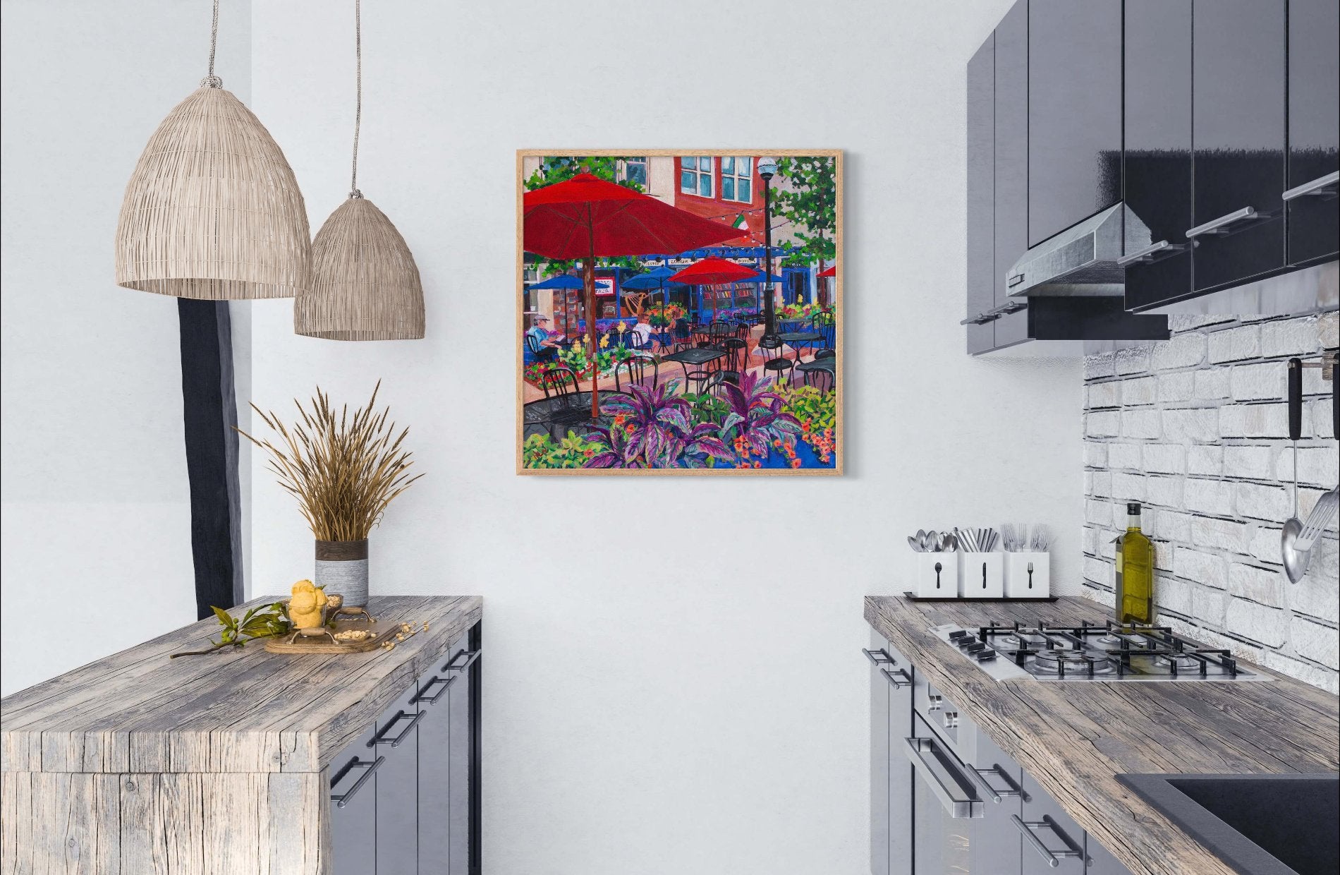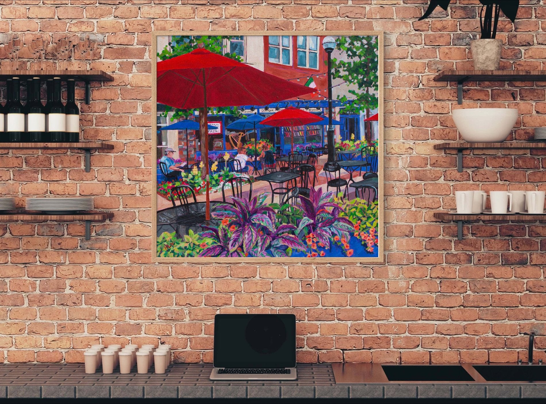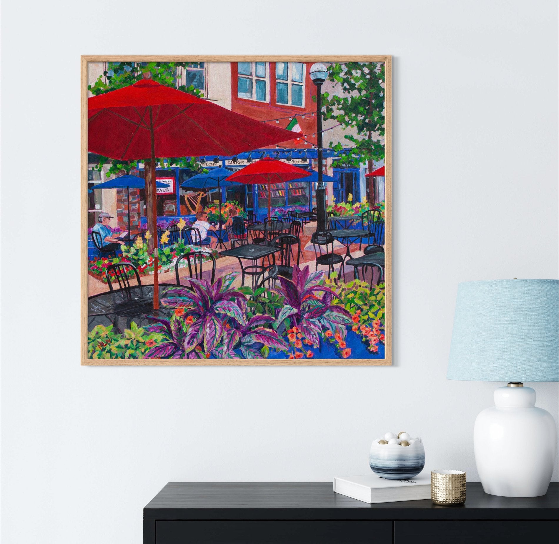 This original 30x30 acrylic painting on gallery-wrapped canvas captures the charm of an inviting outdoor café inspired by Conor O'Neil's restaurant in downtown Ann Arbor, Michigan. The painting showcases the vibrant blue of the building, the cheerful umbrellas, and the lush flower boxes, all contributing to a scene that beckons you to slow down and savor the moment. Amidst the bustling downtown surroundings, this café stands out as a testament to investing in beauty and tranquility in a world that often moves too quickly.