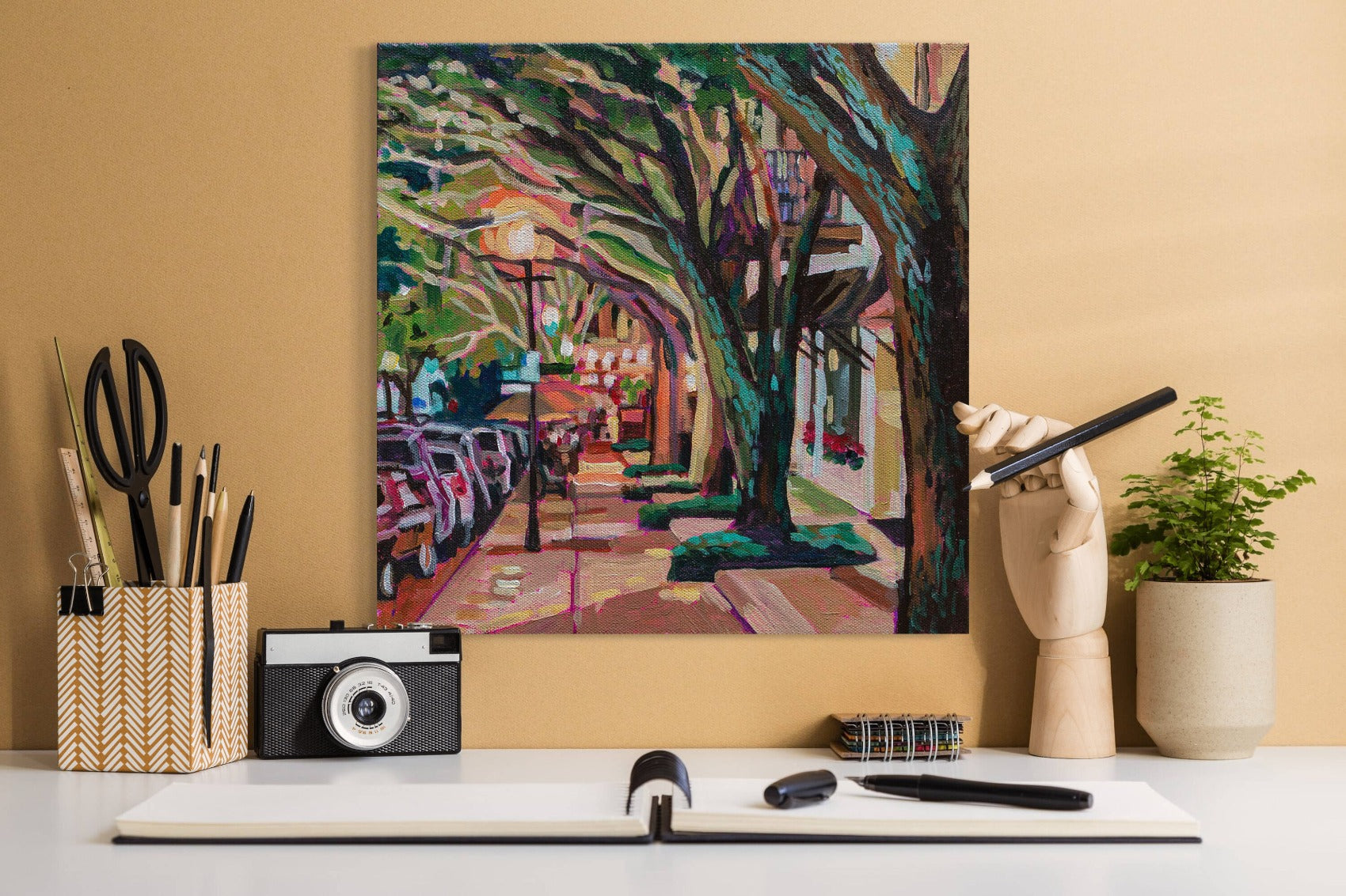 This original 12x12 acrylic painting on gallery-wrapped canvas depicts a charming tree-lined street with outdoor restaurants, inviting an evening stroll. The dramatic colors and sense of mystery capture the allure of New England Avenue in Hannibal Square, Winter Park, Florida, drawing viewers in to explore and savor the vibrant night scene.