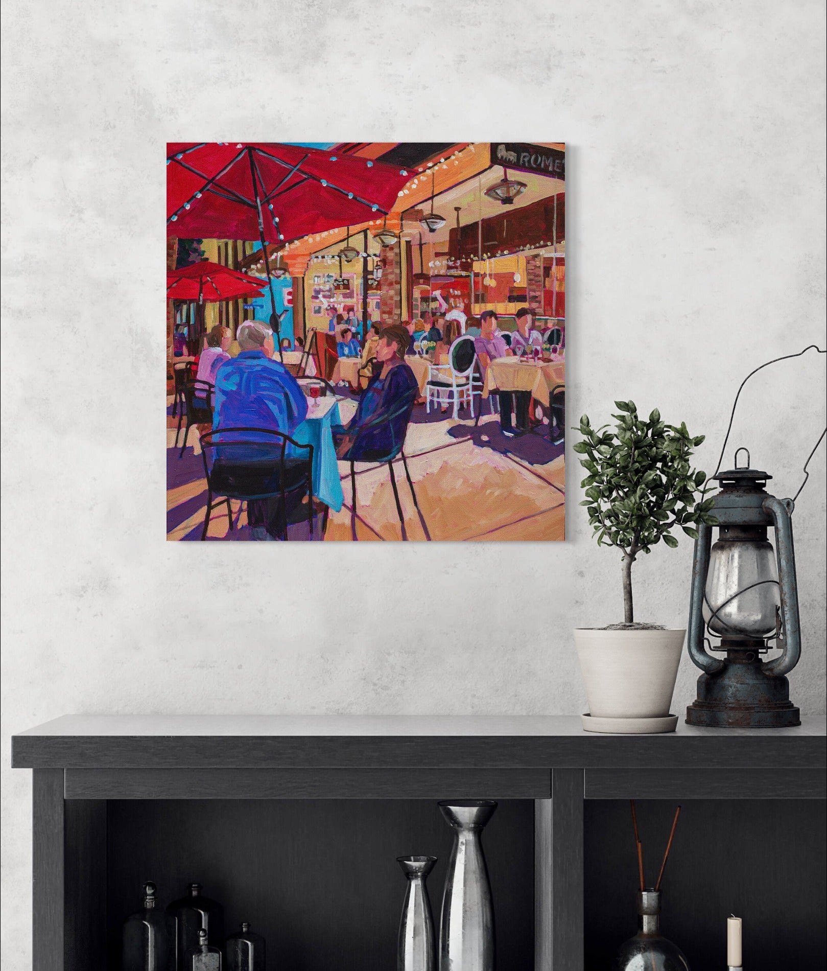 This original 20x20 acrylic painting on gallery-wrapped canvas is the fifth piece in a series showcasing nighttime scenes around Winter Park, Florida. The artwork captures the unique ambiance of night, with its distinct lighting and mood, focusing on the area in front of Rome's Flavours restaurant on E Morse Blvd, just off Park Ave. The painting highlights the transformation of familiar places under the enchanting glow of evening.