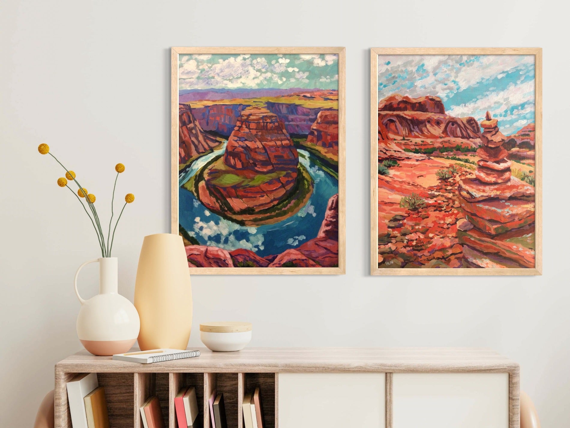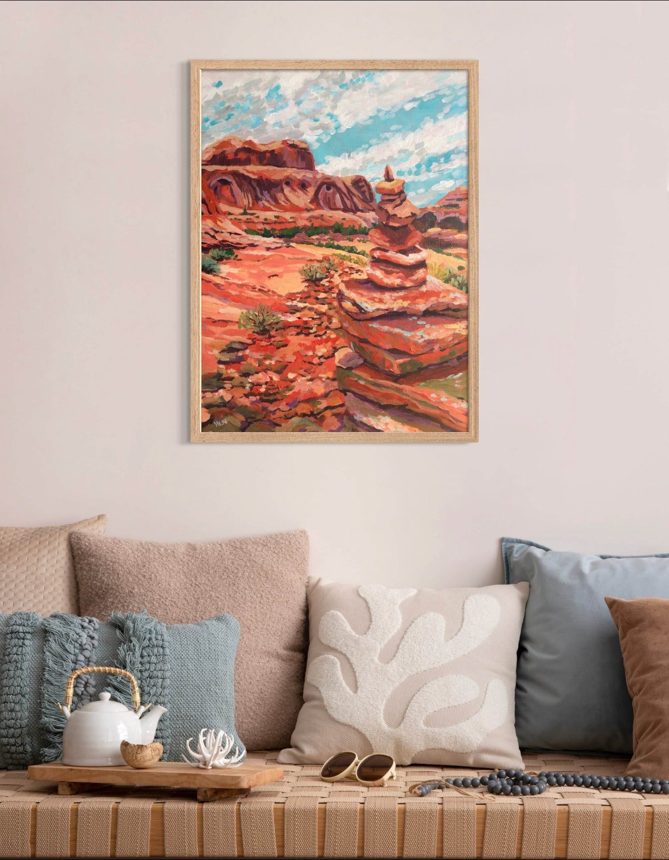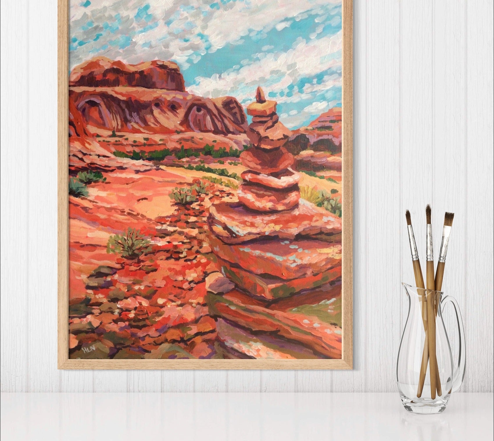 This original acrylic painting, measuring 18x24 inches with a depth of 0.65 inches, is presented on gallery-wrapped canvas. It was inspired by a hike to Corona Arch, located near Moab, Utah, just outside Arches National Park. The arch, one of the largest in North America, is highlighted in the painting, which also captures the rugged trail marked by cairns—piles of rocks used to guide hikers along the rocky terrain. This piece is part of a series inspired by the breathtaking landscapes of the Southwest United States, reflecting the unique beauty and vastness of the region.