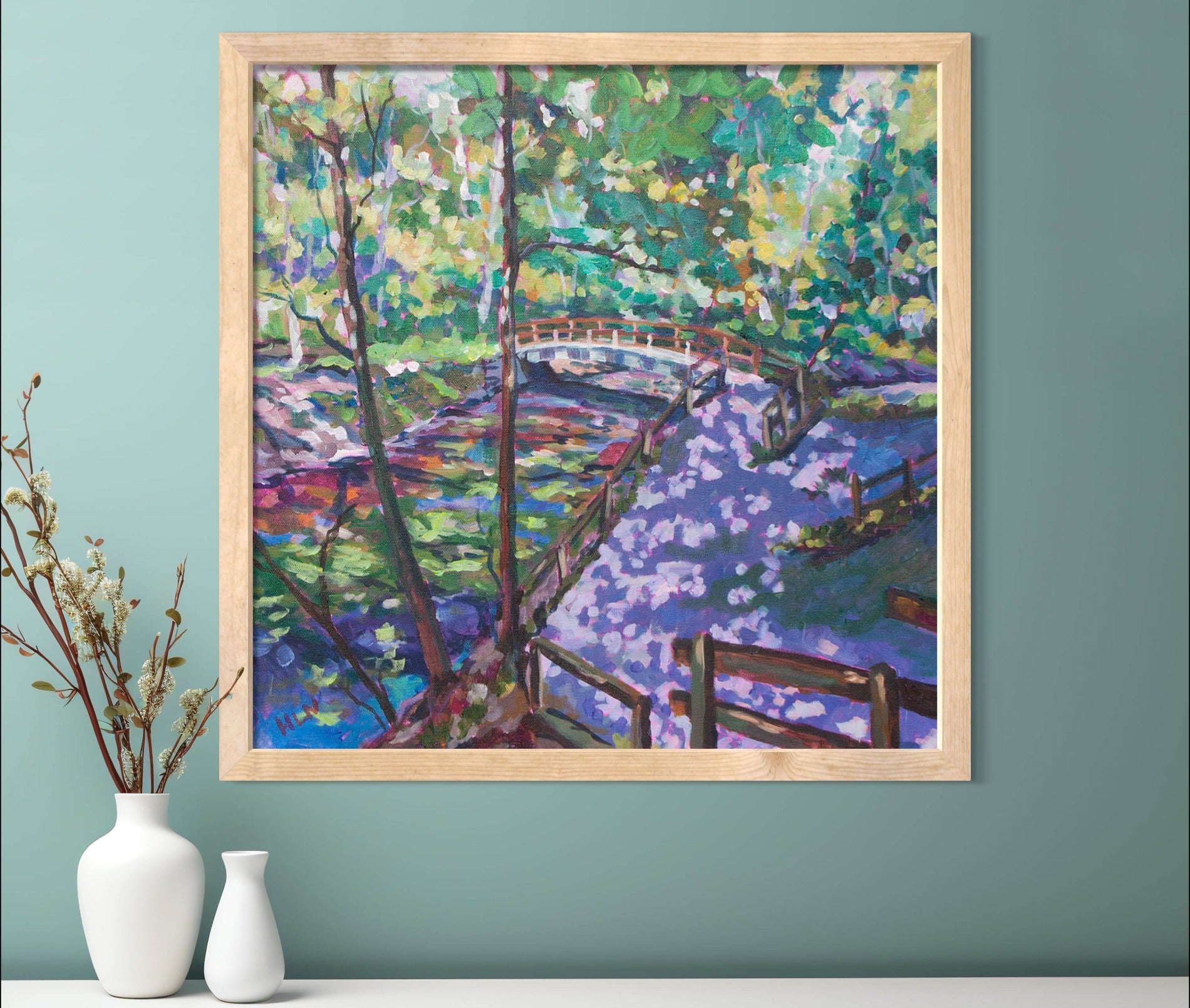 This original painting, measuring 20x20 inches, depicts a serene scene under a lush canopy of green. Dappled light filters through the leaves, casting intricate shadows, while water cascades over slate rocks, reflecting a range of vibrant colors. Rendered in expressive brushstrokes and vivid hues, this impressionistic acrylic on canvas beautifully captures the enchanting beauty of Cuyahoga Valley National Park.