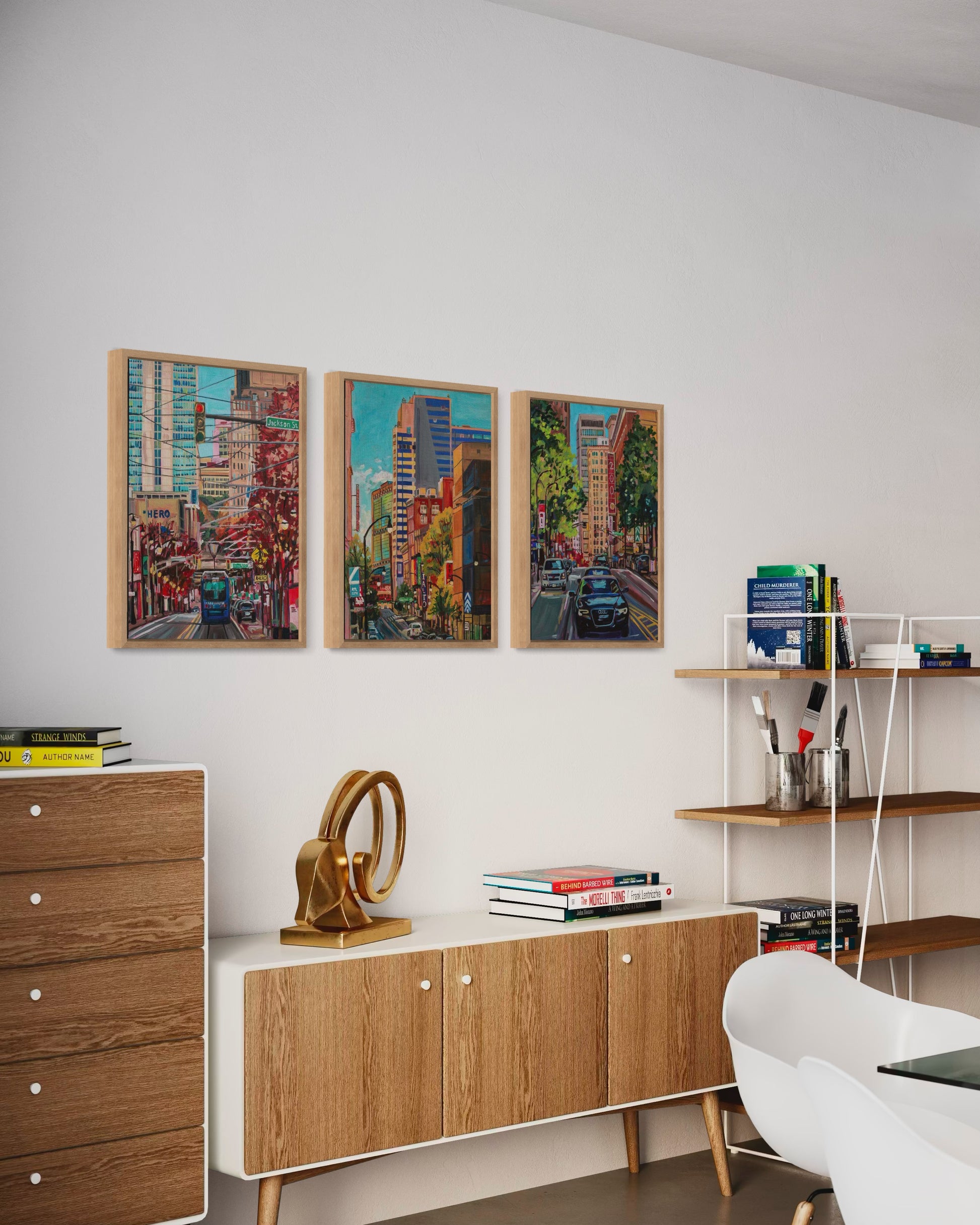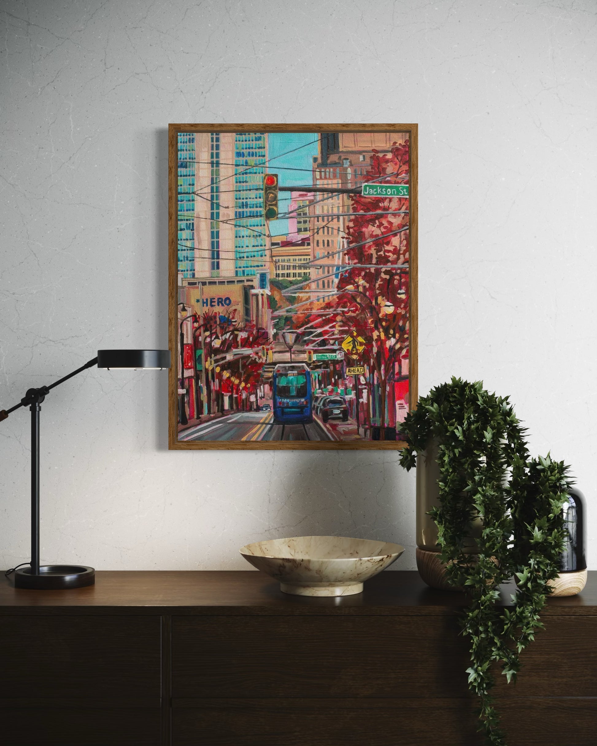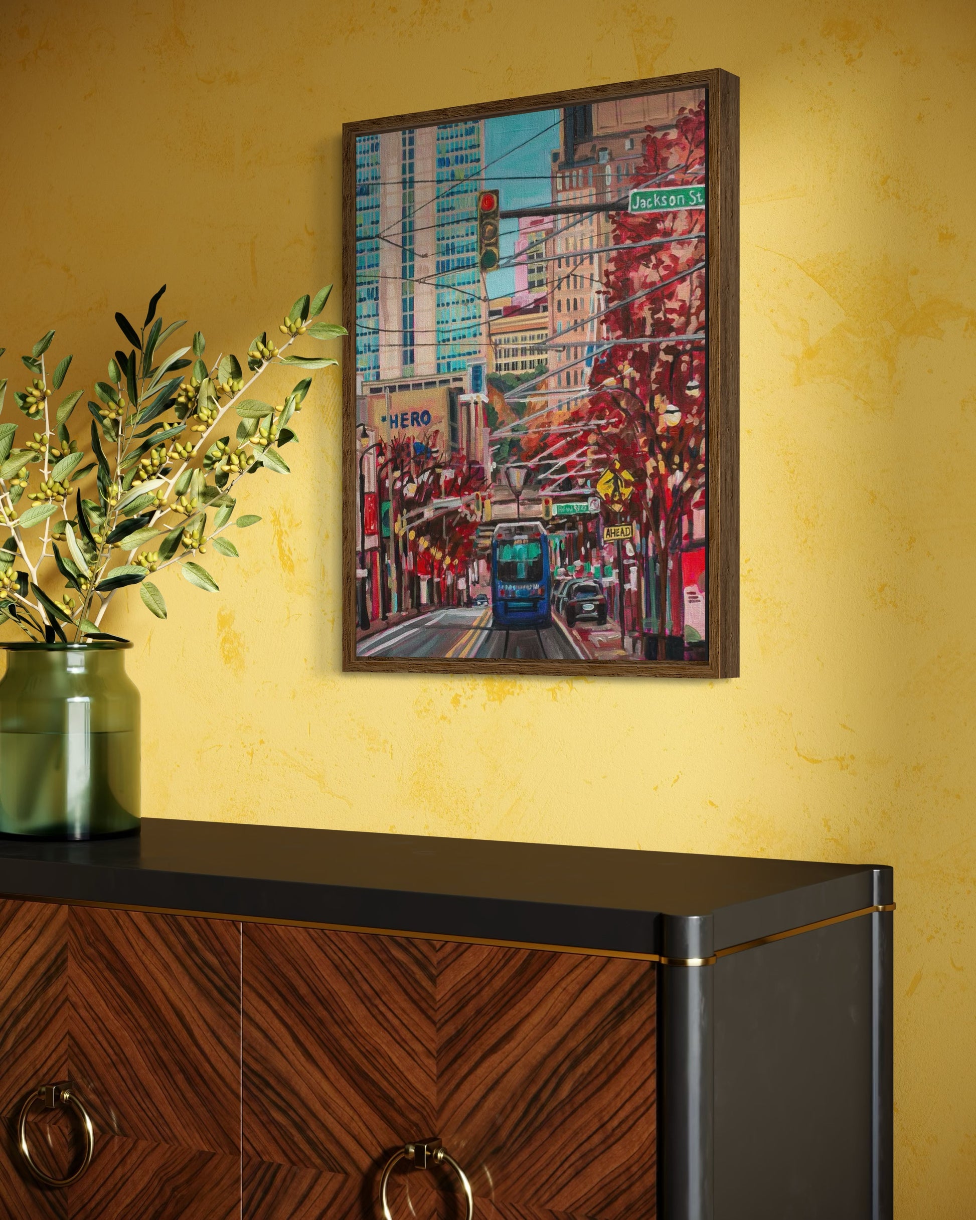 This 18x24-inch vibrant acrylic painting captures a dynamic street-level view of Atlanta’s downtown near Jackson Street, with the city’s streetcar as a focal point. The perspective draws the eye down the street, where the blue streetcar moves along its tracks, framed by colorful autumn trees with rich red and orange foliage. The painting is filled with urban energy, depicted through intricate details like power lines crisscrossing the sky, traffic lights, and street signs—including the prominent "Jackson St" and "AHEAD" signs.