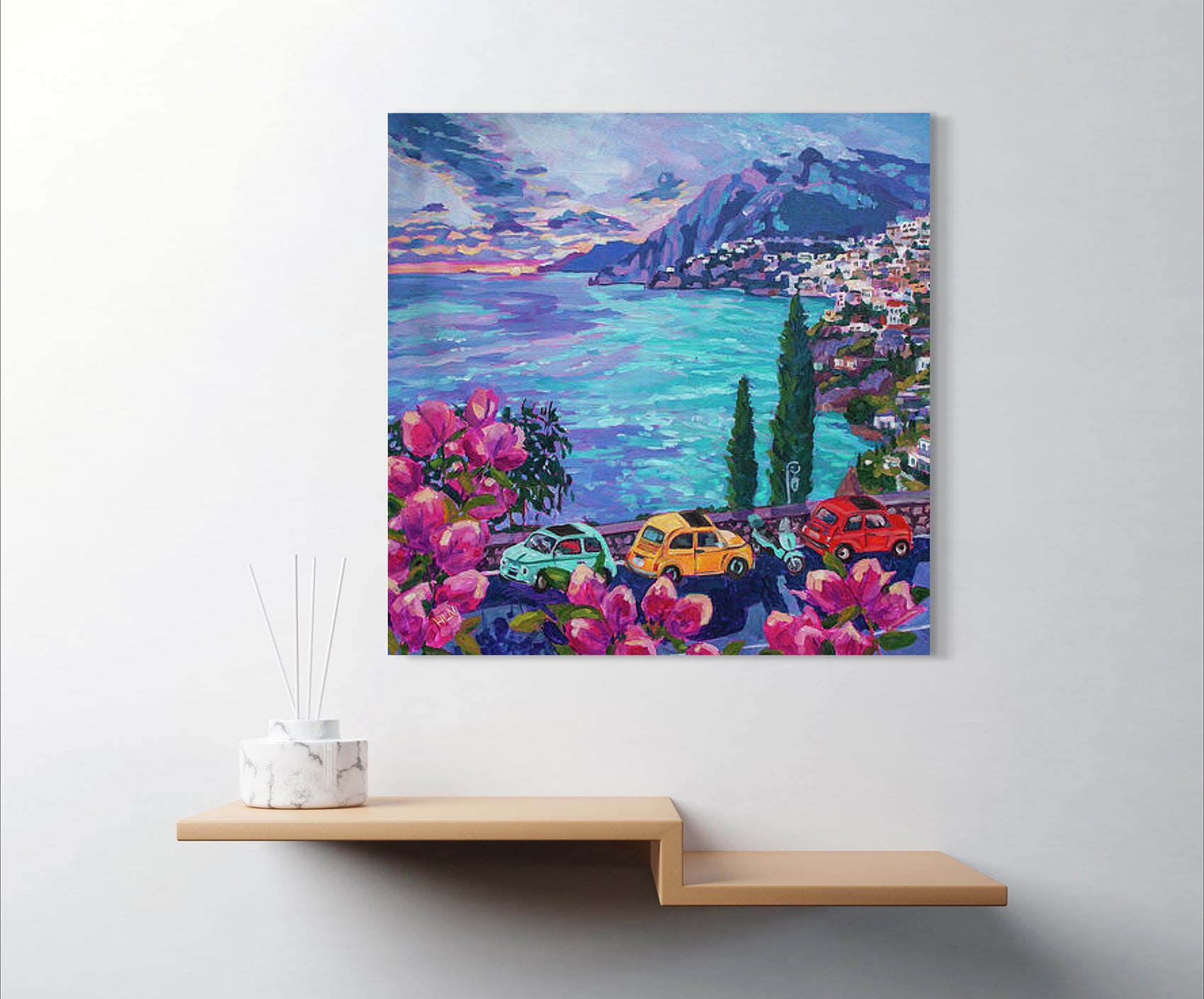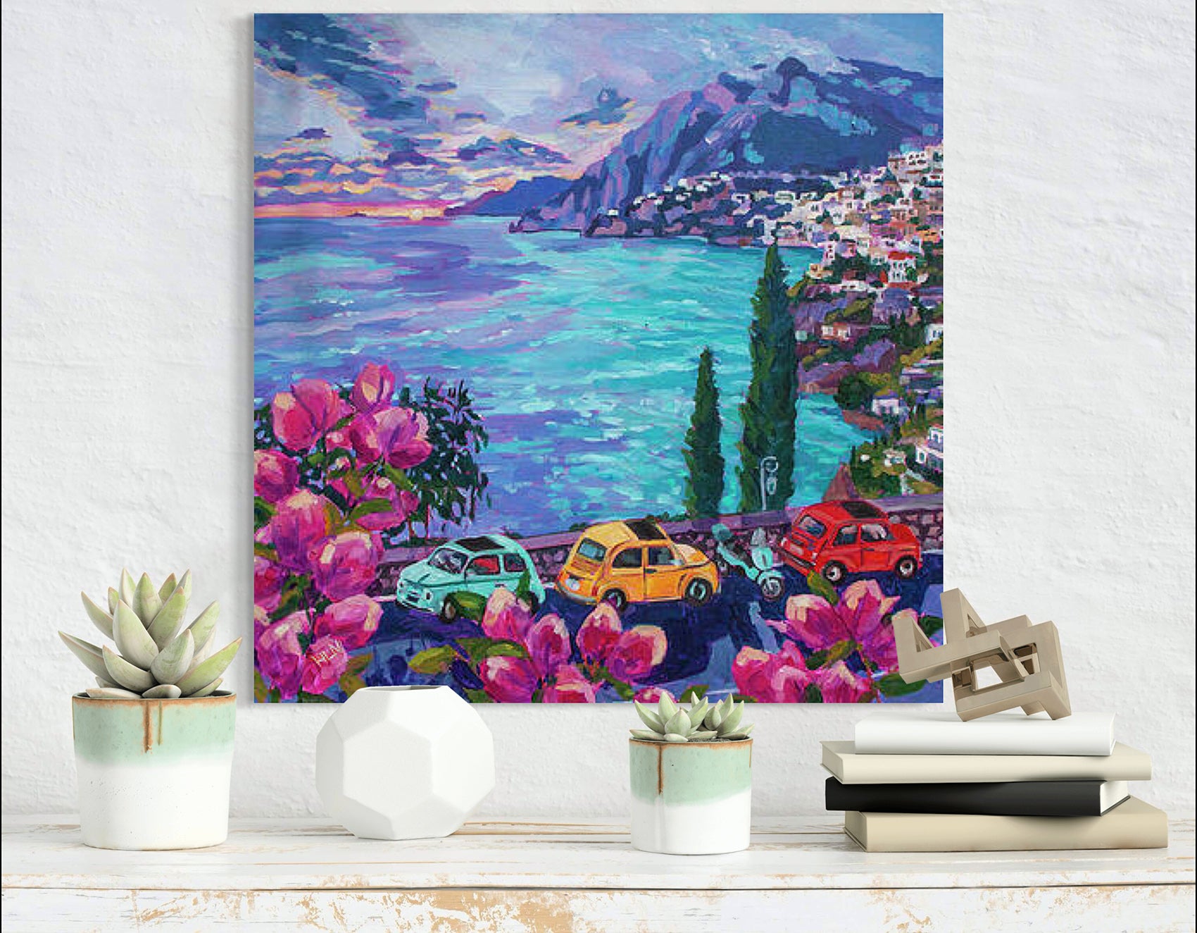 "This original 24x24-inch painting captures the charm of Positano, Italy at sunset, where vintage Fiats, iconic for navigating the area's narrow, curvy streets, line the streets against the stunning backdrop of the Amalfi Coast and Arienzo Beach. It's easy to see why this area is a dream destination for tourists."
