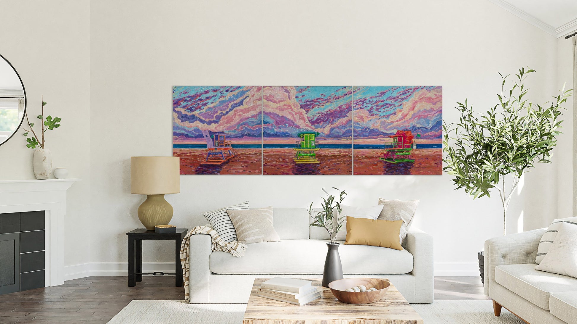 These dramatic sunrise scenes of Miami's South Beach capture the Art Deco-inspired aesthetic of the iconic and quirky lifeguard stands designed by architect William Lane. Each painting, measuring 30x30 inches, is an original acrylic work on gallery-wrapped 1.5-inch deep canvas. The vibrant depictions highlight the unique melding of art and architecture that defines these structures. The paintings can be displayed individually or together, offering a striking visual narrative that celebrates the signature stylings of Miami Beach's architectural heritage.