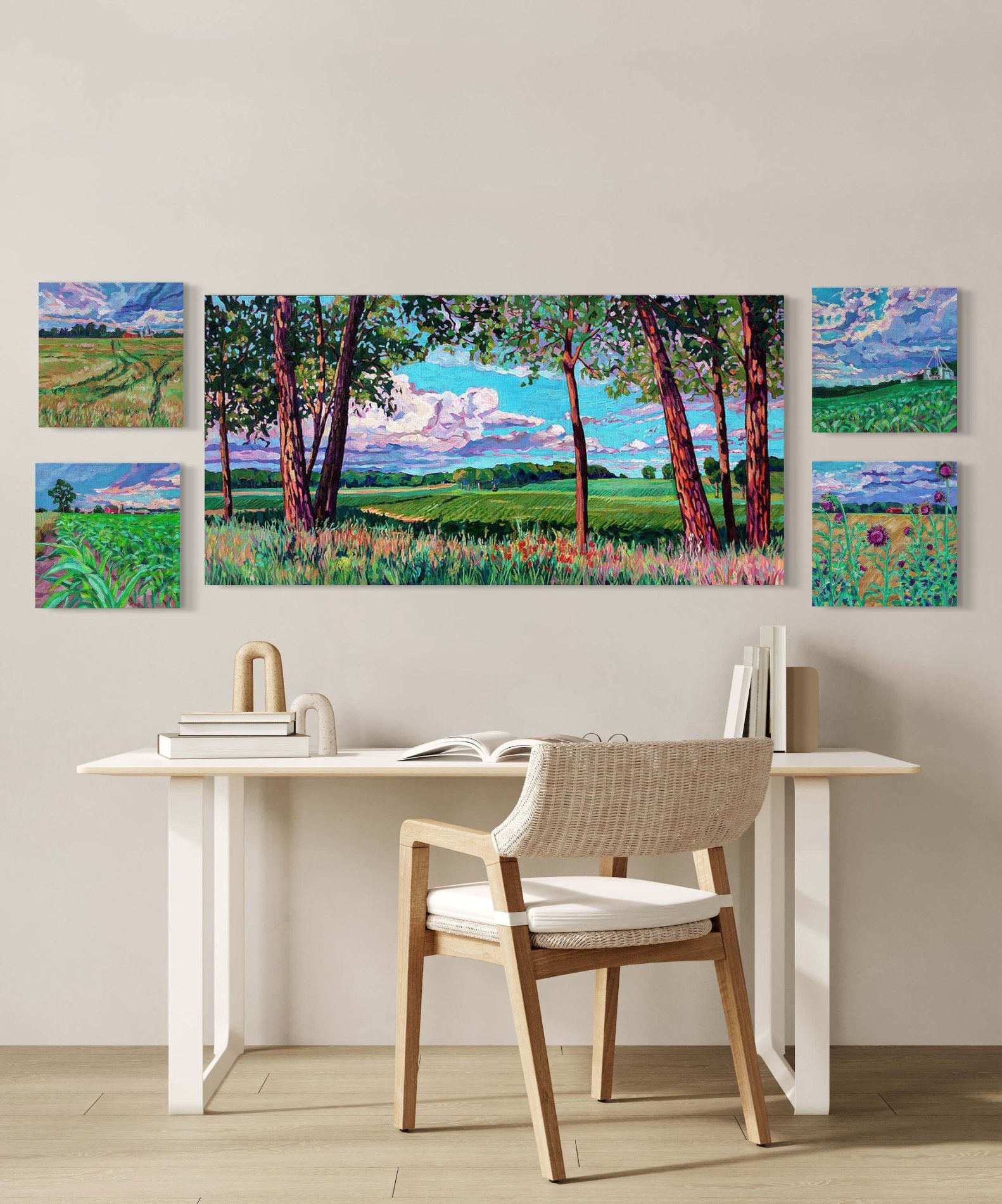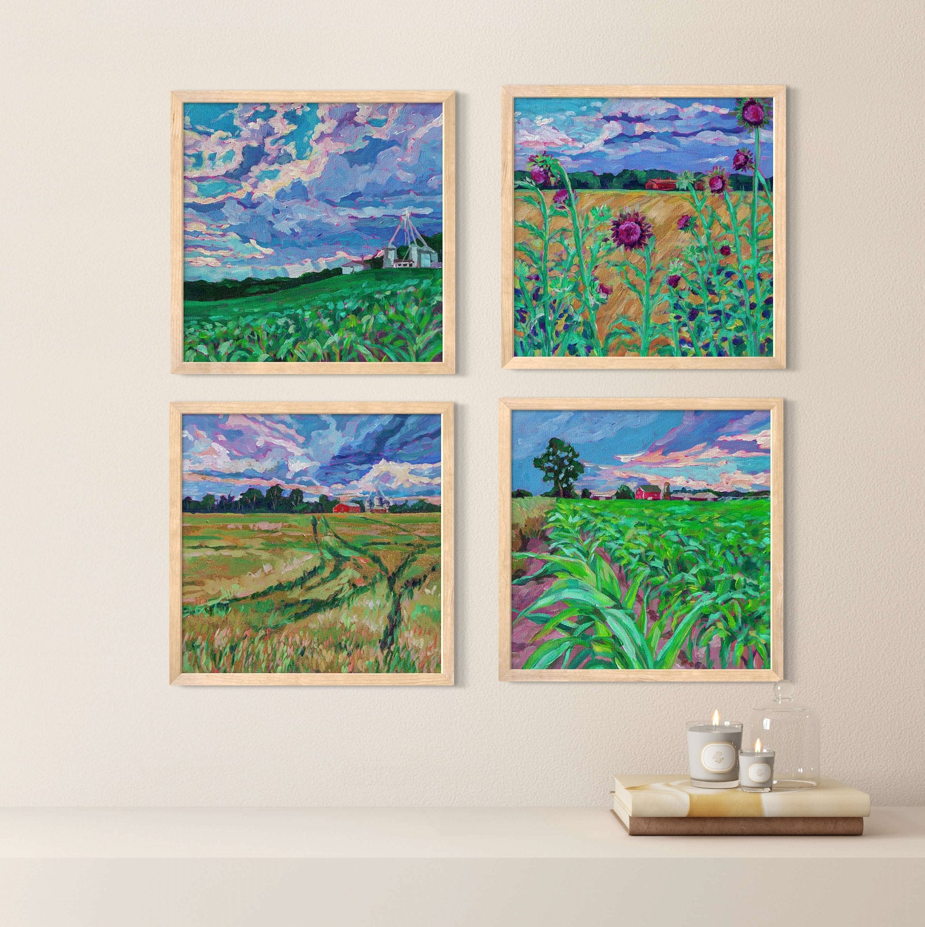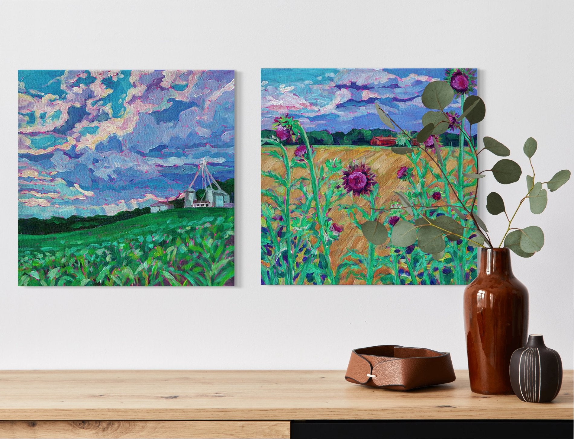 This original 12x12 gallery-wrapped painting features rows of crops sprouting and beginning to grow, with vibrant thistle plants lining the edge of the field, observing the scene. The painting celebrates the beauty of weeds when they coexist harmoniously with crops, inspired by a summer drive down dirt roads amidst Southern Michigan farmland. Though initially completed some time ago, I revisited the foreground to refine it, and am now pleased with the final result.