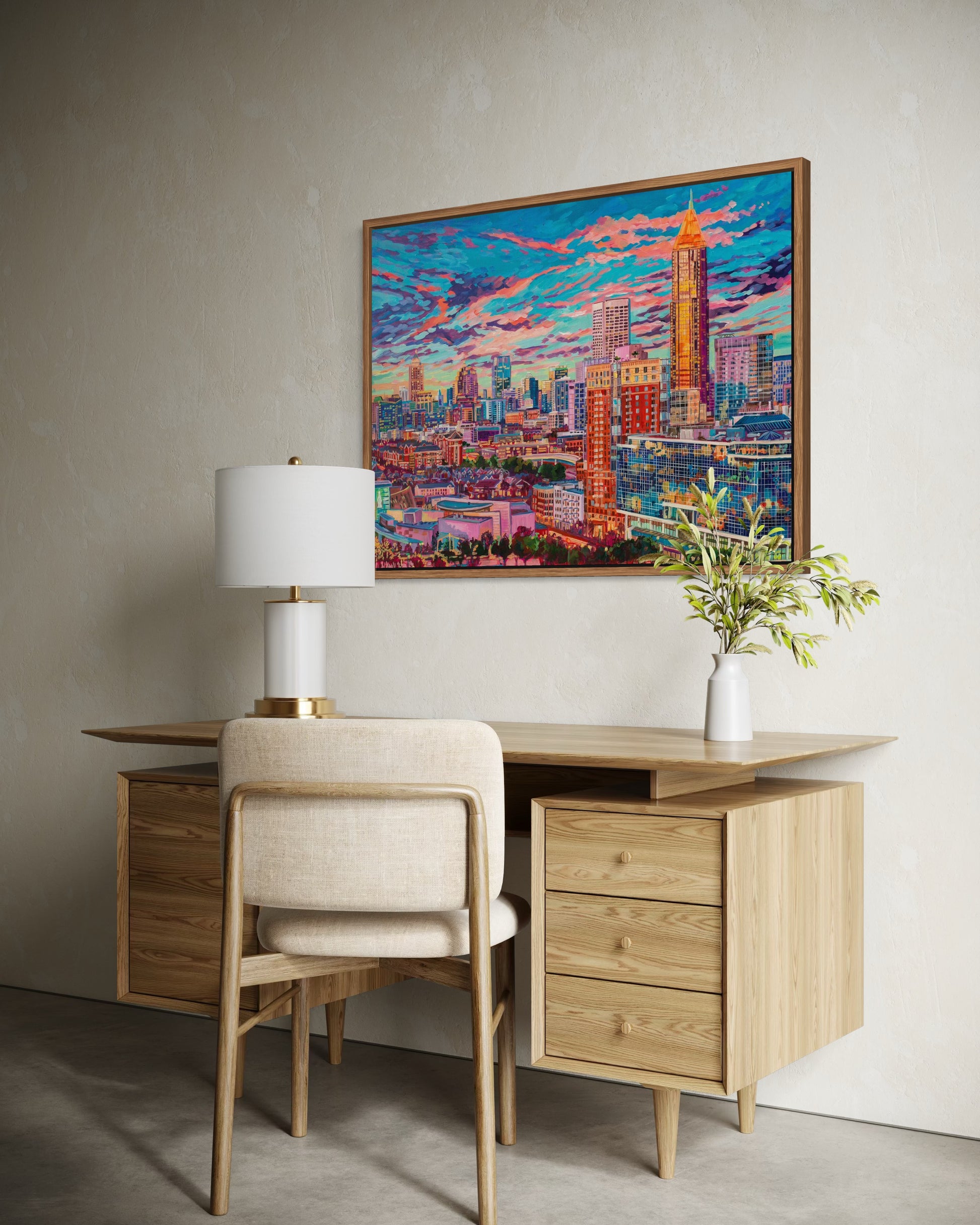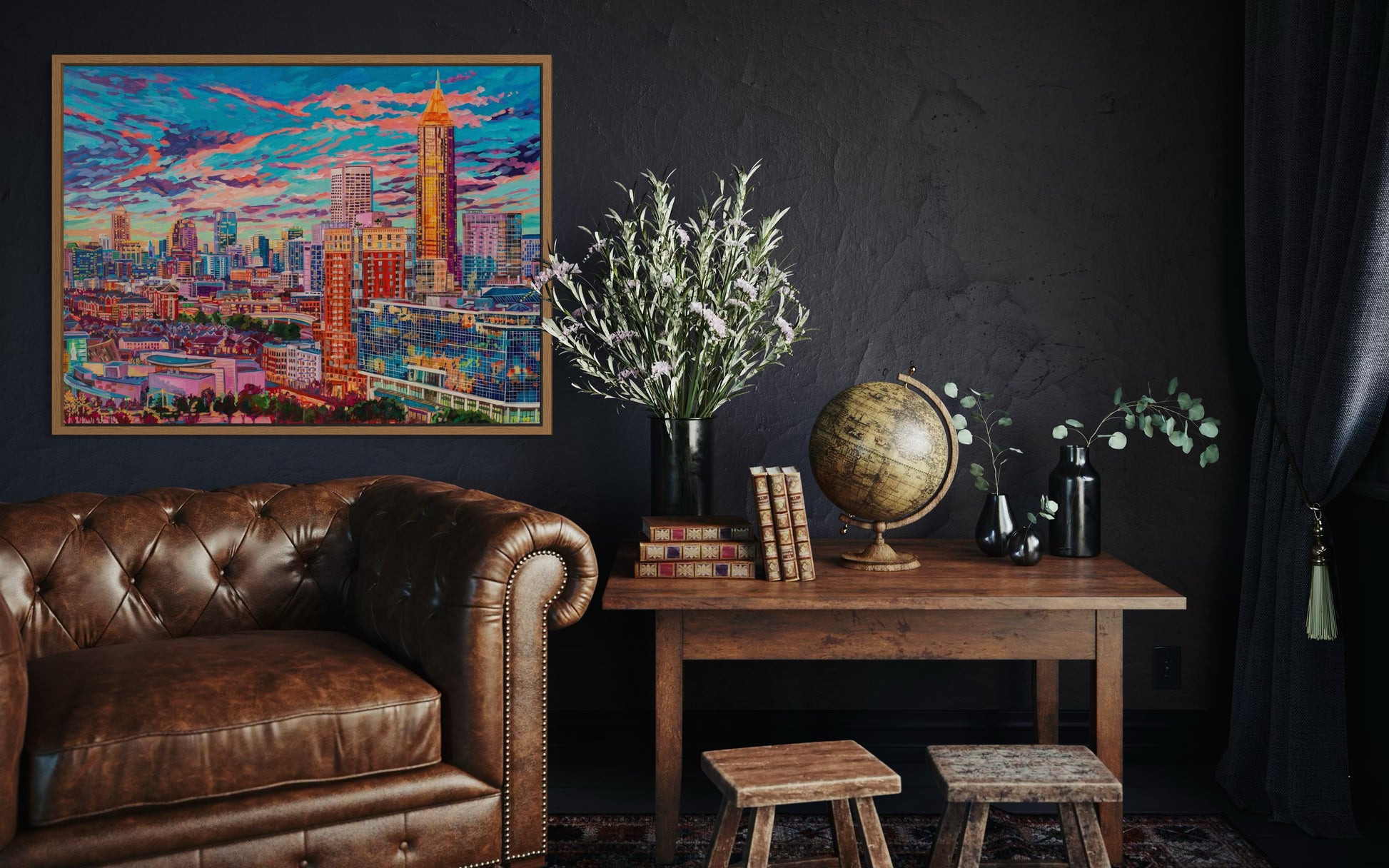This vibrant acrylic on canvas captures Midtown Atlanta at dusk, showcasing the dynamic skyline as the city transitions into evening. The iconic Bank of America “Pencil” building rises prominently against a glowing sky, while the World of Coca-Cola anchors the foreground, grounding the scene in Atlanta’s cultural identity. Measuring 30 x 40 inches, the composition invites viewers to step into the energy and rhythm of Midtown, where work, life, and play intersect. Bold, saturated colors and expressive brushstrokes convey movement and vitality, presenting a modern, idealized vision of the city. This piece challenges those who call Atlanta home to rediscover familiar spaces through a lens of possibility and renewed appreciation.