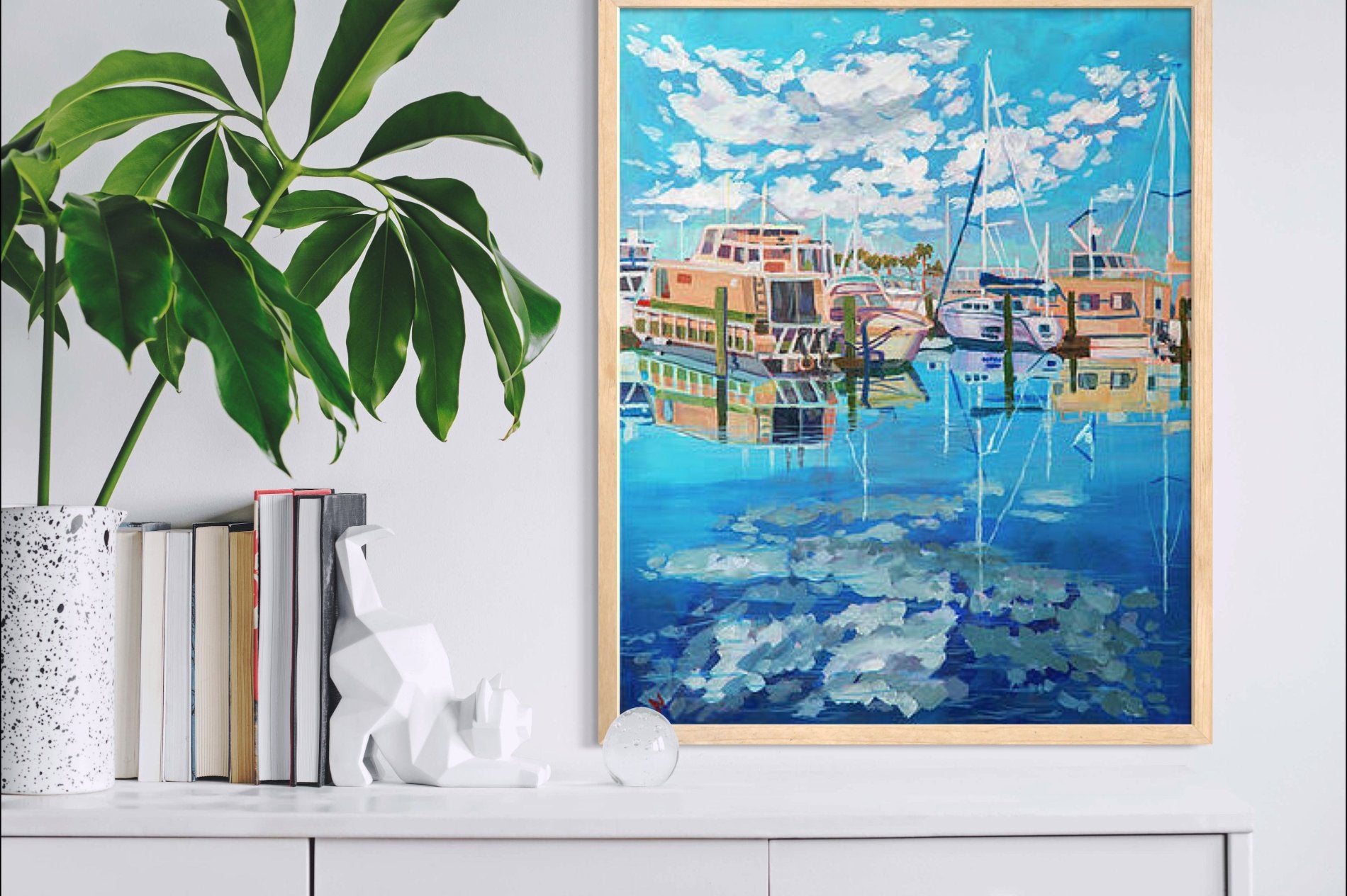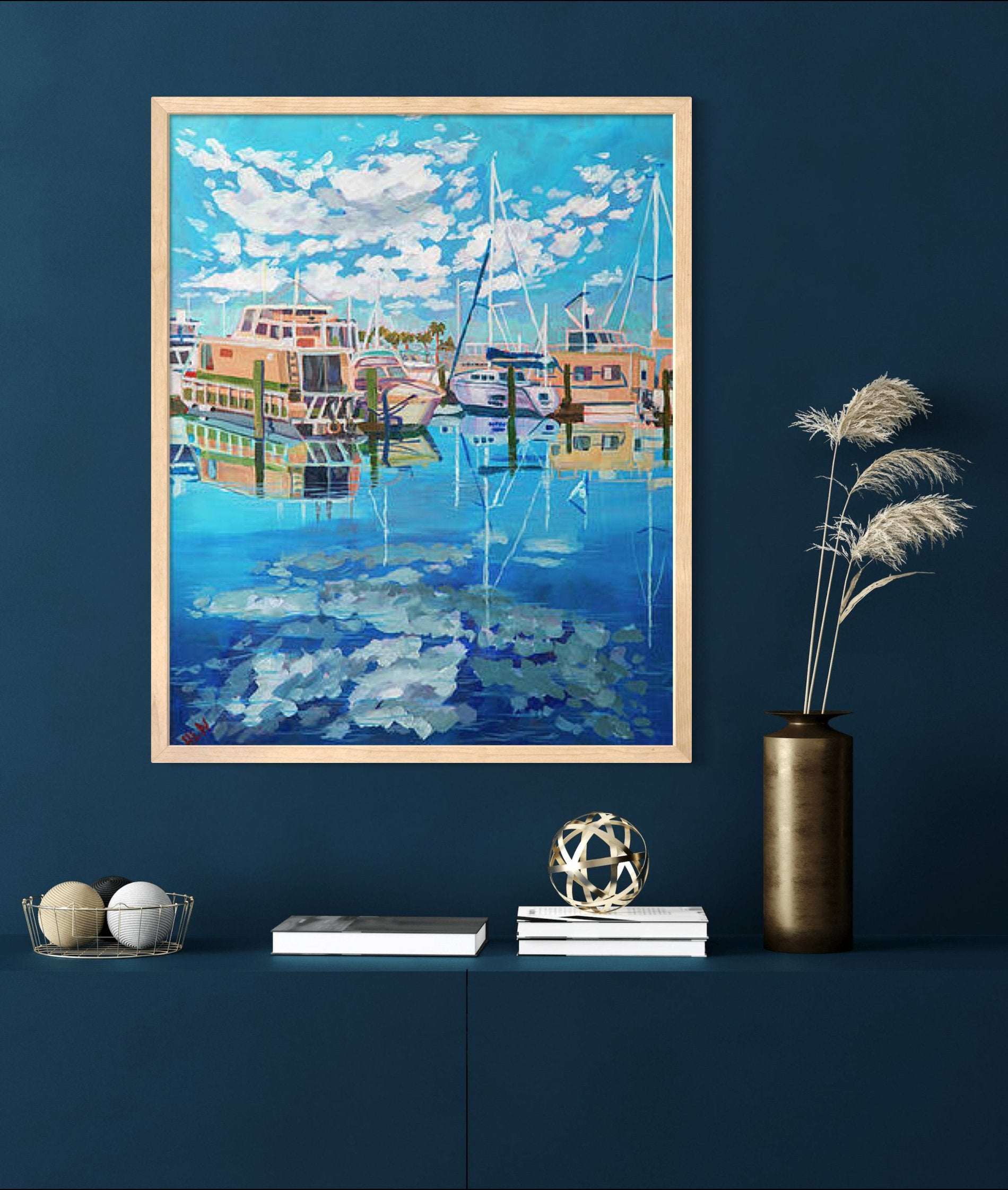 This original painting, measuring 16x20 inches, depicts a tranquil harbor where the smooth, still water perfectly reflects the boats docked along the shore. Utilizing loose realism, the painting captures the serene stillness of the scene, highlighting the peaceful harmony between the boats and their mirrored reflection in the calm water.