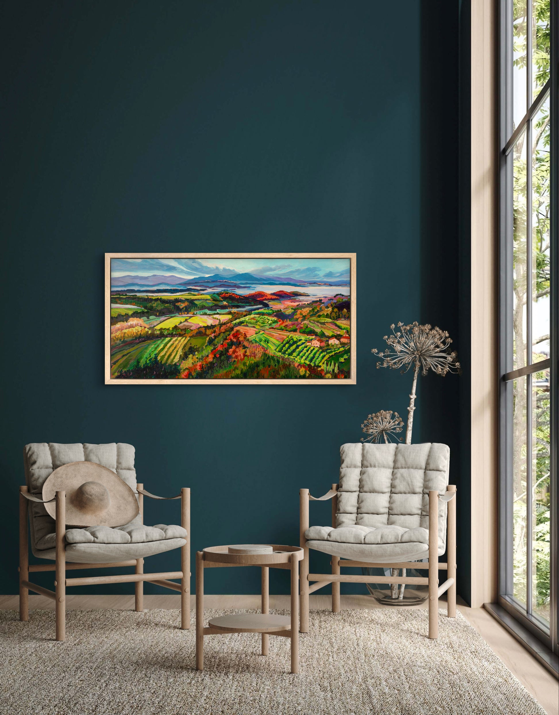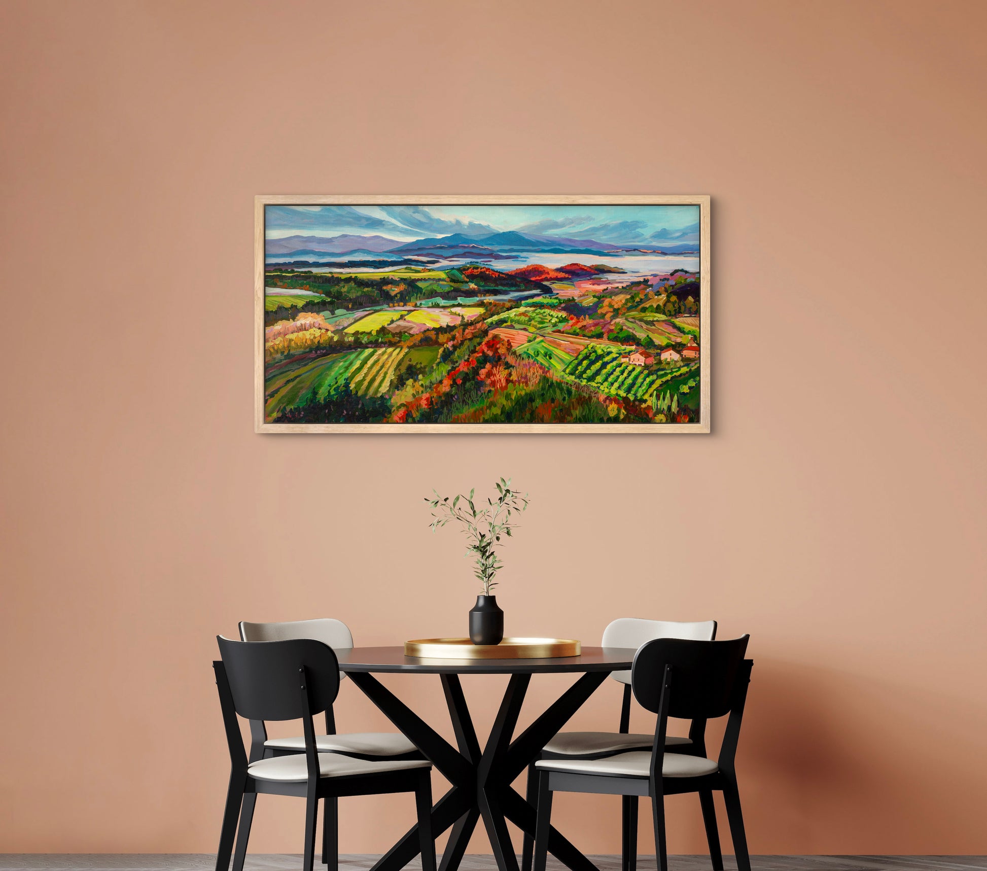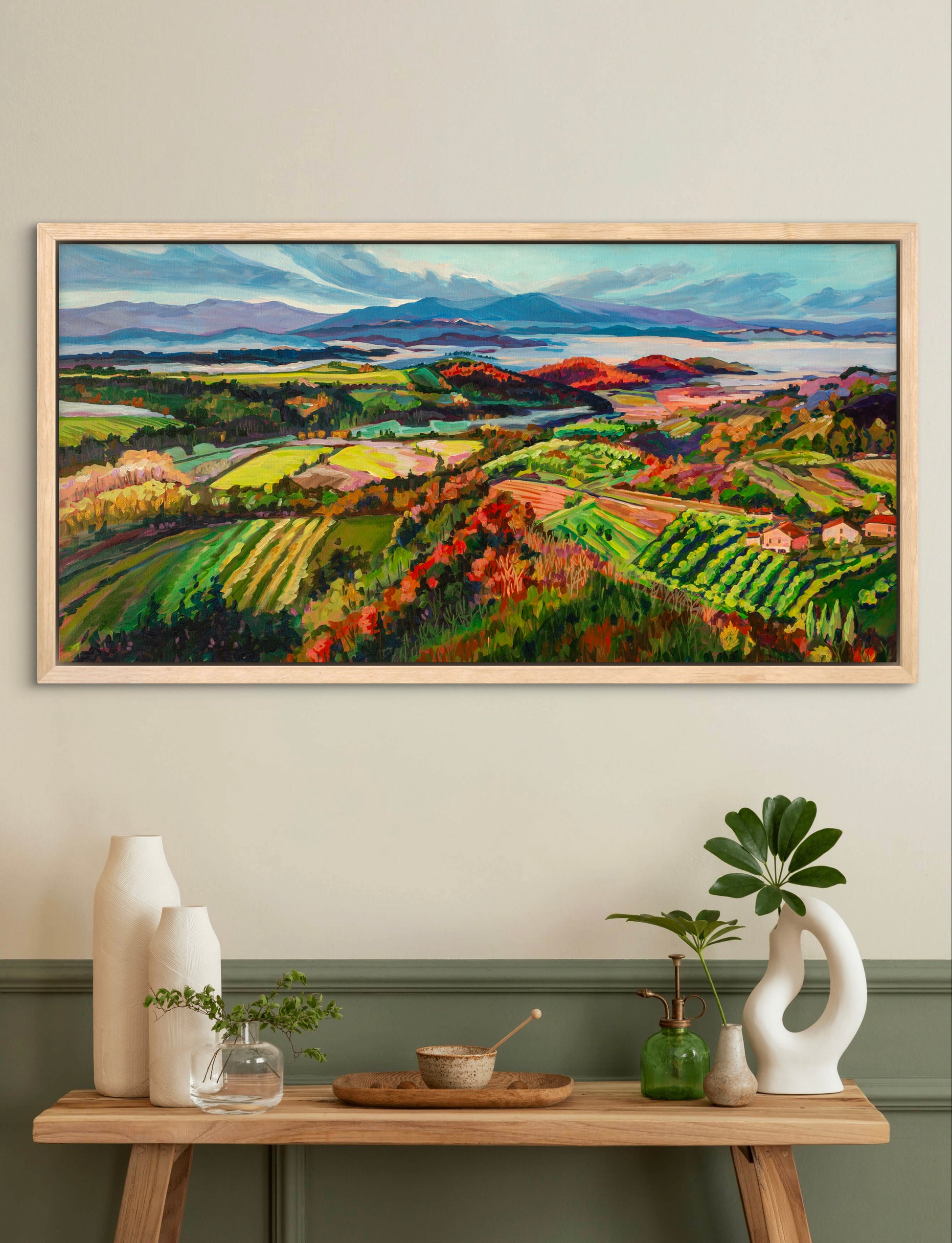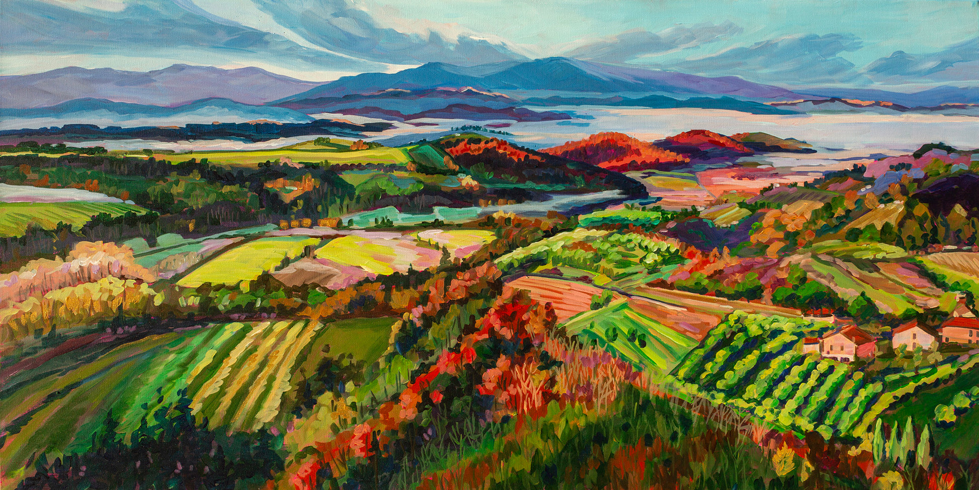 This painting is a 48x24-inch acrylic on canvas depicting a vibrant and impressionistic landscape of the Tuscan countryside near Pisa. The scene showcases rolling hills adorned with lush vineyards, agricultural fields, and scattered houses. The artist uses bold, expressive brushstrokes and a rich color palette, featuring shades of green, gold, and earthy reds, to capture the warmth and beauty of the region.