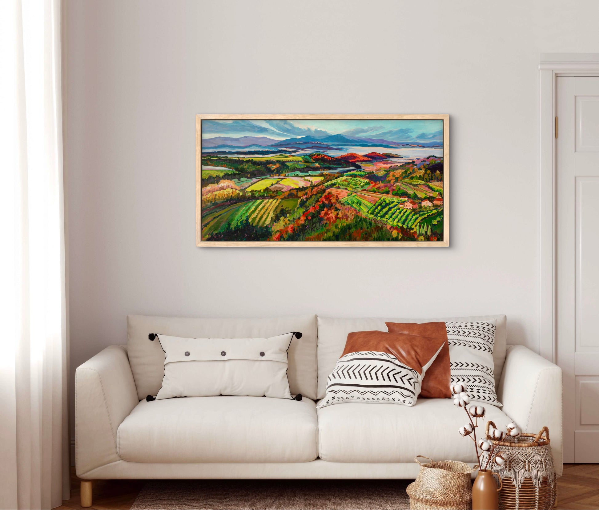 The composition, enhanced by the large canvas size, invites the viewer to immerse themselves in the timeless charm of Tuscany, where nature and rural life blend harmoniously. The vivid colors and expressive style amplify the warmth and vibrancy characteristic of the region.