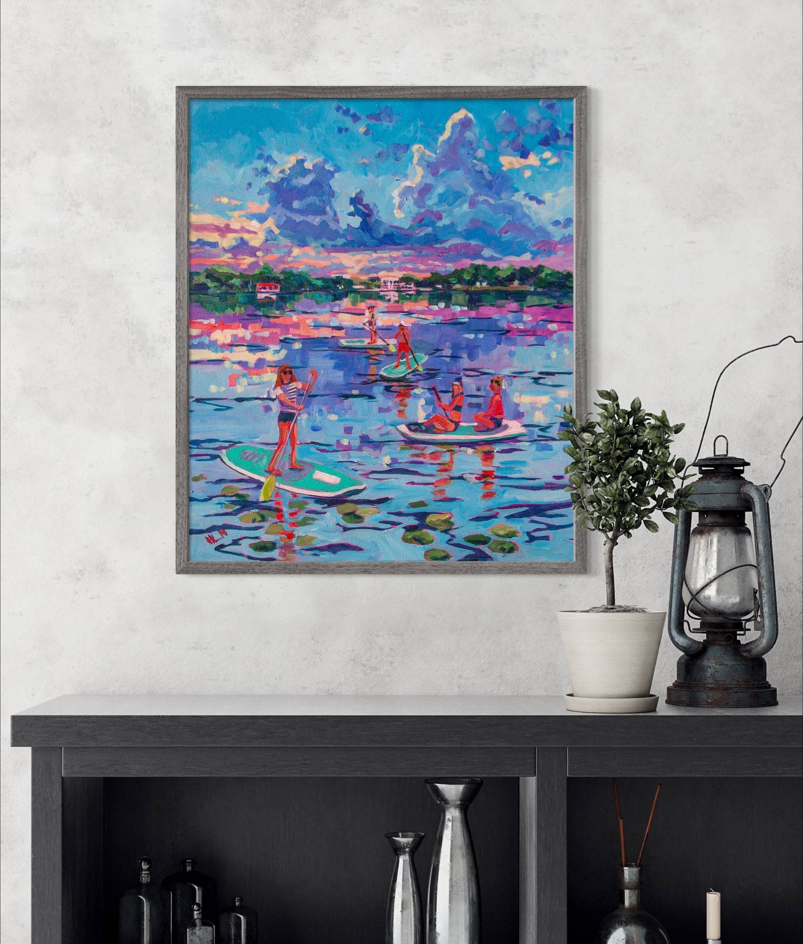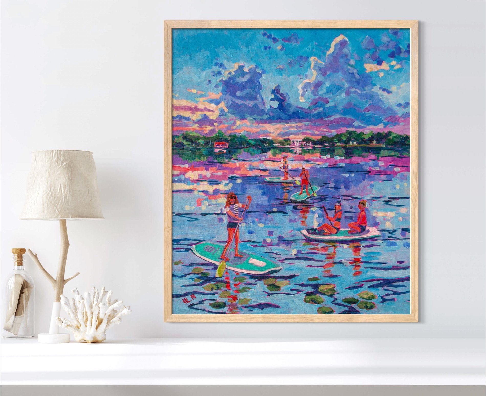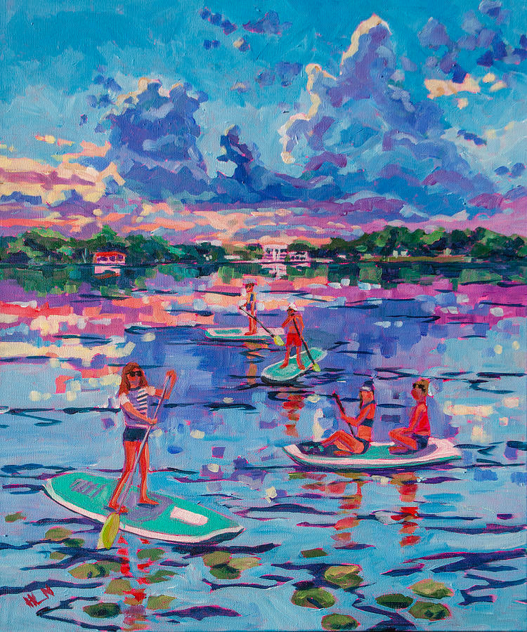 This original painting, measuring 20x24 inches, captures the experience of summer fun, long days at the lake, paddle boarding on the lake with friends at sunset. Soaking up all the experiences and memories of summer, as well as the beauty. Inspired by a sunset over one of the lakes in Winter Park, Florida.