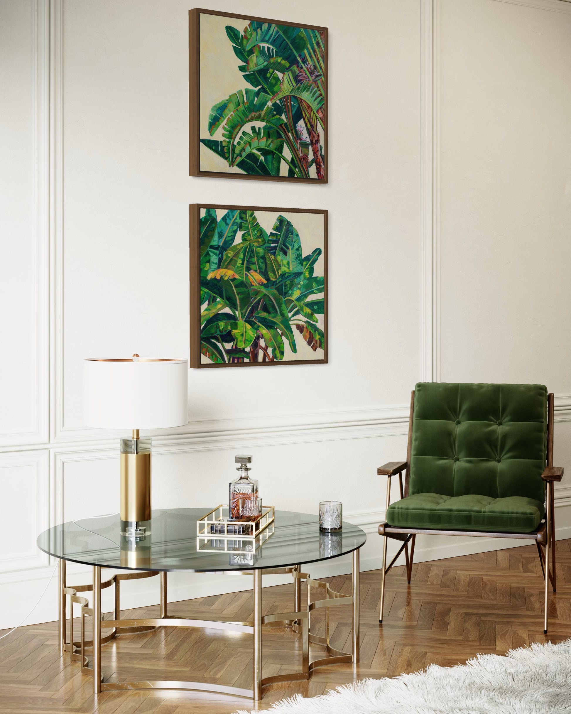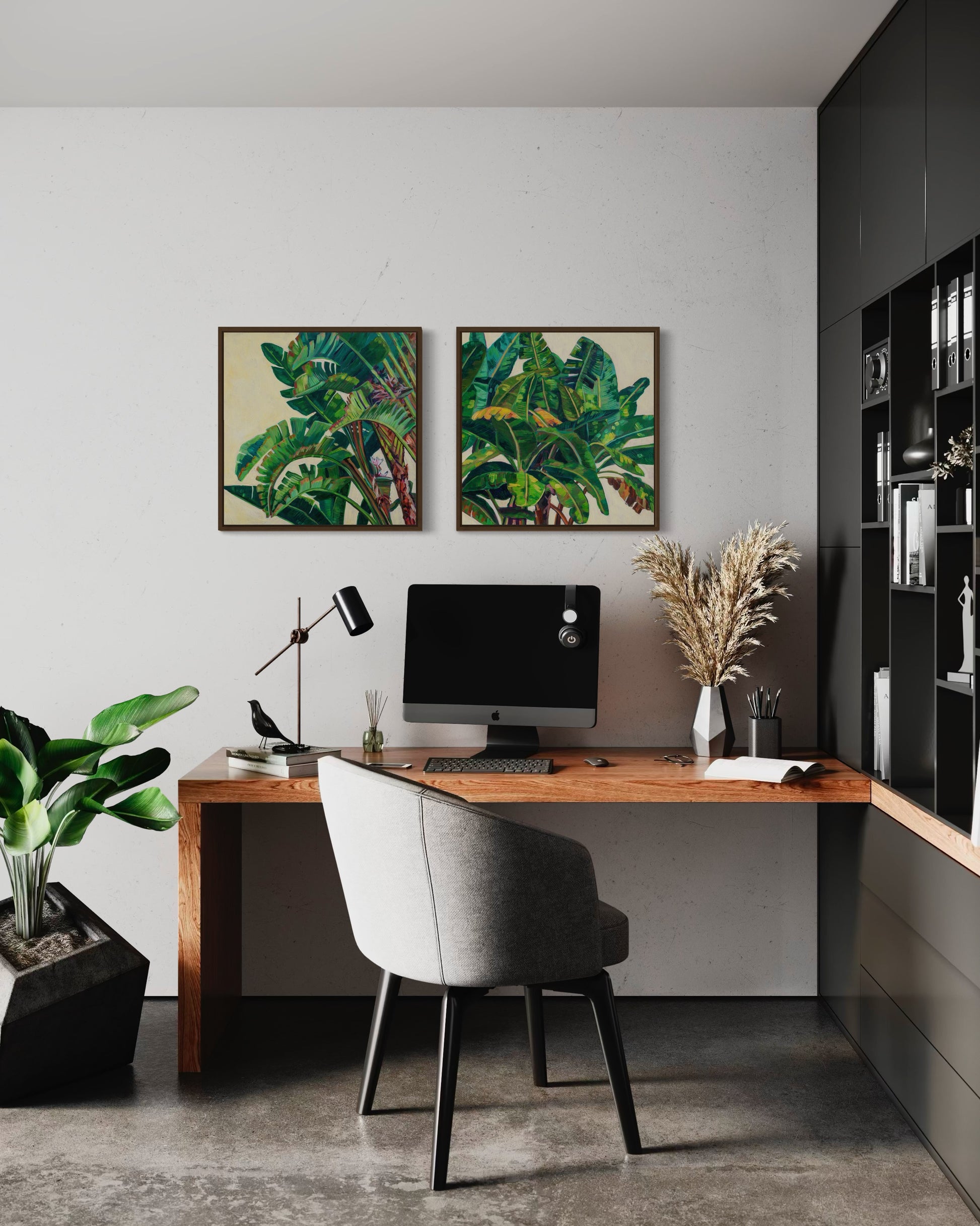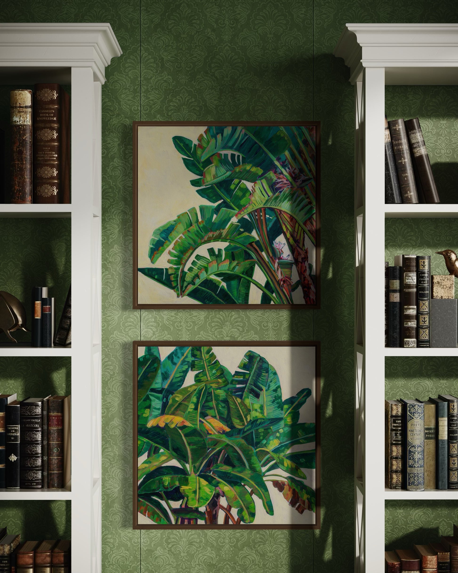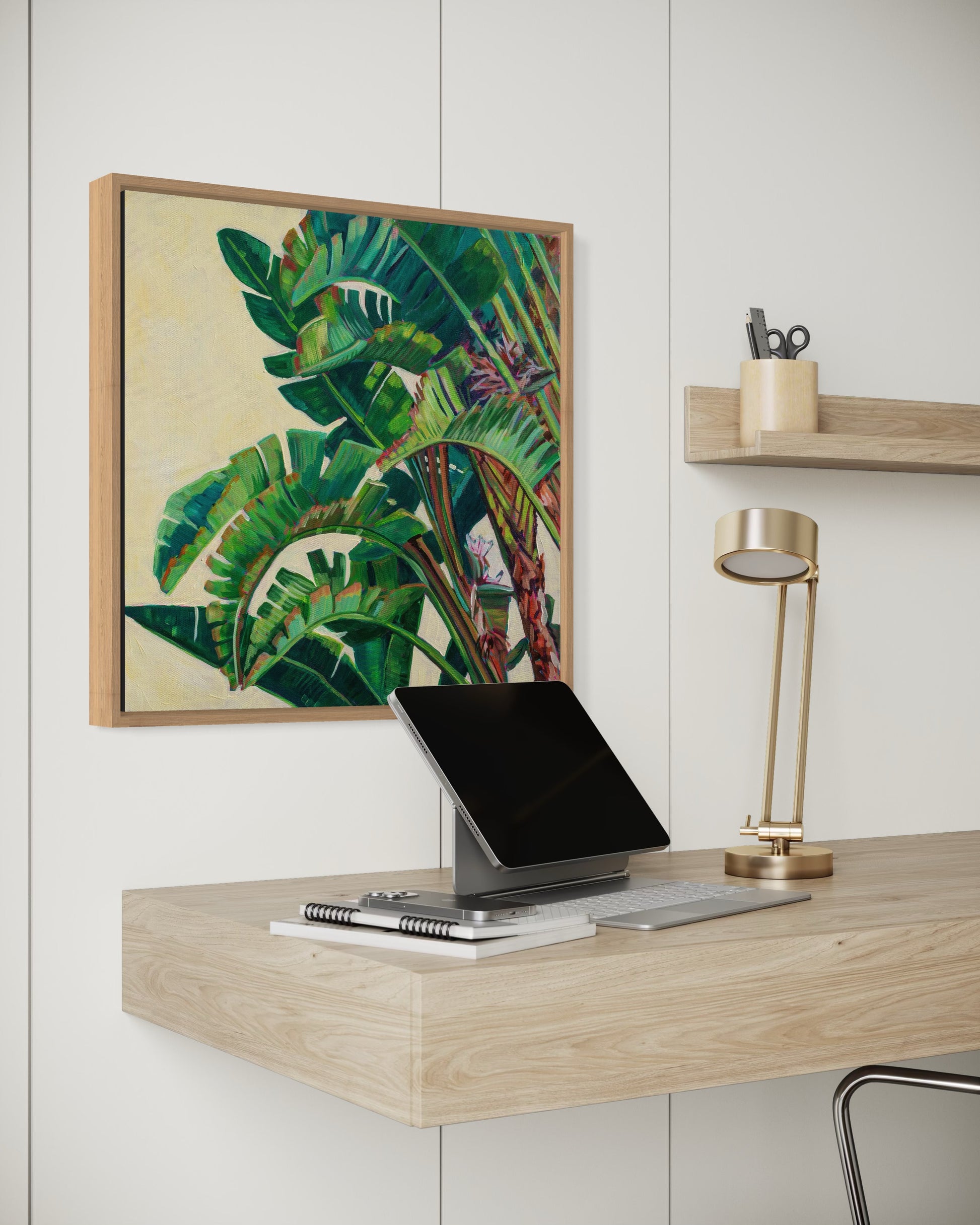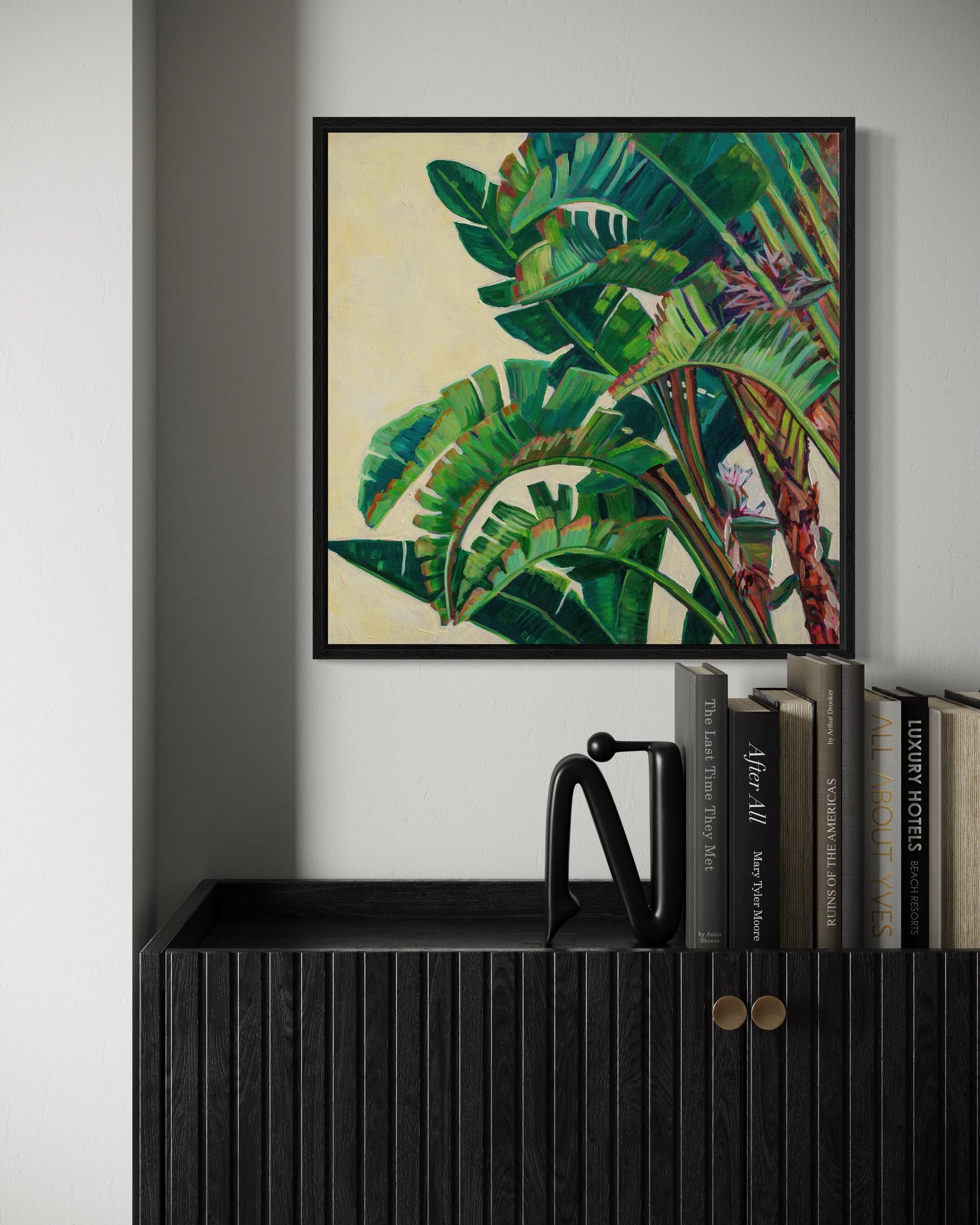 This original acrylic painting, measuring 20x20 inches on gallery-wrapped canvas, extends beautifully over the edges, providing a seamless visual experience. It offers a detailed view of a tropical giant bird of paradise plant, with vibrant colors and painterly strokes that accentuate its shape while engaging with positive and negative space. The result is a striking and dynamic piece that brings a touch of tropical allure to any room.