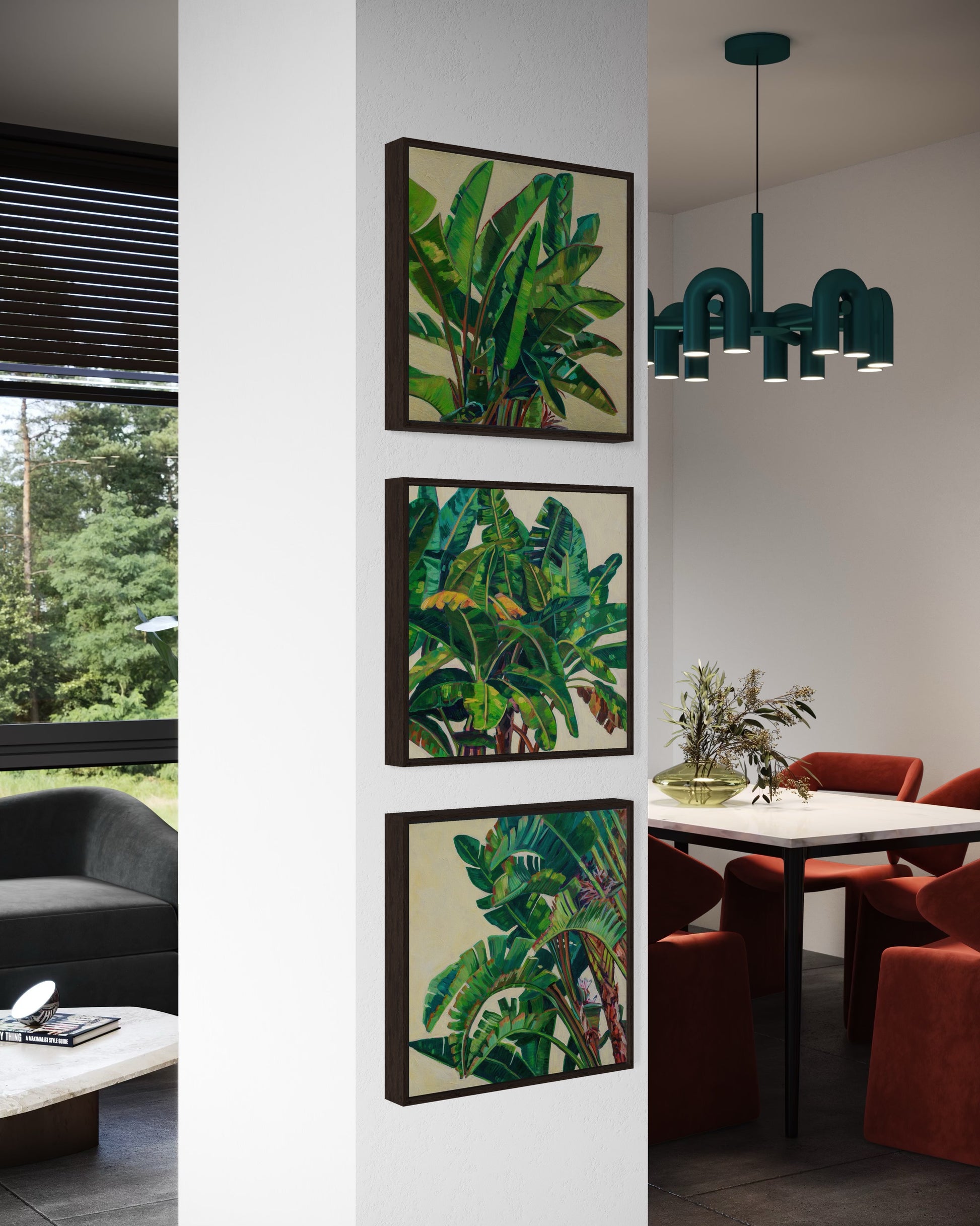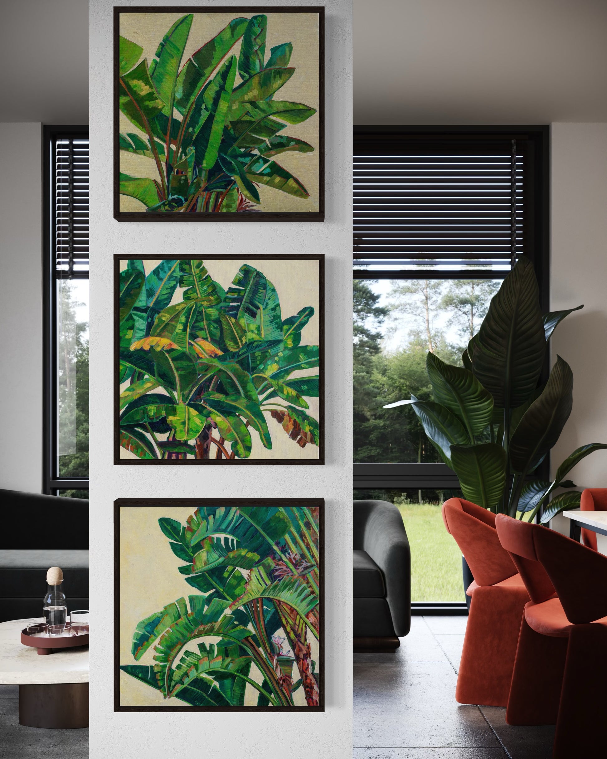 This original acrylic painting, measuring 20x20 inches on gallery-wrapped canvas, extends beautifully over the edges, providing a seamless visual experience. It offers a detailed view of a group of small banana trees, with vibrant colors and painterly strokes that accentuate its shape while engaging with positive and negative space. The result is a striking and dynamic piece that brings a touch of tropical allure to any room.