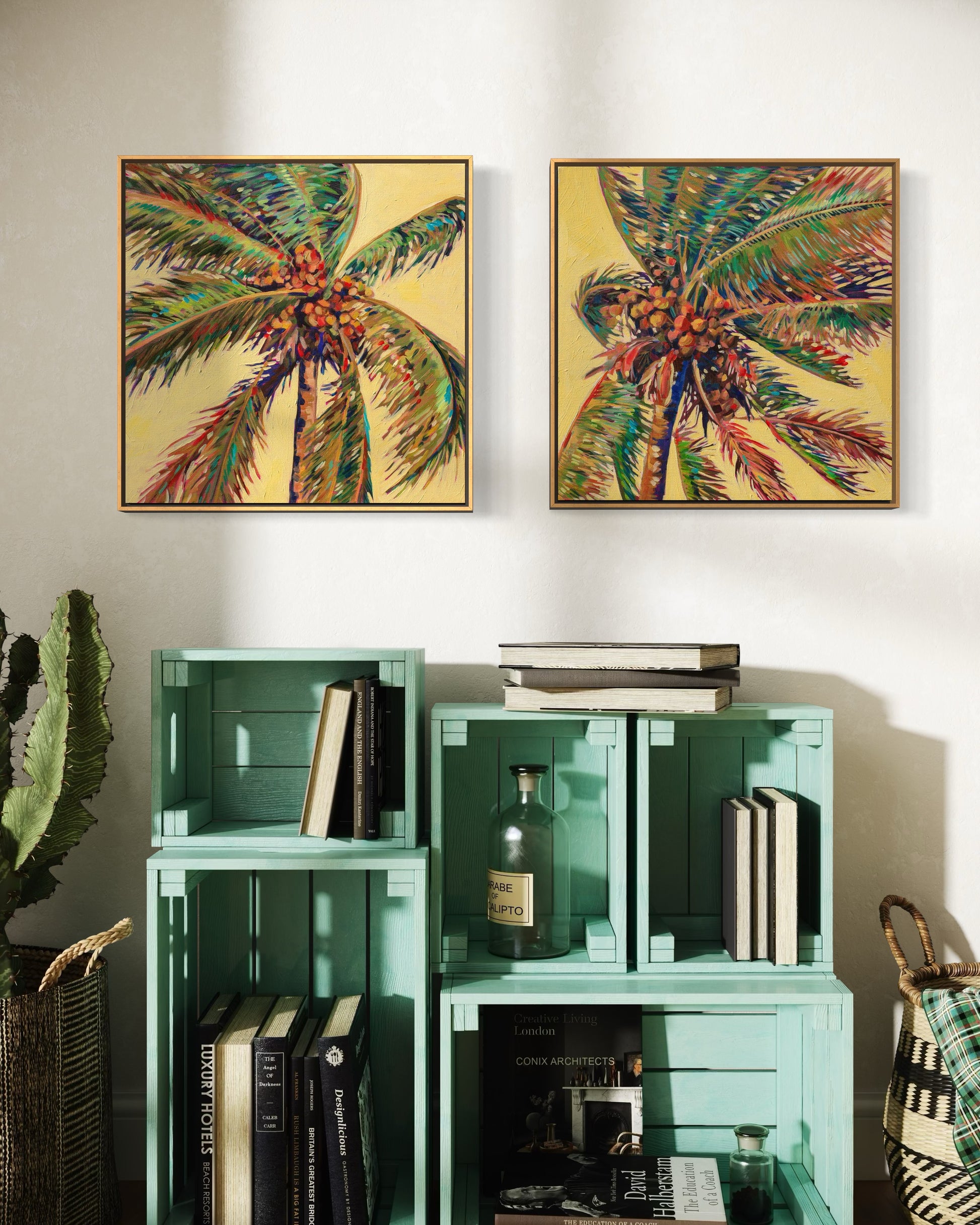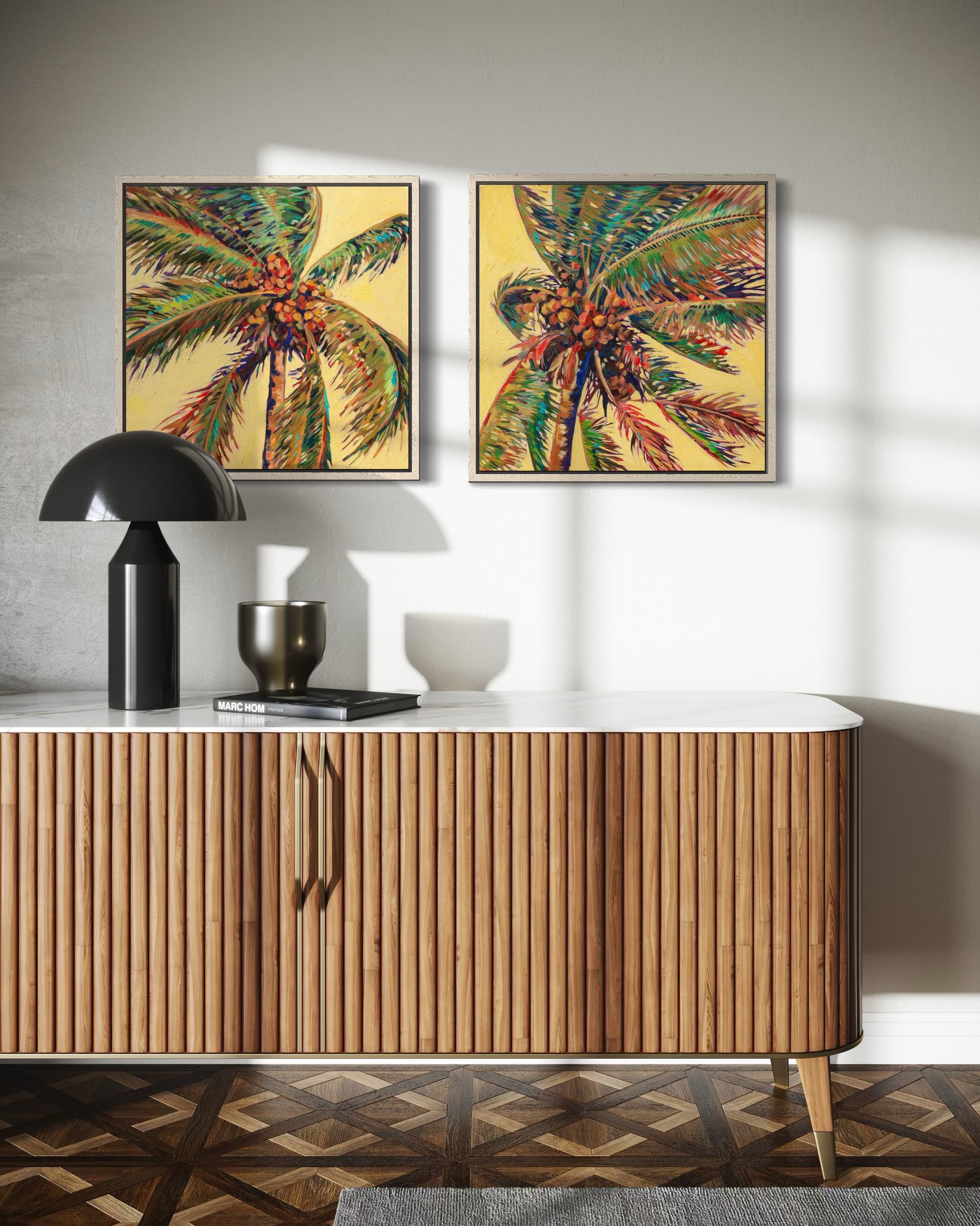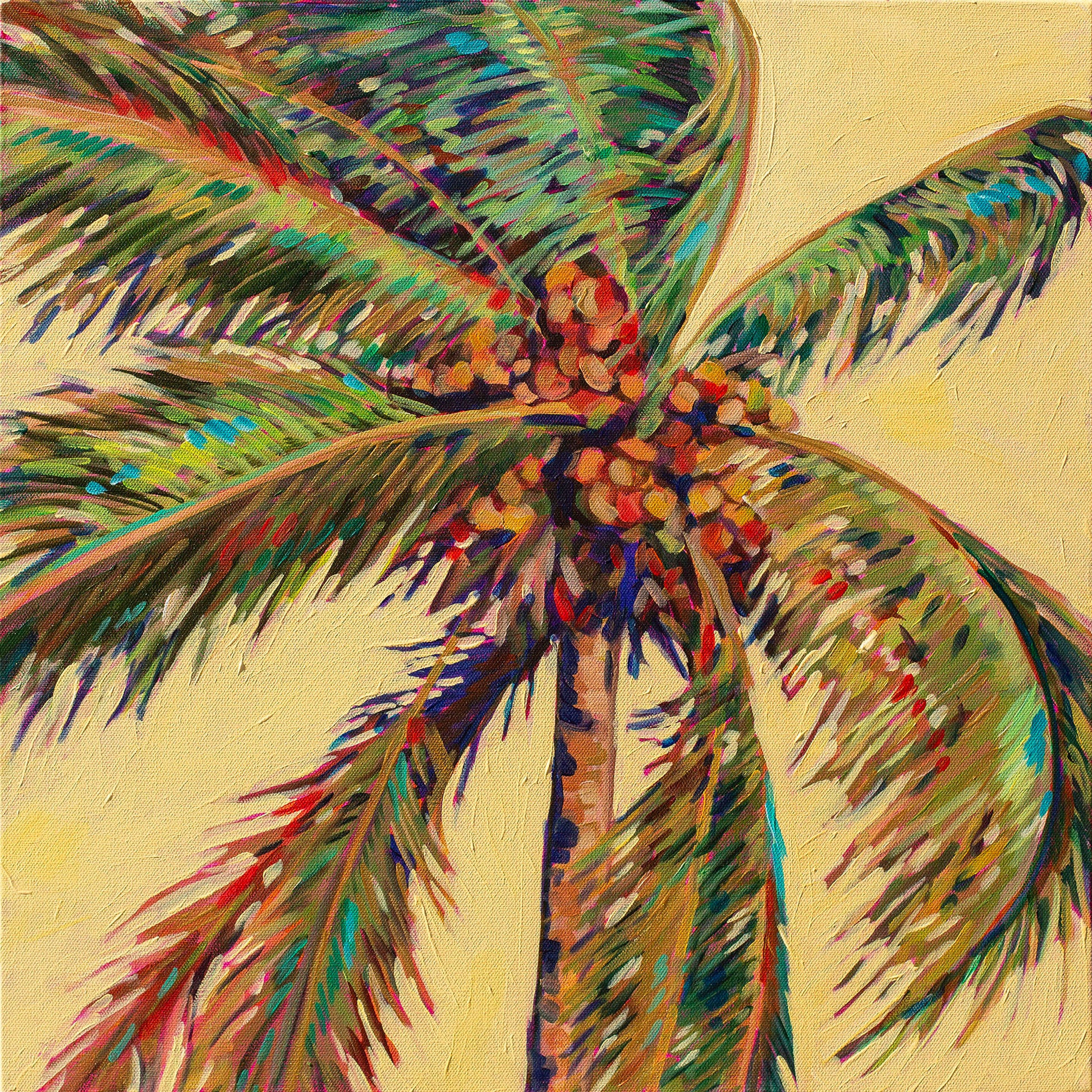 This original acrylic painting, measuring 20x20 inches on gallery-wrapped canvas, extends beautifully over the edges, providing a seamless visual experience. It offers a detailed view of a Coconut palm tree, with vibrant colors and painterly strokes that accentuate its shape while engaging with positive and negative space and a vibrant yellow background. The result is a striking and dynamic piece that brings a touch of tropical allure to any room. This is one of two, pick your favorite or pair them together for a perfect tropical statement.