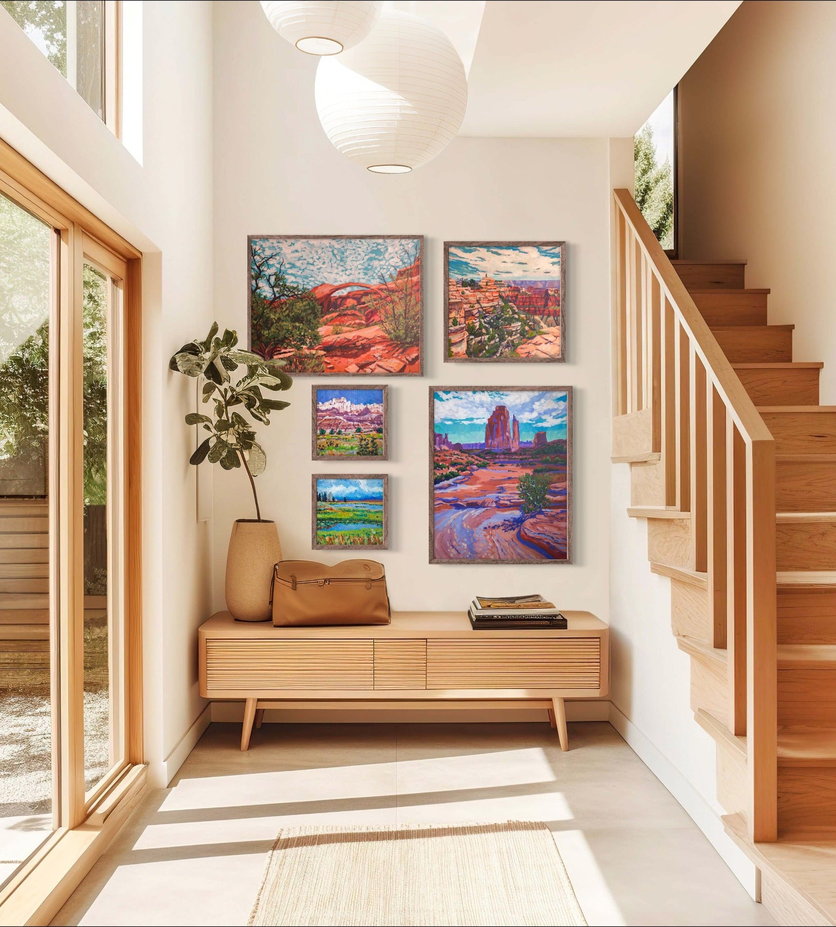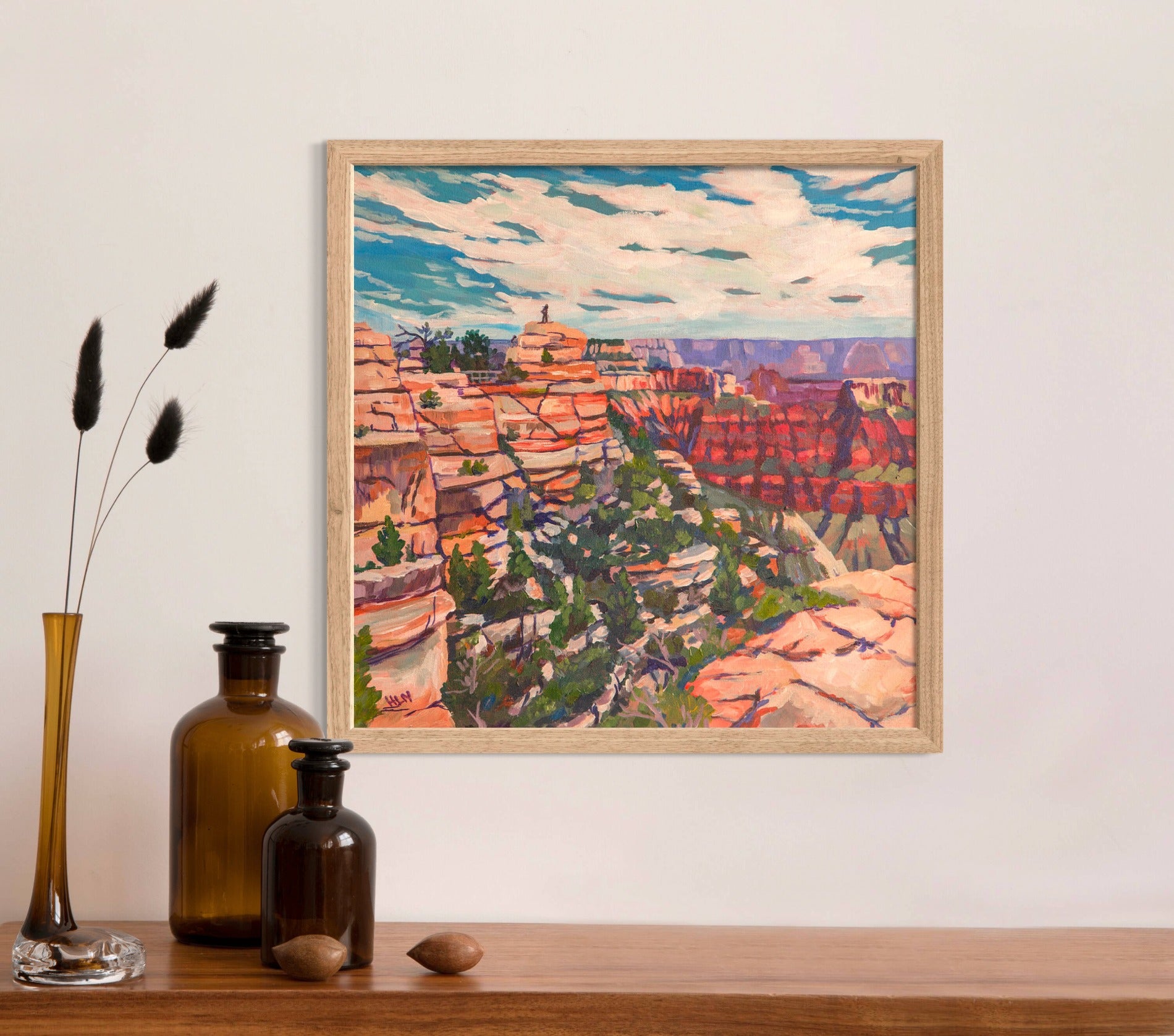 This original painting, measuring 20x20 inches, captures a moment from our hike down the Bright Angel Trail on the North Rim of the Grand Canyon National Park. The vastness of the Grand Canyon makes it challenging to fully grasp its scale, but this painting focuses on a specific part of the landscape. While my kids climbed various rocks for better views, a stranger kindly shared a photo of my daughter standing at the top of the world. The square format of the painting emphasizes a single, compelling view amidst the grandeur of the canyon, reflecting the beauty and scale of the Southwest United States. Painted in acrylic on canvas, it is a vivid tribute to our memorable trip.