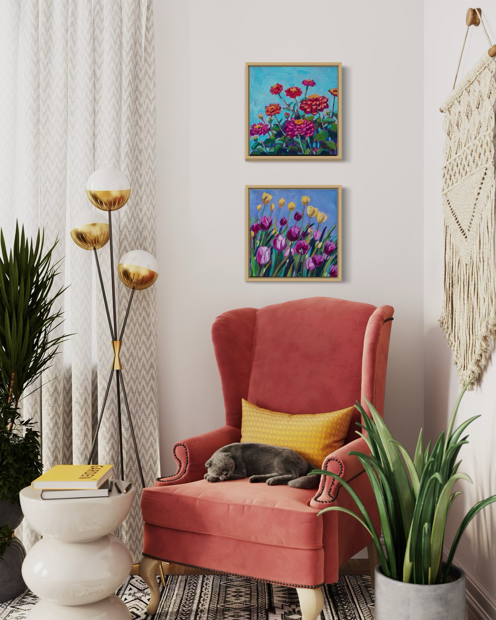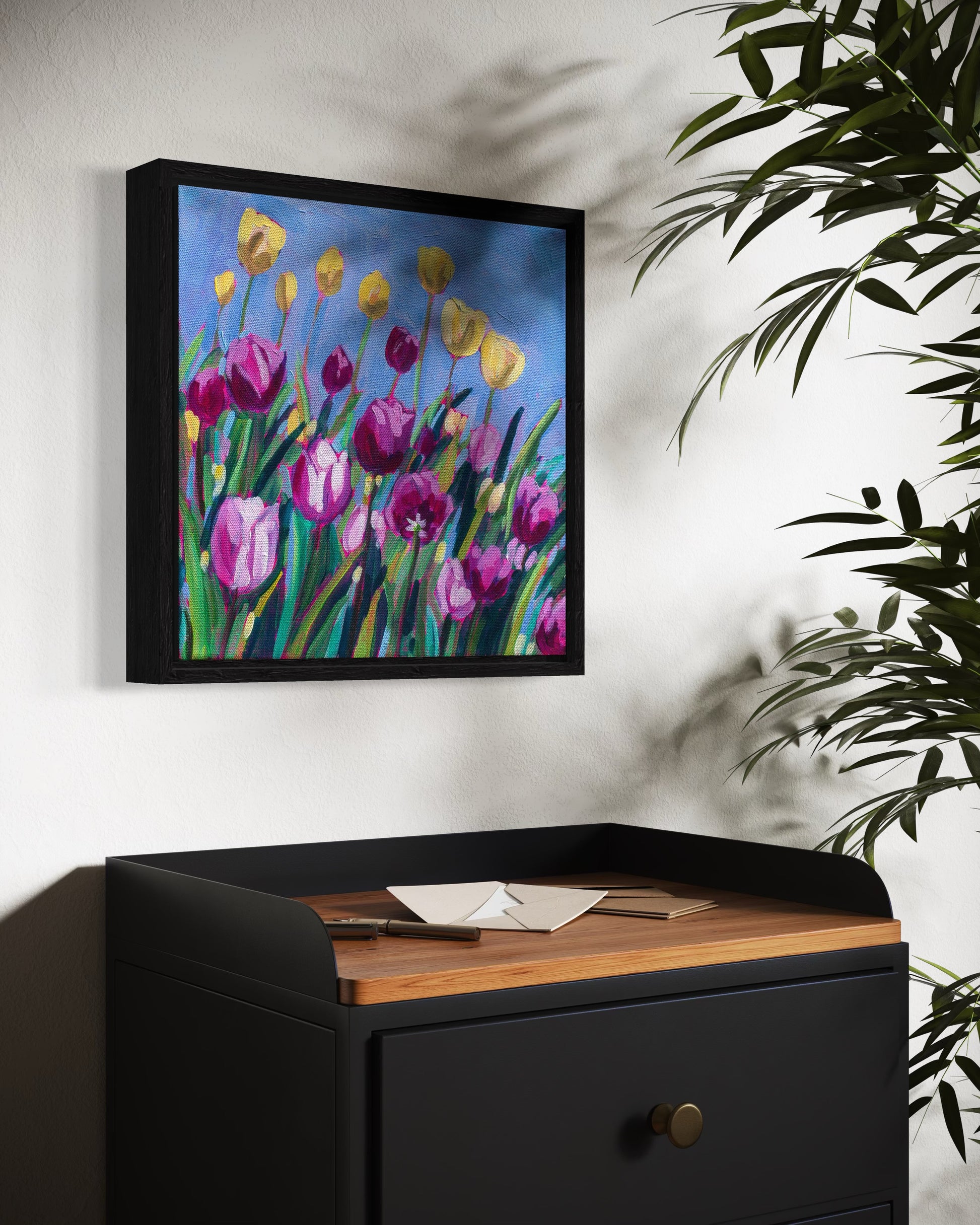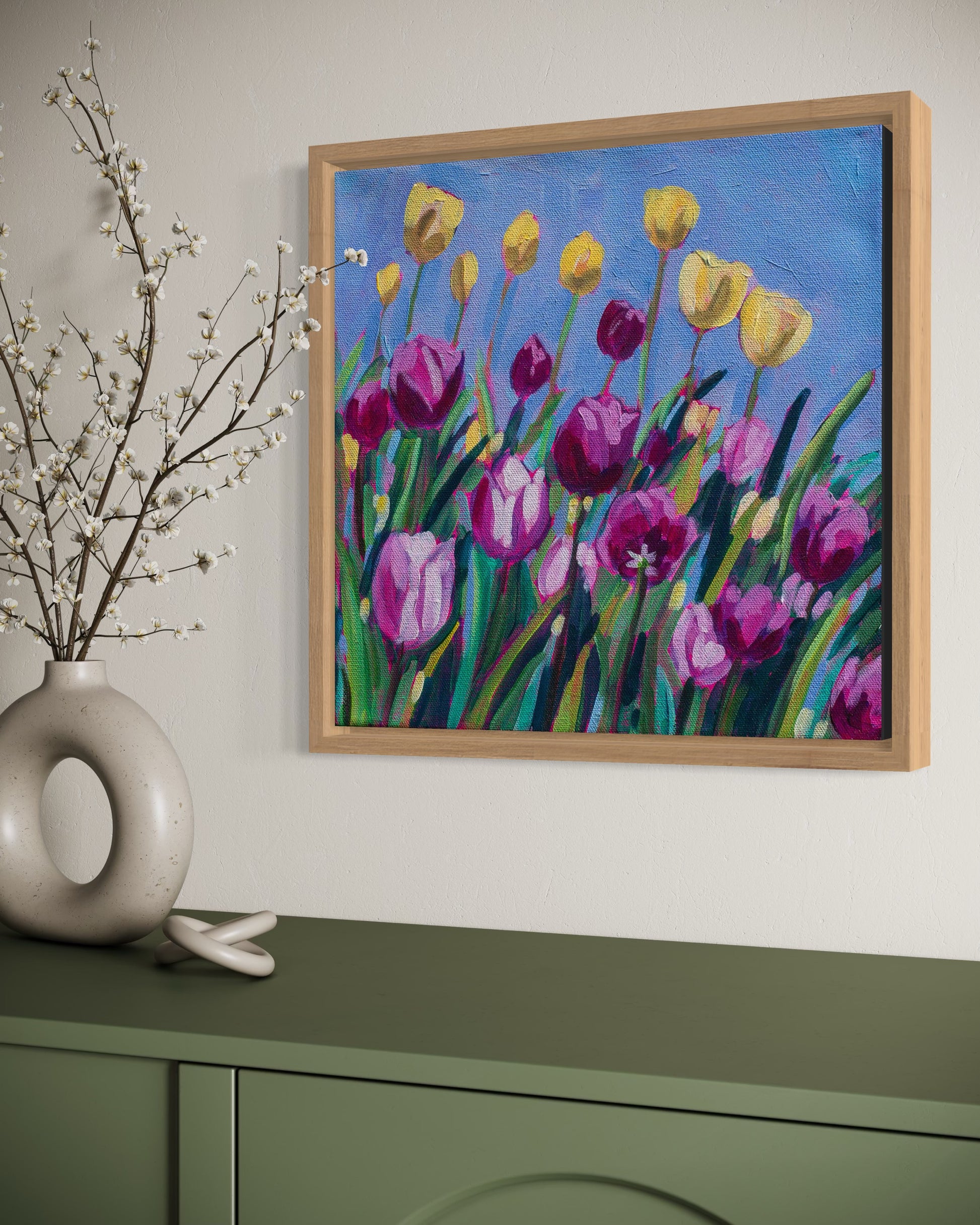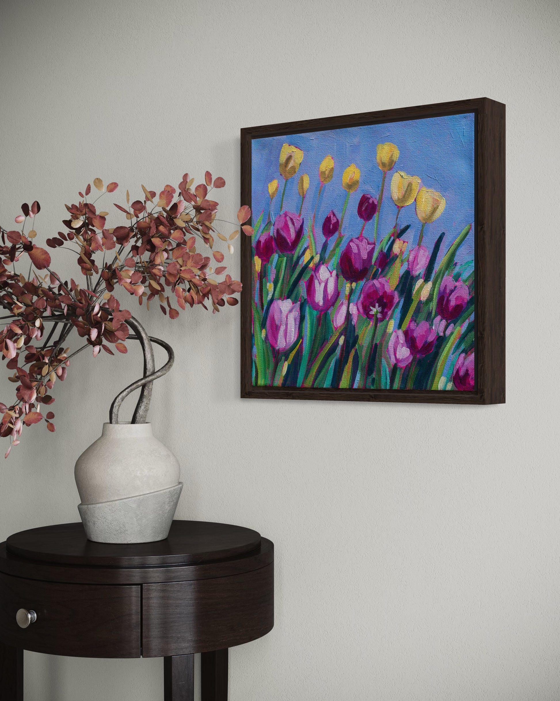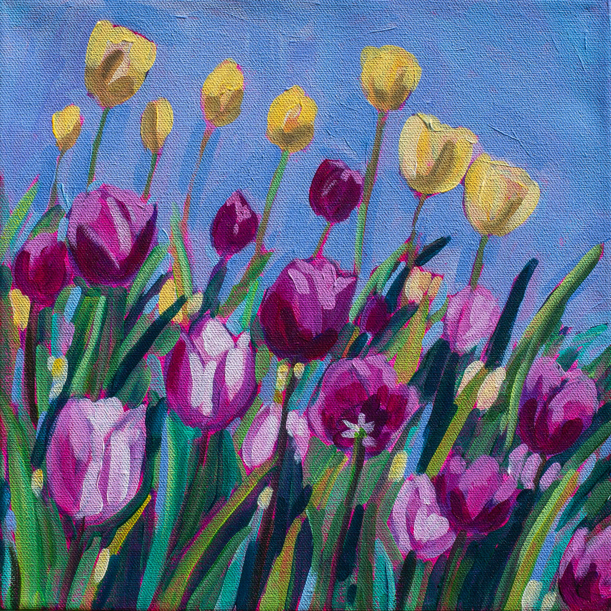 This 12x12 acrylic on canvas painting features a lively field of tulips in full bloom. The composition is filled with upward-reaching blossoms, painted in rich shades of magenta, deep pink, and soft lavender, contrasted beautifully with bright yellow tulips that seem to dance against a cool blue sky.