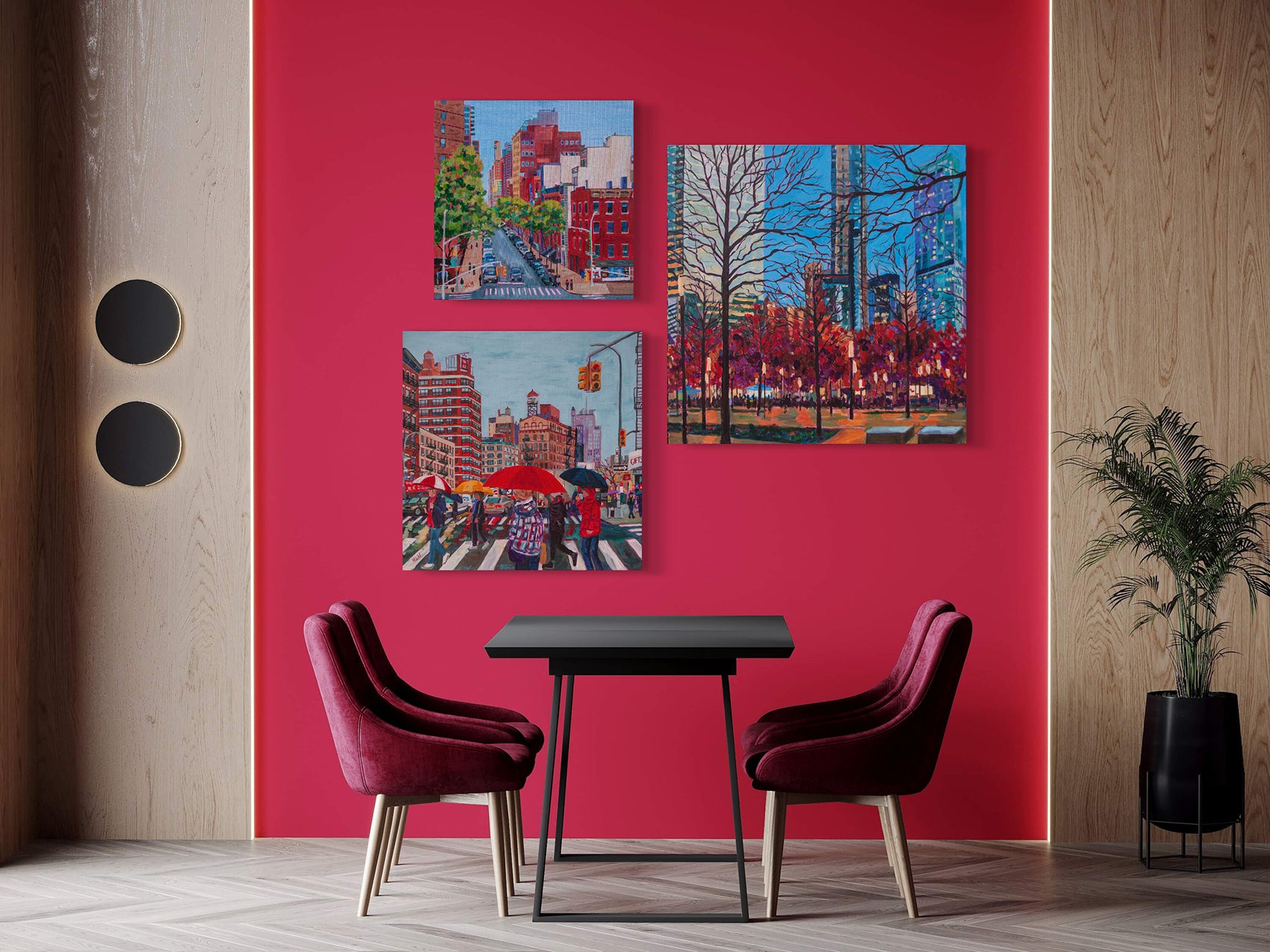 This original painting measures 24x24 inches. It captures a rainy day in the vibrant Chinatown area of Manhattan, where despite the weather, the streets remain bustling with people going about their business. The wet pavement reflects the glow of car lights, adding to the lively atmosphere of New York City. The scene depicts the intersection of Canal Street and Mulberry Street, showcasing the unique energy and charm of this iconic neighborhood.