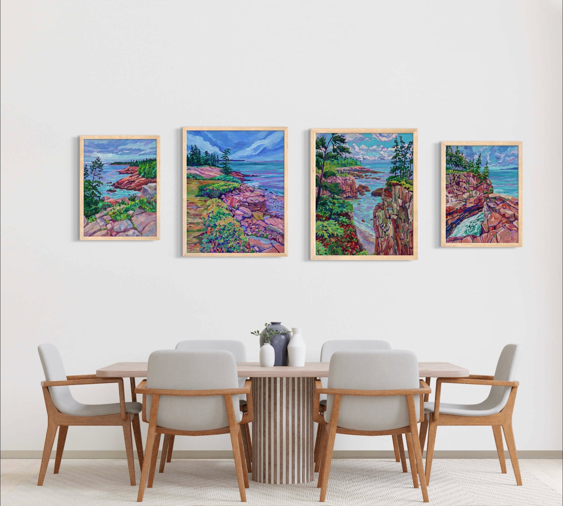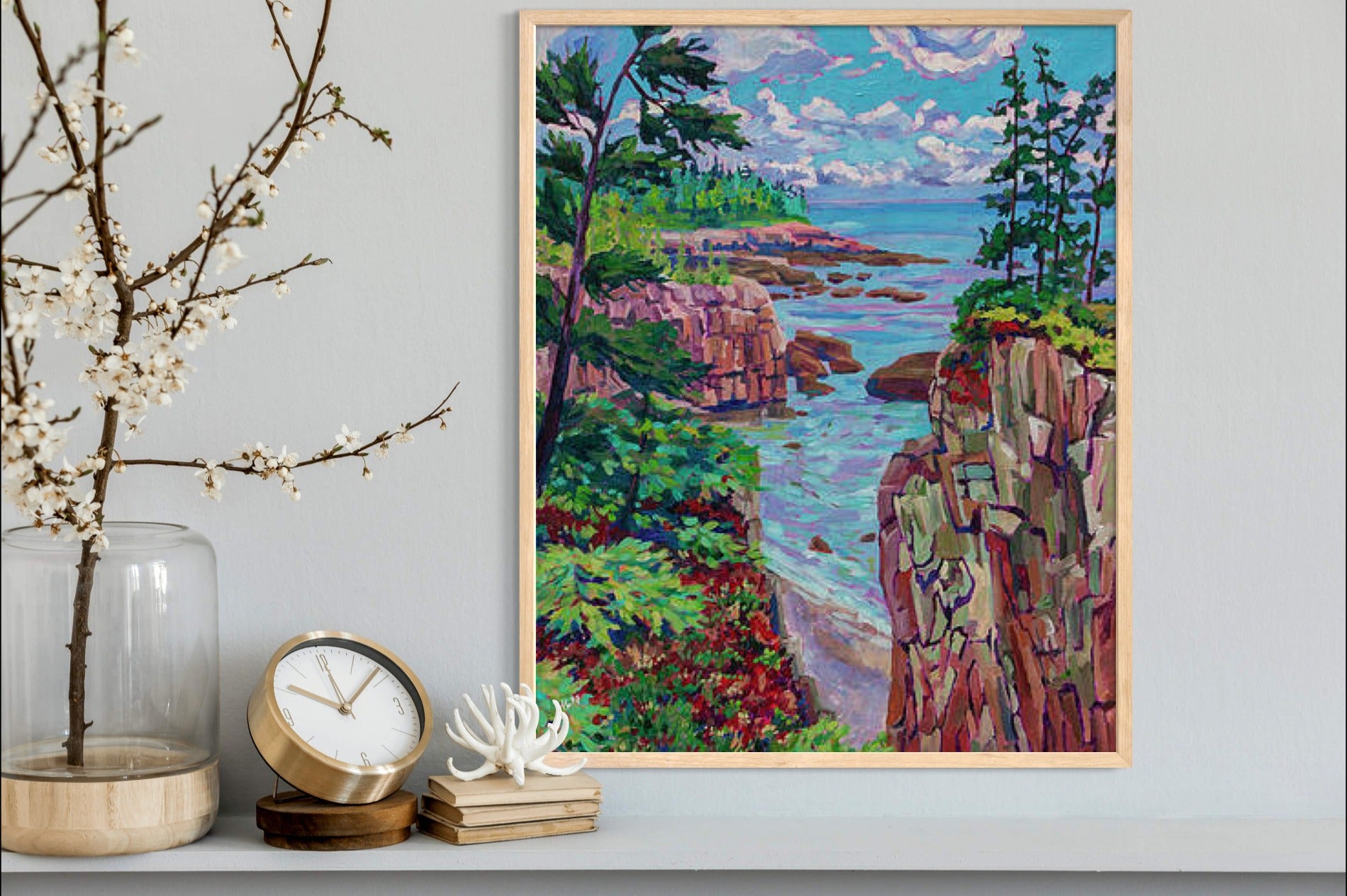 This original acrylic painting, measuring 24x30 inches, showcases the vibrant beauty of Acadia National Park in Maine through impressionist brushwork. It features Raven's Nest, a hidden gem on the Schoodic Peninsula that often goes unnoticed by visitors. This less-traveled spot, part of Acadia National Park, offers a dramatic view where high tide causes the water to rush up with a thunderous roar. The painting captures the rugged charm of this small cliffside path, highlighting its unique, lesser-known beauty. The vivid colors and dynamic brushstrokes evoke the powerful natural elements and the adventurous spirit required to explore this stunning location.