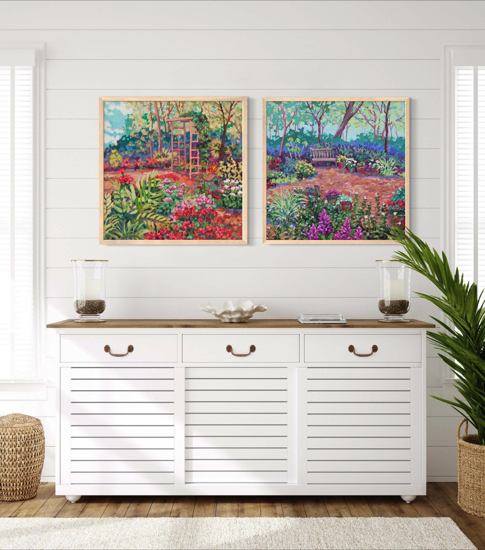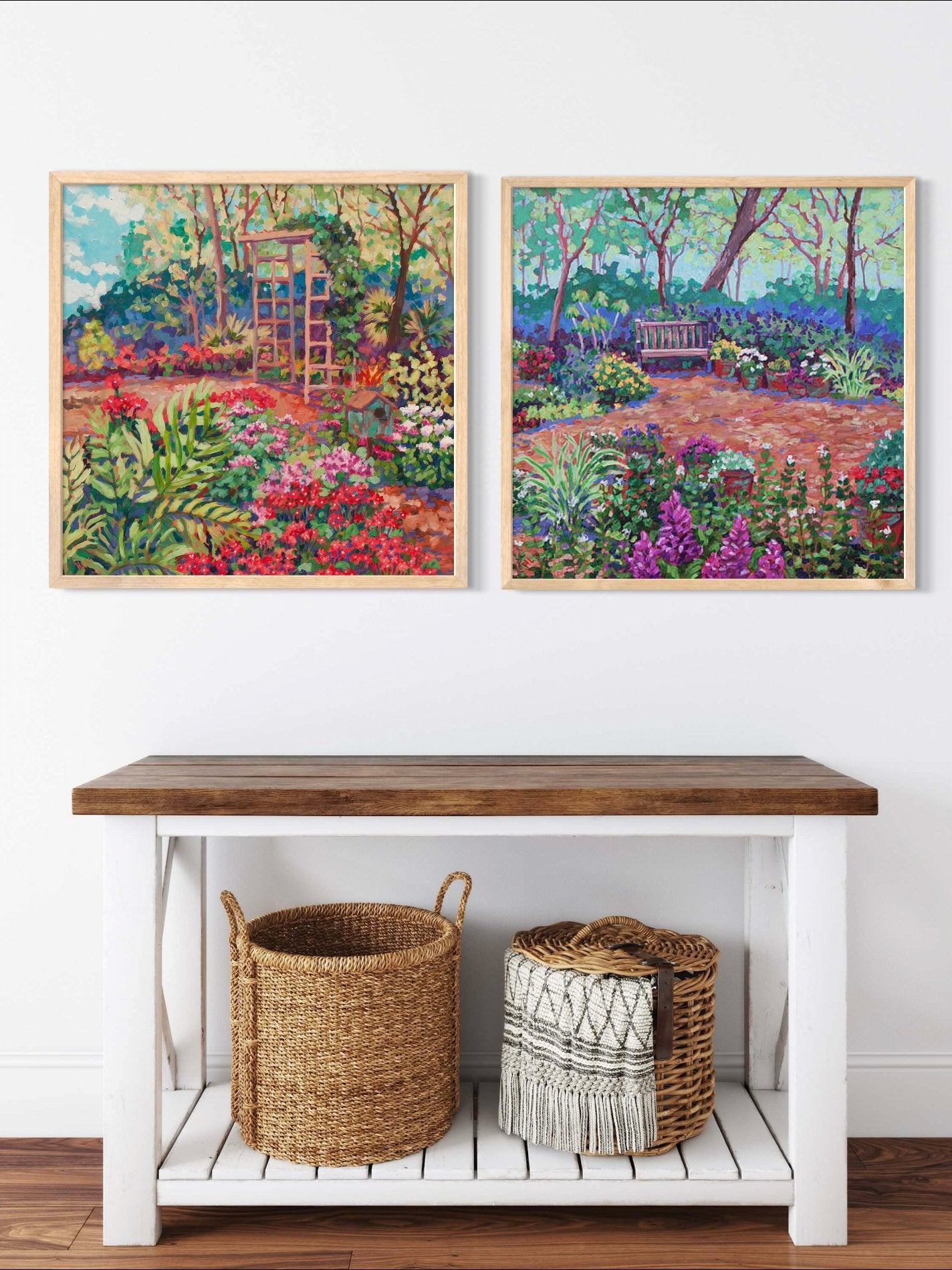 This original painting, measuring 24x24 inches, is ready to hang with its wired back and protective varnish coating. The gallery-wrapped canvas features painted edges, allowing it to be displayed with or without a frame.
