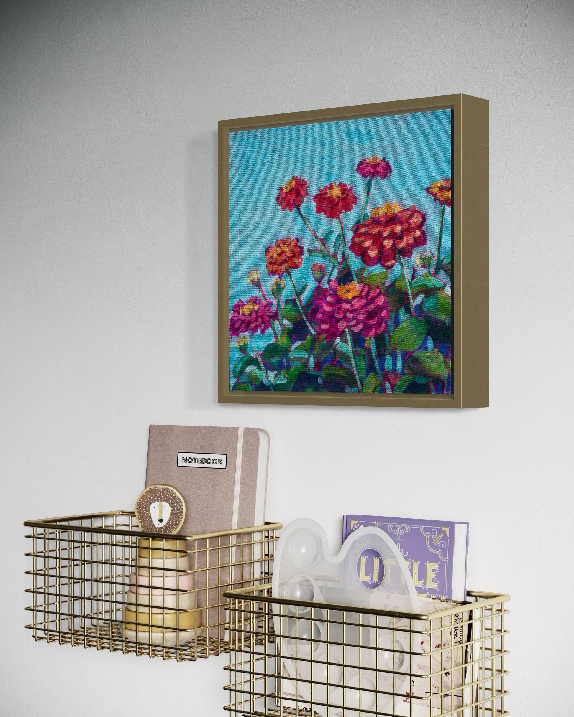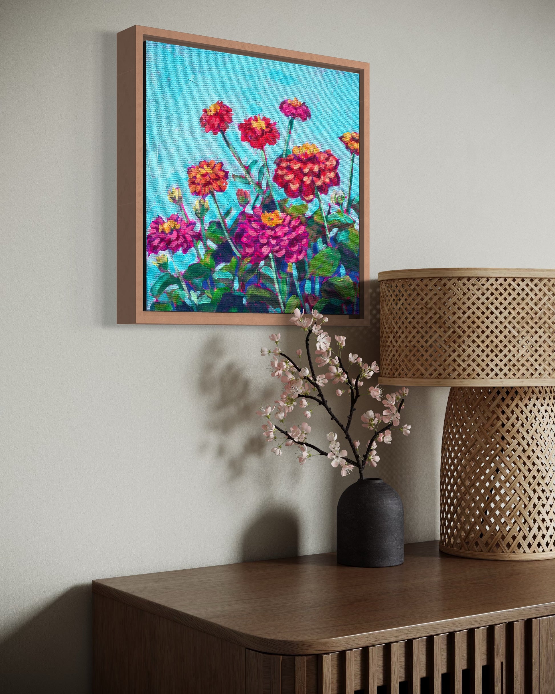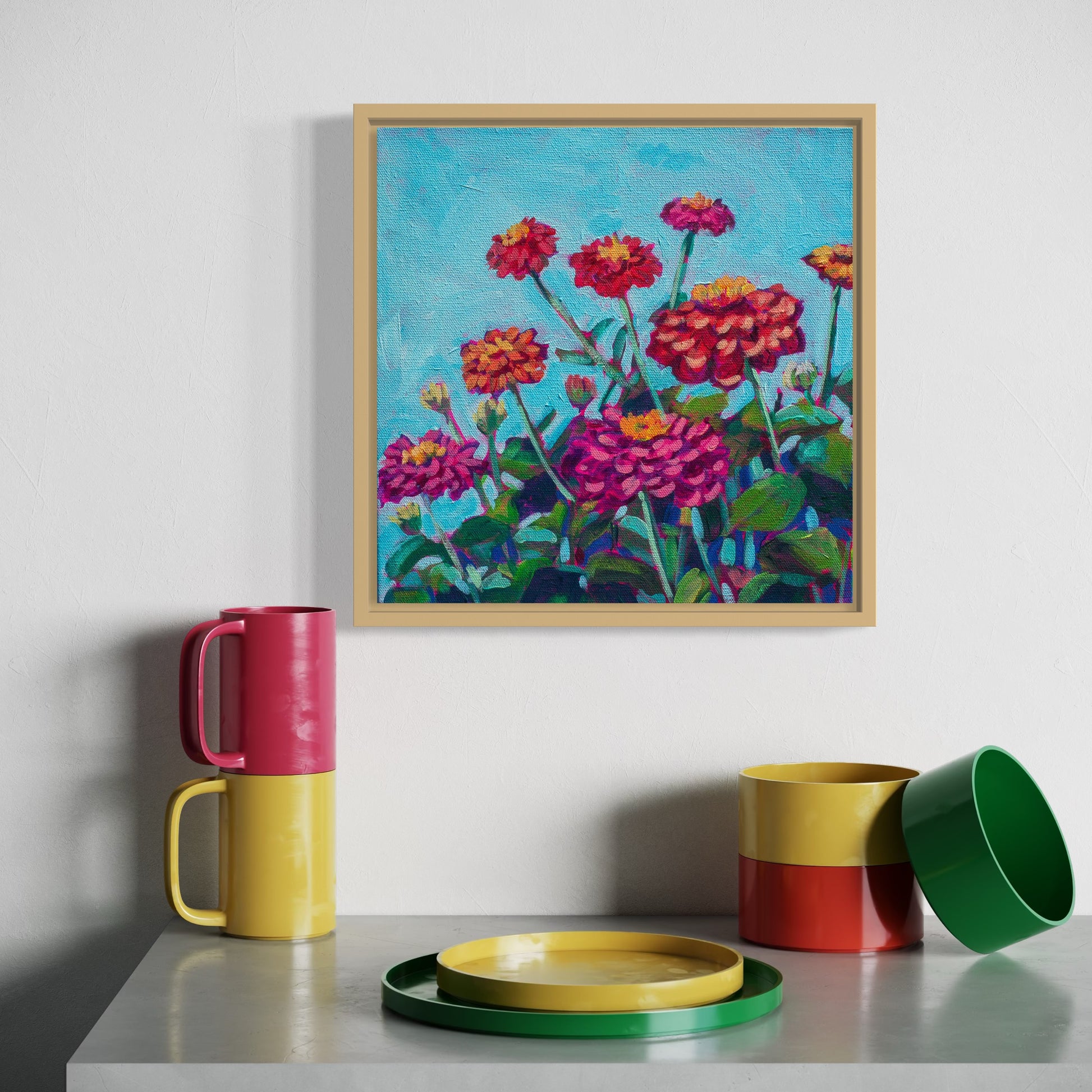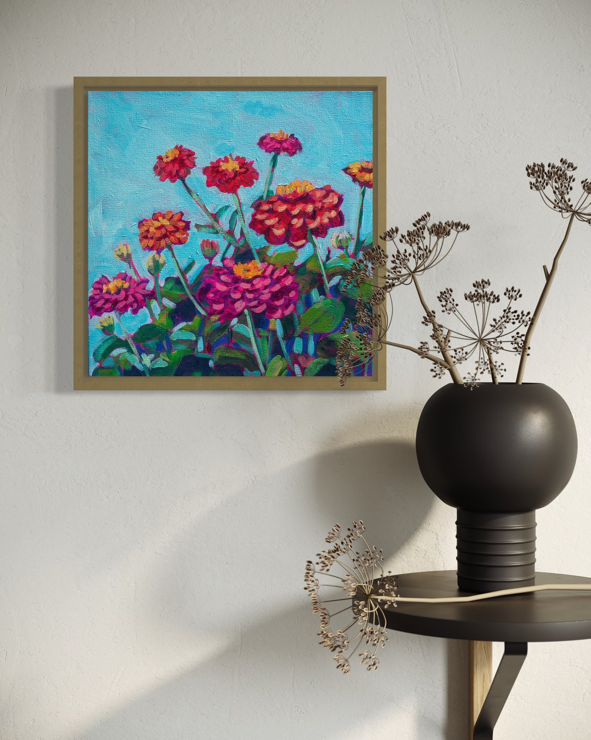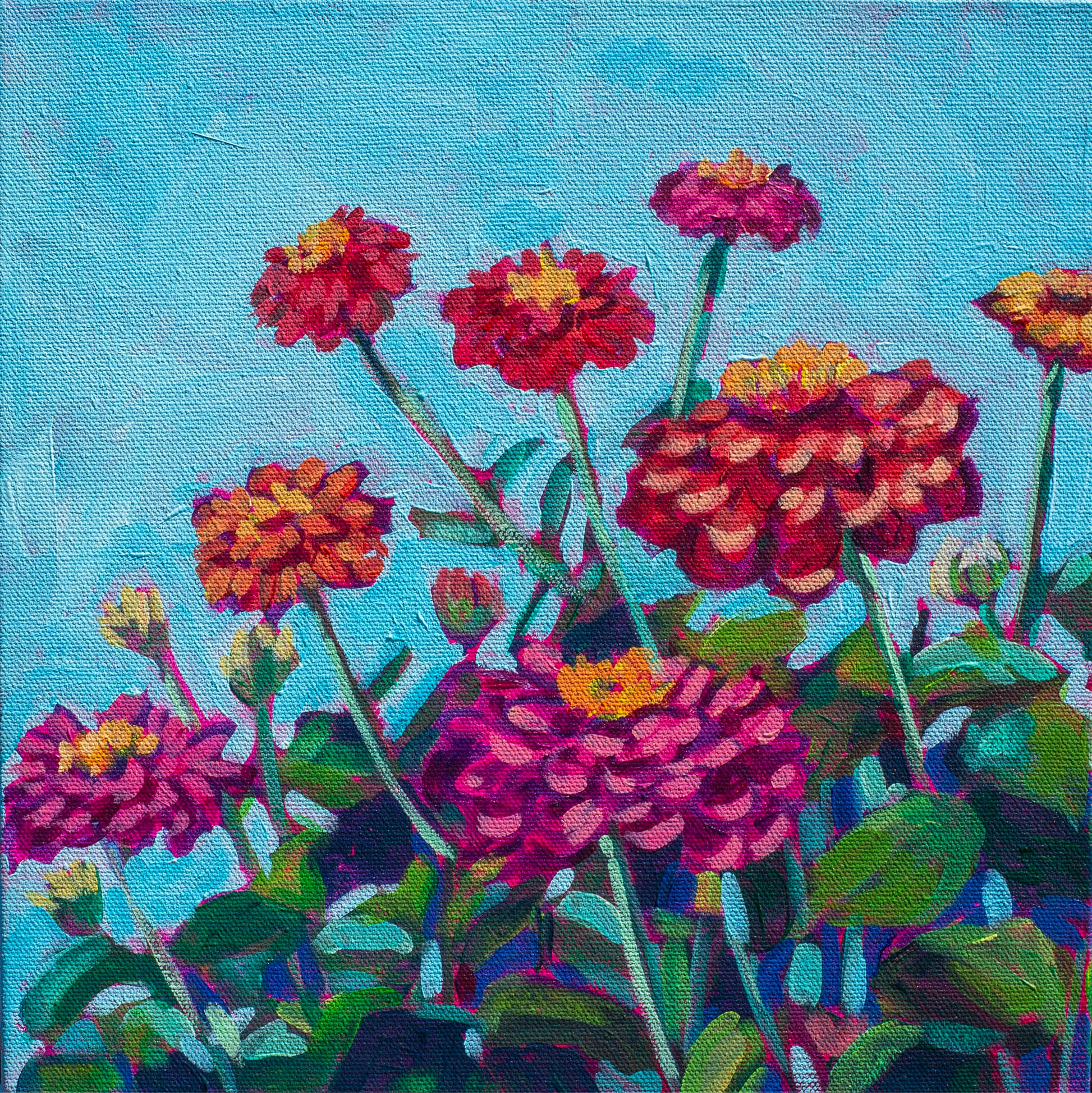 This vibrant painting of zinnias captures the joyful energy of blooming flowers through a blend of realism and impressionistic techniques. The zinnias, depicted in vivid shades of red, magenta, orange, and yellow, stand out boldly against a light blue background, creating a striking contrast. Their layered petals and varied stages of bloom—from tight buds to full blossoms—add a sense of life and movement to the composition. Bold, expressive brushstrokes bring texture to the green leaves and stems, while the visible canvas weave enhances the tactile quality of the artwork. The piece uses strong color contrasts and a rich palette to convey a cheerful, sunlit atmosphere, with a slightly abstract touch in the color layering and outlines that keeps the scene both recognizable and artistically dynamic.