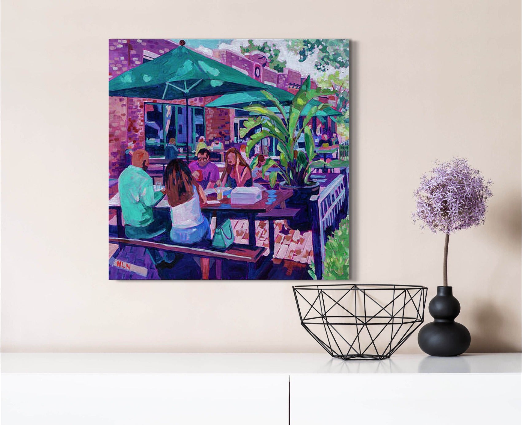 This original 20x20-inch painting captures the yearning for connection and normalcy amidst the changes and uncertainties of the pandemic. Inspired by Downtown Winter Garden, where street parking was repurposed to create more seating and foster a sense of community, this piece reflects the effort to step out of our bubbles and engage with others.