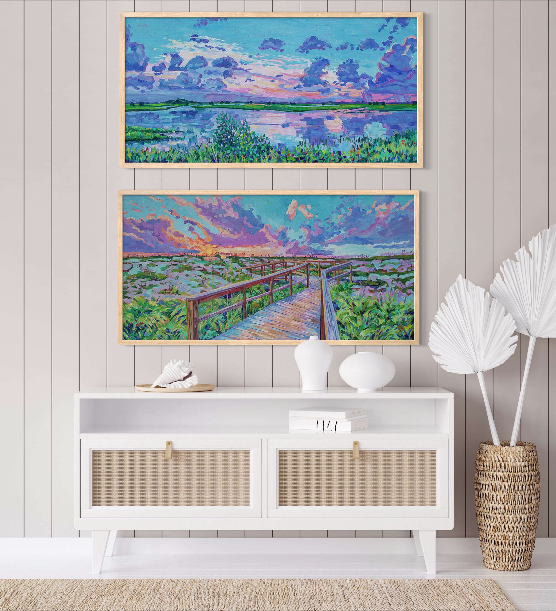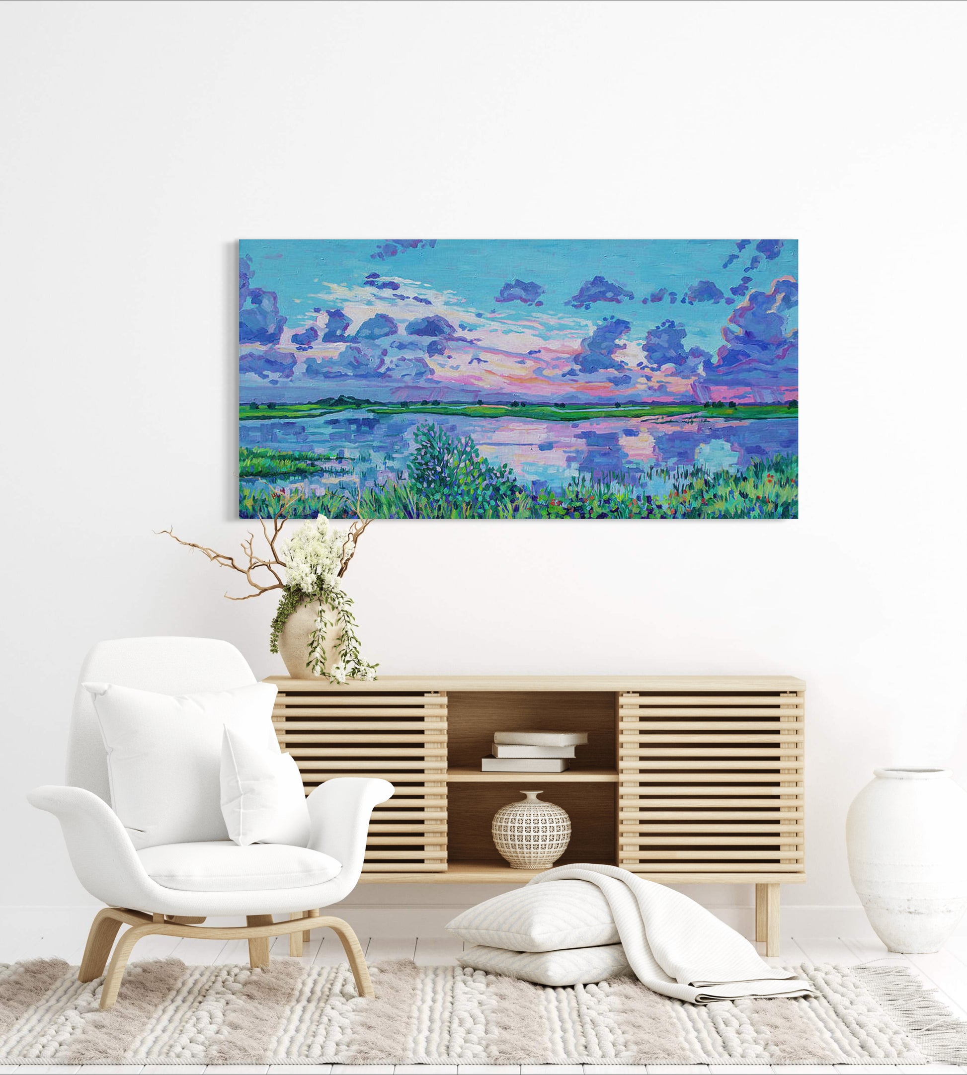 This original painting, measuring 24x48 inches, captures a fleeting moment as the clouds gathered and we hurried down the road in search of the perfect sunset. Our detour down a side road led us to an ideal spot overlooking vast wetlands. The scene unfolds with meandering streams cutting through lush water plants, fish leaping gracefully, and the sun making its final, spectacular descent. The tranquil expanse of the wetlands and the fading light create a serene and picturesque finale to the day.