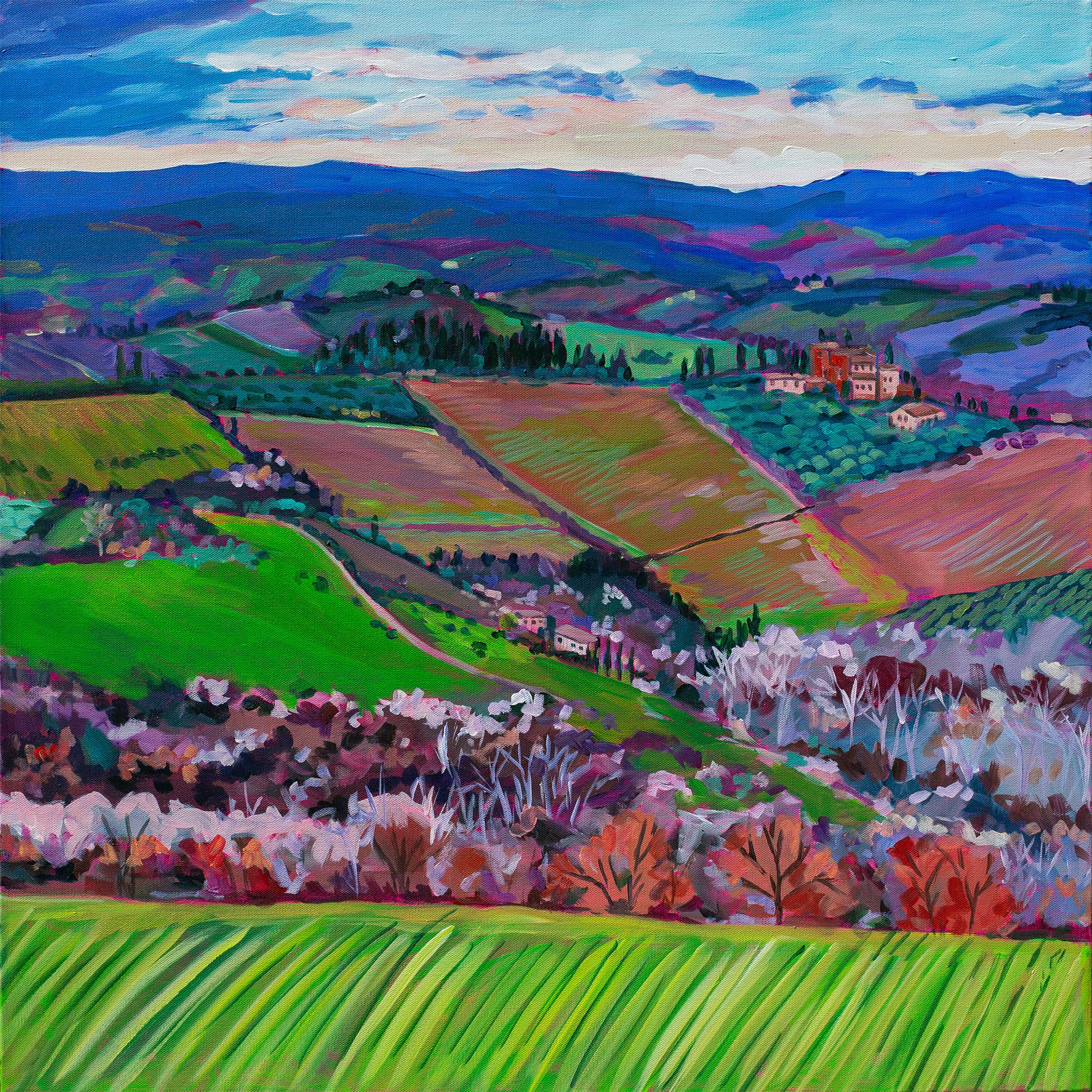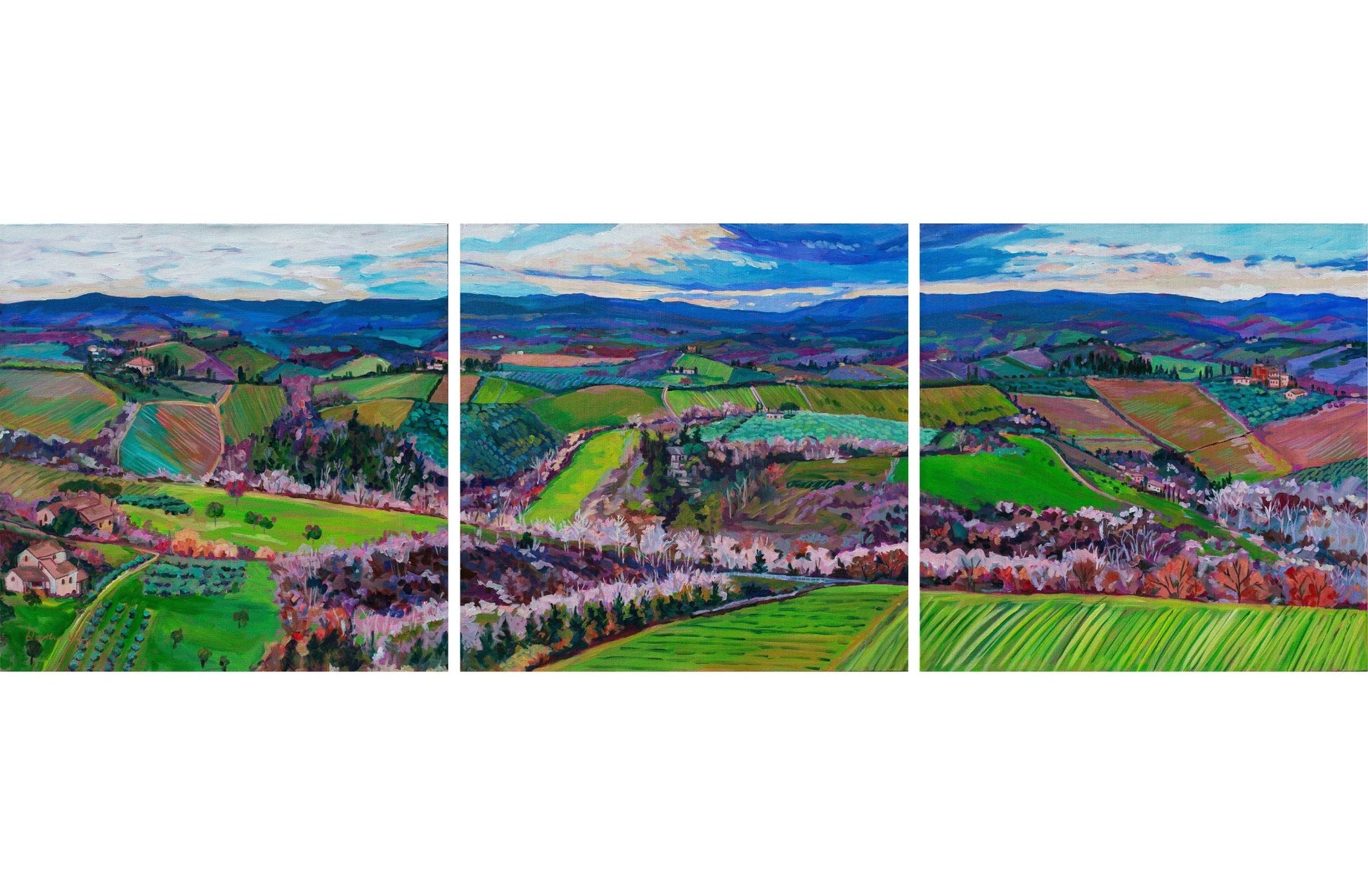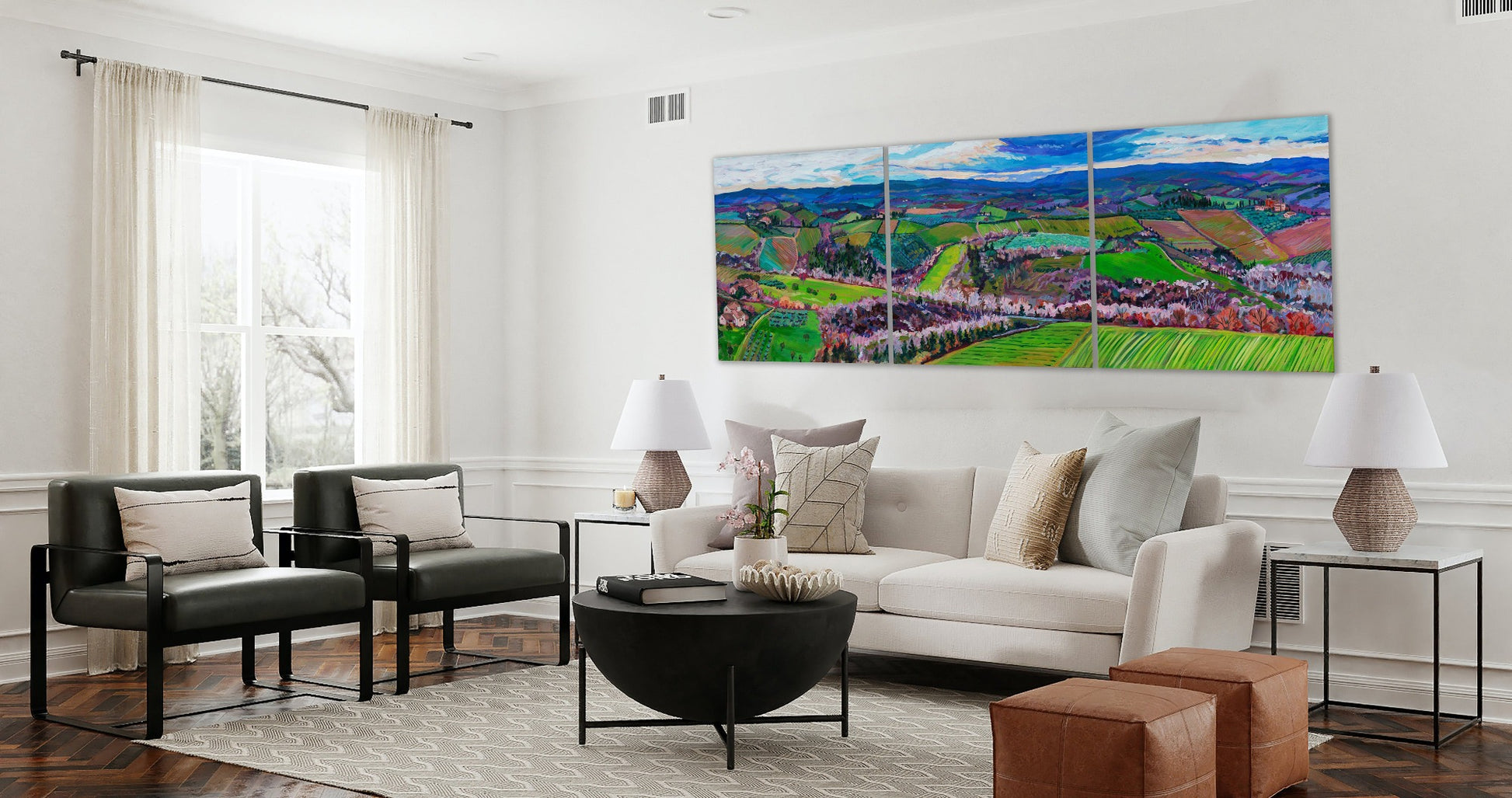 This original vibrant acrylic painting consists of three 30x30 inch gallery-wrapped canvases, creating a total length of 90 inches (7.5 feet). It features a peaceful panoramic view from the hillside town of San Gimignano, capturing the rolling hills of Tuscan farmland. This makes it an ideal statement piece for any room, with cool greens, blues, and purples dominating the impressionist style, accentuated by loose brush strokes. The scene invites viewers to slow down and immerse themselves in the simple beauty of the Tuscan countryside as seen from San Gimignano.
