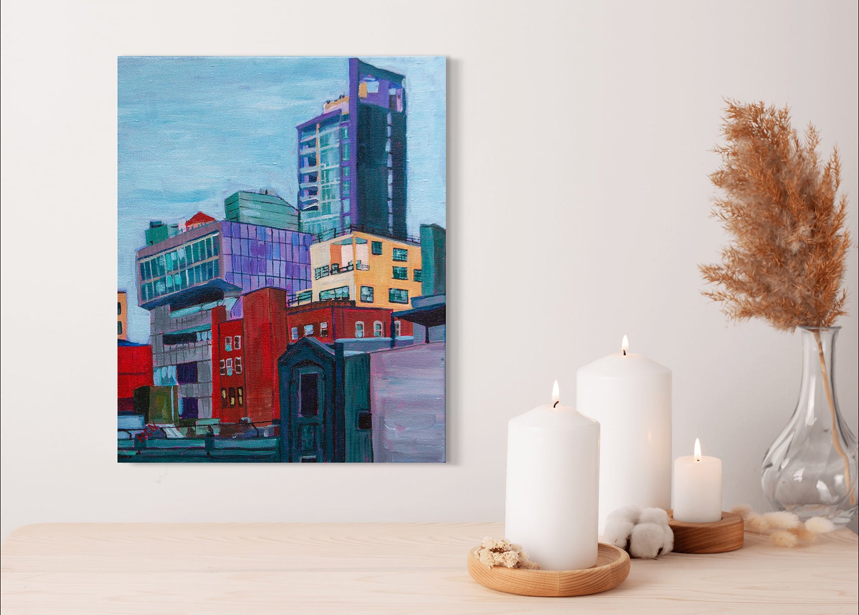 This original painting measures 11x14 inches. It captures the dynamic architectural landscape of New York City, where buildings of various sizes and shapes compete for space in the bustling metropolis. Inspired by a walk along the High Line, the artwork portrays the vibrant scene looking northwest towards 24th Street in the gallery district. The composition highlights overlapping buildings, diverse colors, intriguing shapes, and rich textures, encapsulating the essence of urban life in the city that never sleeps.