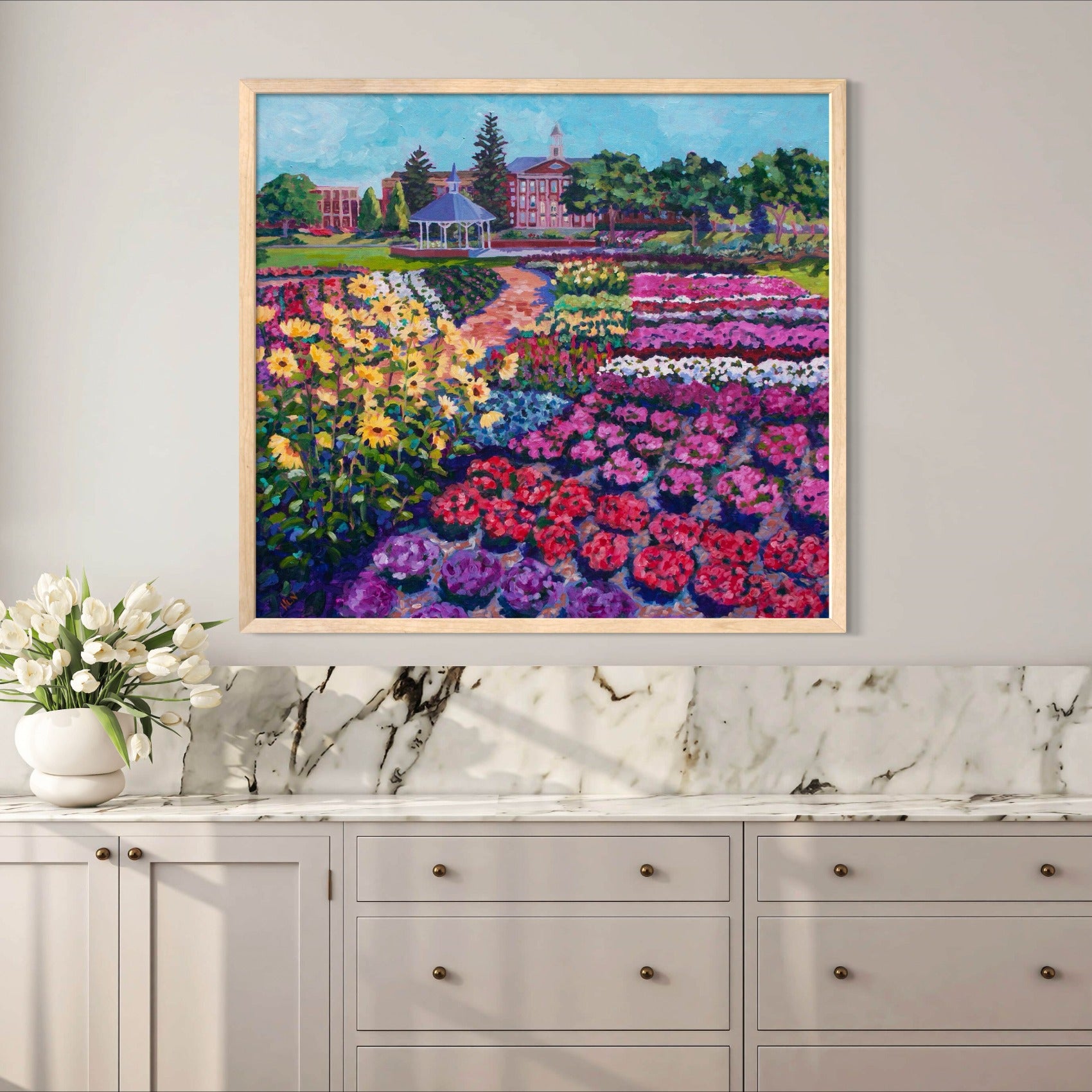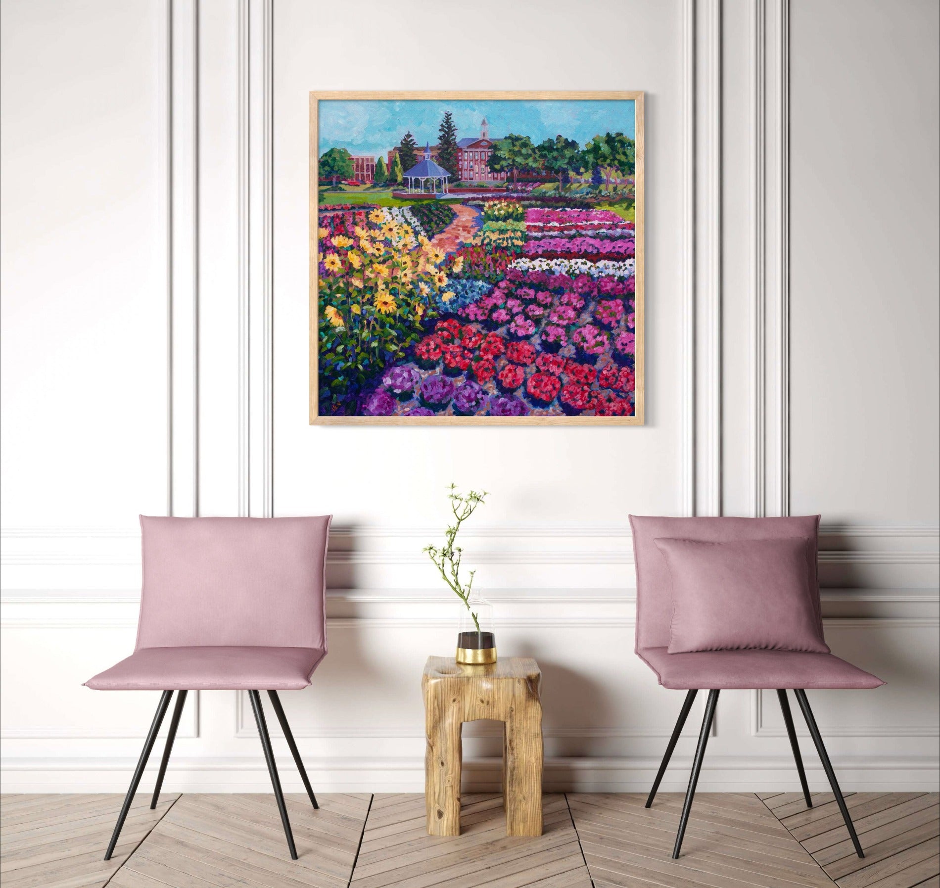 Inspired by the Flower Trial Garden at Colorado State University, this painting celebrates both the artistry and science of horticulture. The garden serves as a research project, planting flowers yearly to study their performance in the high plains and Rocky Mountain region. It embodies the intersection of beauty and science, where research observes and enhances floral growth, paralleling how gardeners appreciate and care for each plant’s needs.