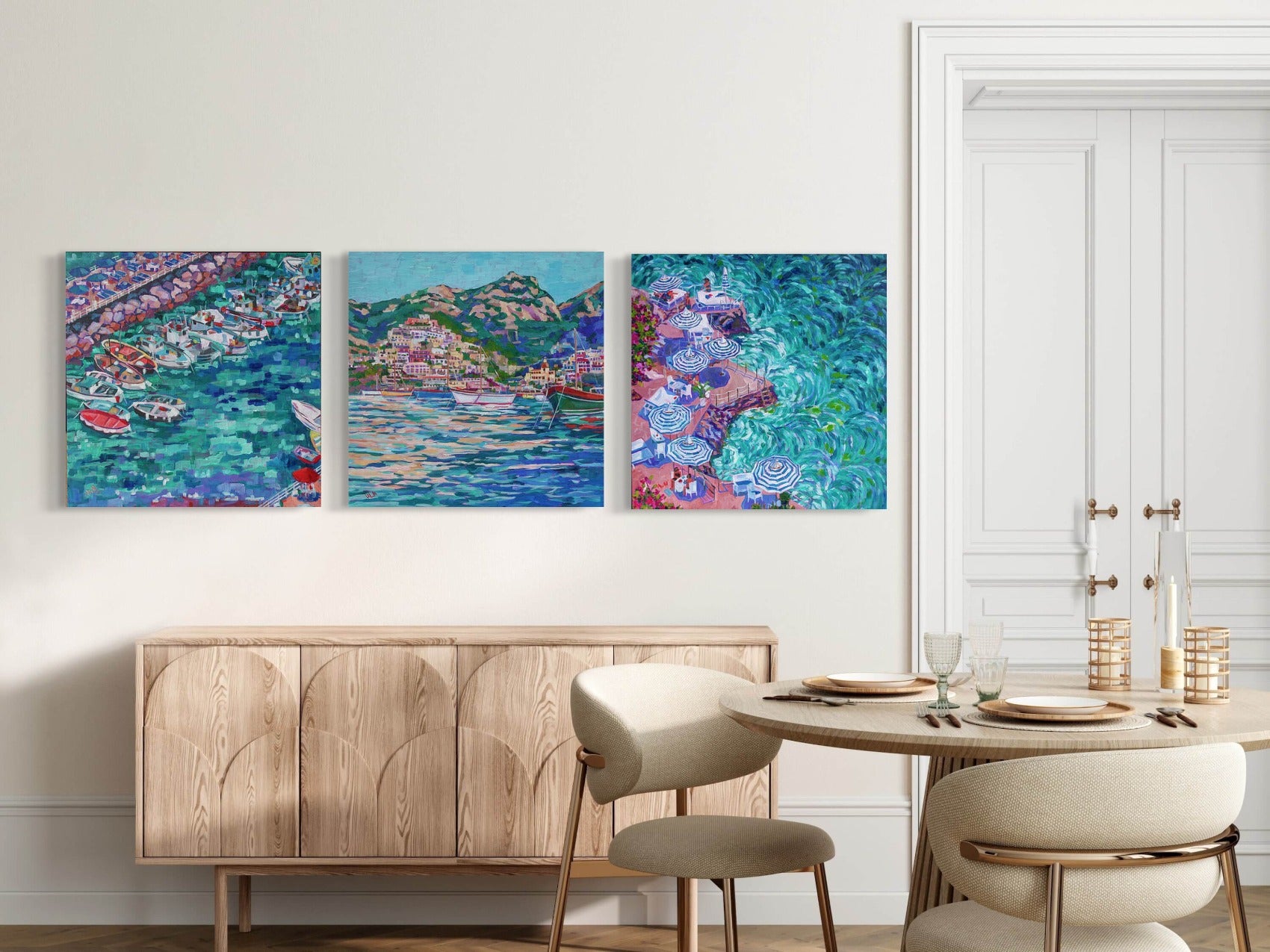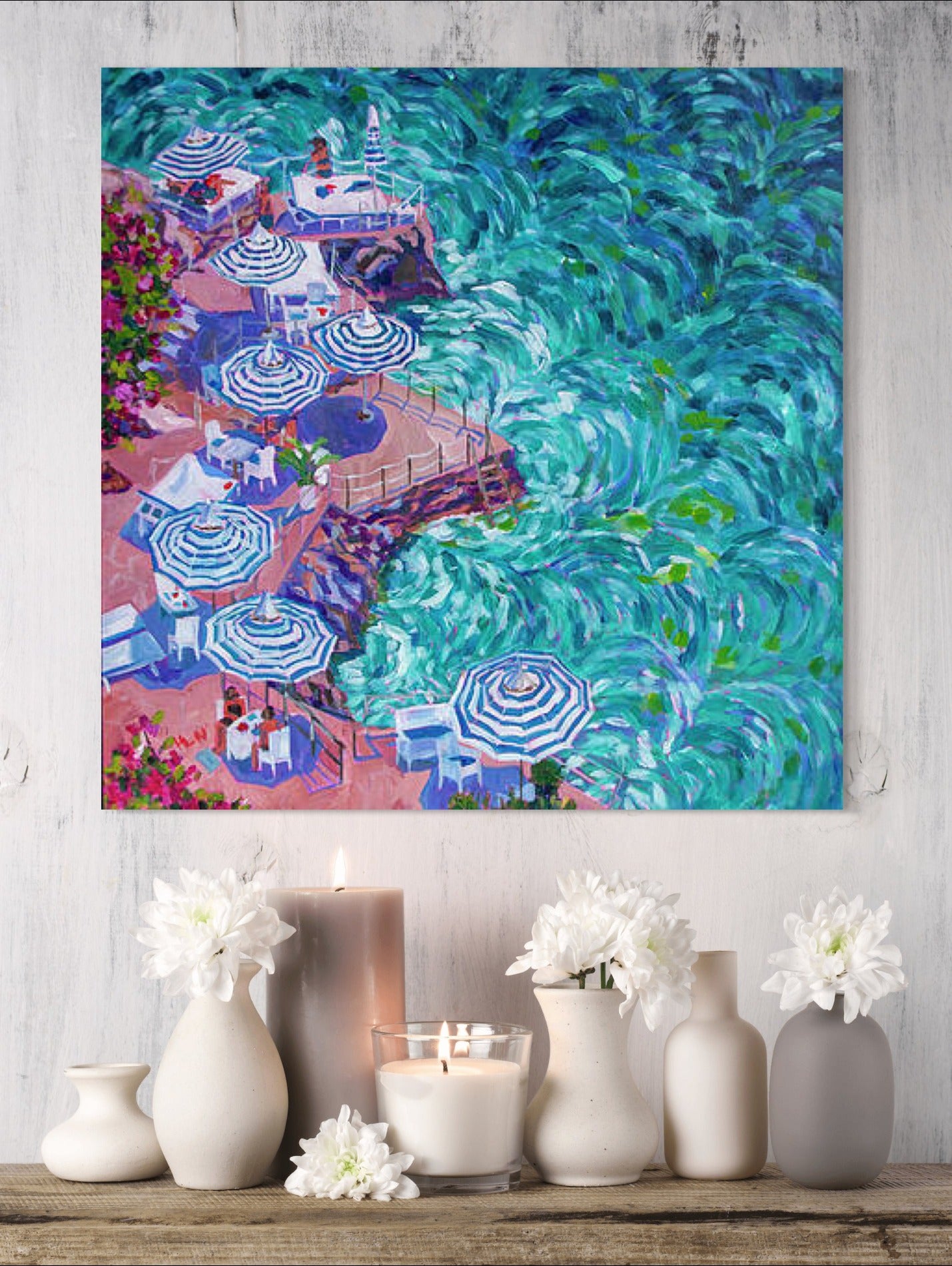 This original painting measures 24x24 inches and is an impressionist interpretation inspired by a scenic spot along the beach of Positano, Italy, nestled on the Amalfi Coast. Gazing down the hillside, one encounters the captivating blue-green hues of the Mediterranean sea complemented by vibrant umbrellas dotting the shoreline.