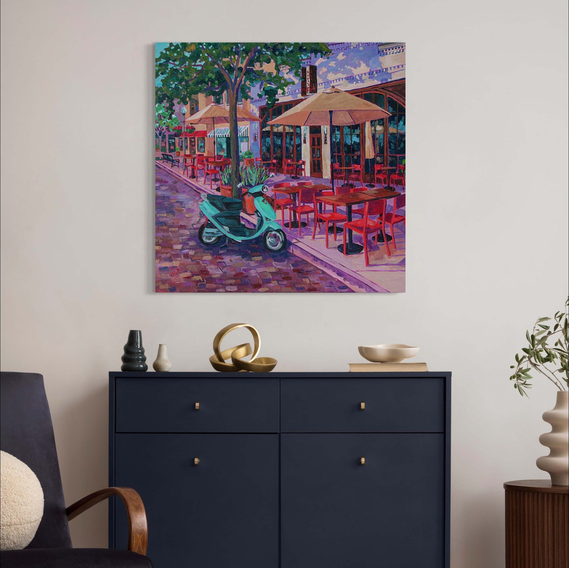 This original 30x30-inch acrylic painting on gallery-wrapped canvas captures a vibrant, small-town scene inspired by Prato Restaurant on Park Ave in Winter Park. The painting features beautiful red chairs and umbrellas, with a lone Vespa standing by, all waiting for the return of fellowship, good food, and meaningful conversations.